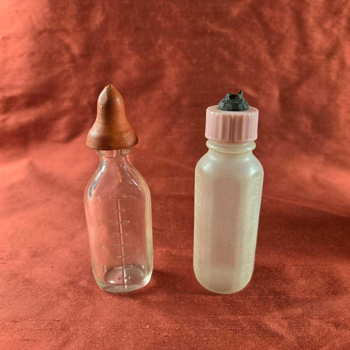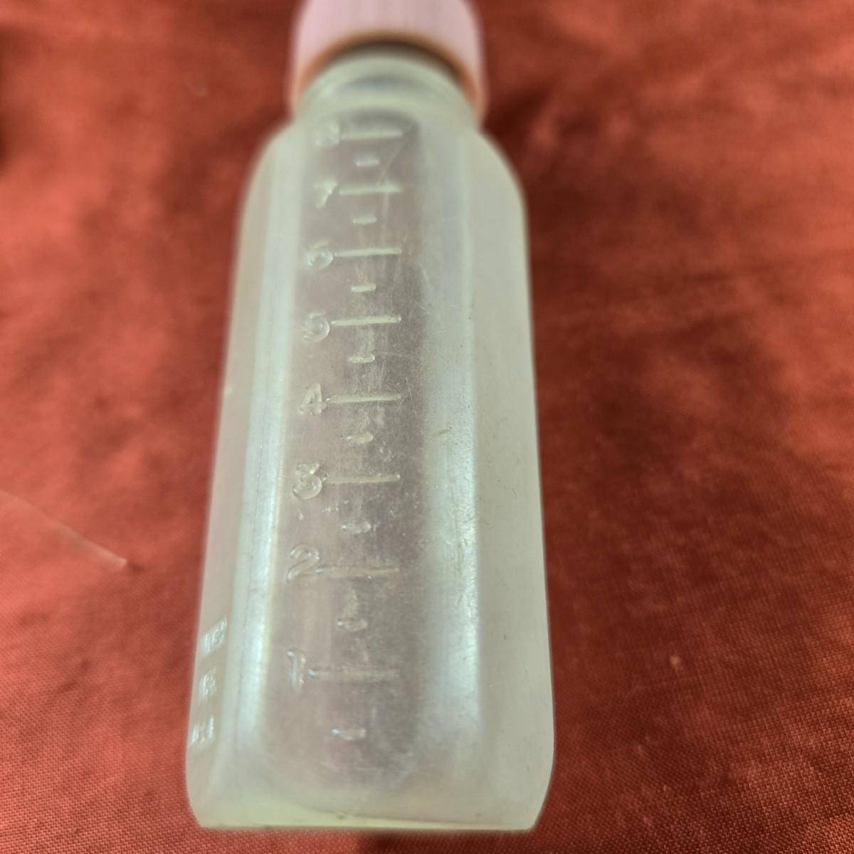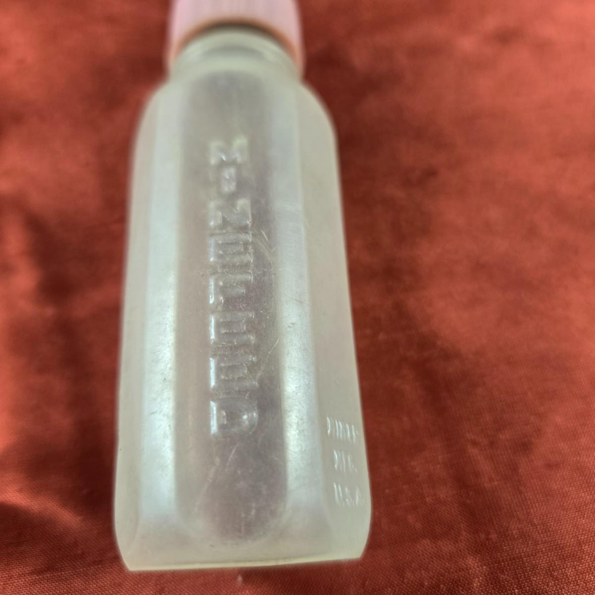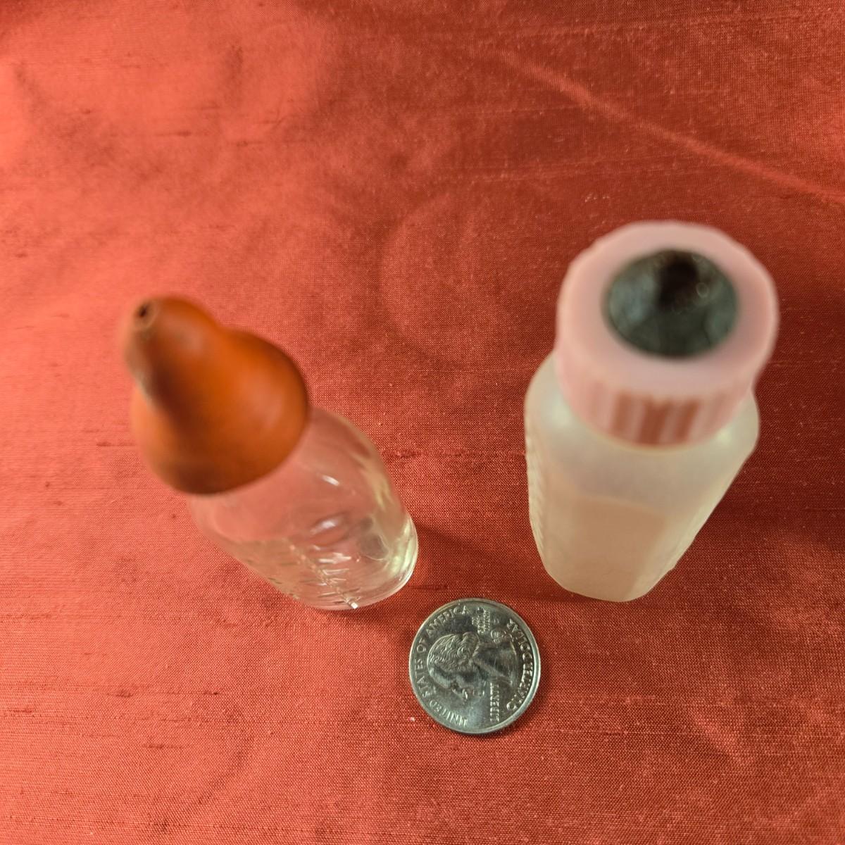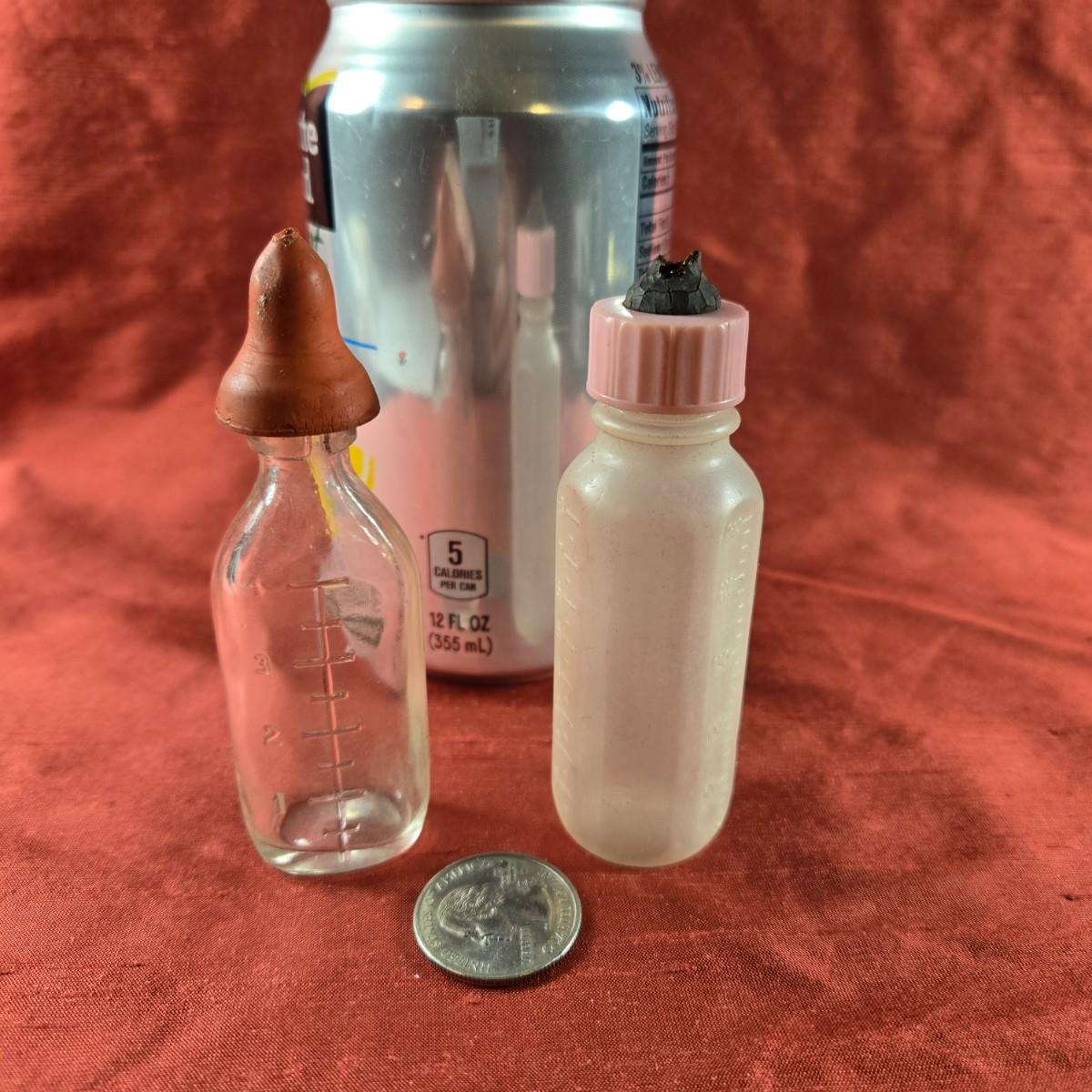 This auction lot is for a Pair of Vintage Baby Doll Baby Bottles. These bottles are very vintage and great for a doll collector. One is glass and the other is plastic.. Both have measures on the sides and are in used condition. They are approximately 3.5 inches tall.