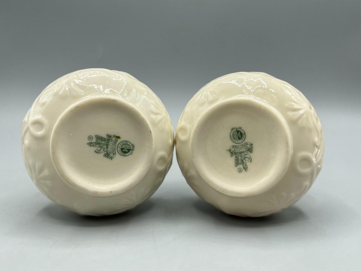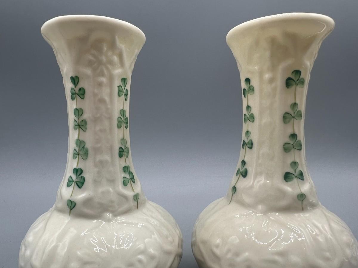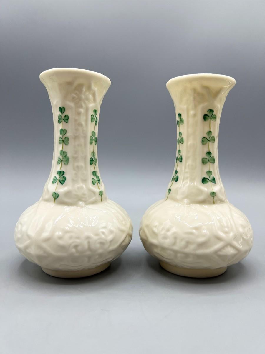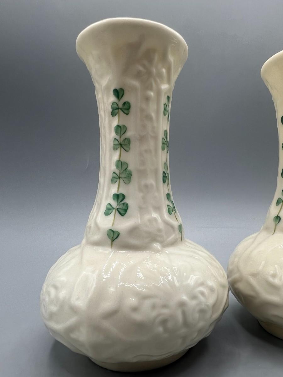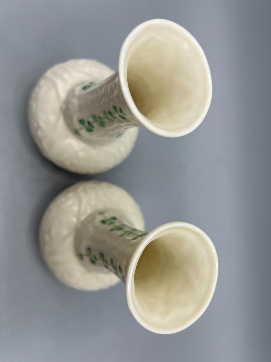 Pair of Vintage Belleek Ireland Shamrock Clover Bud Flower Vases