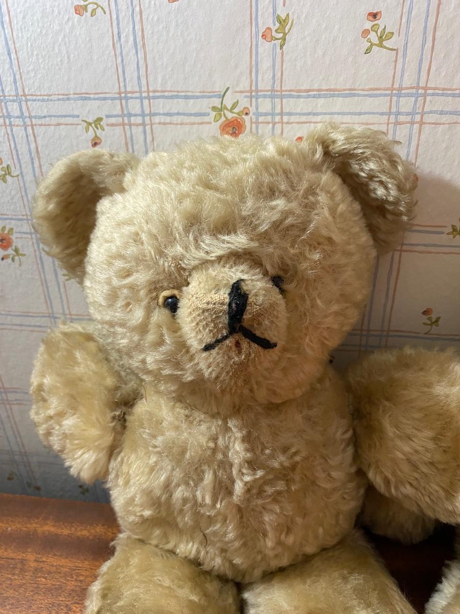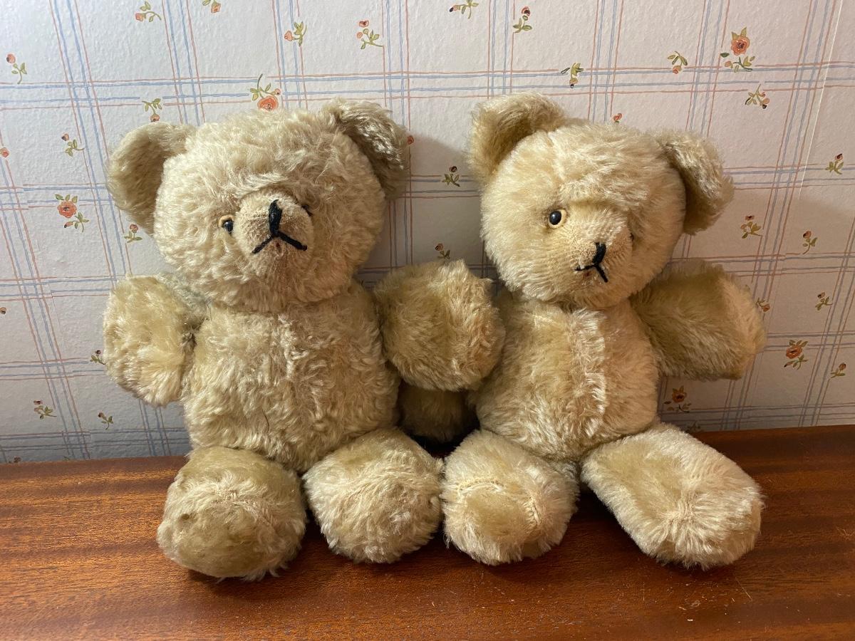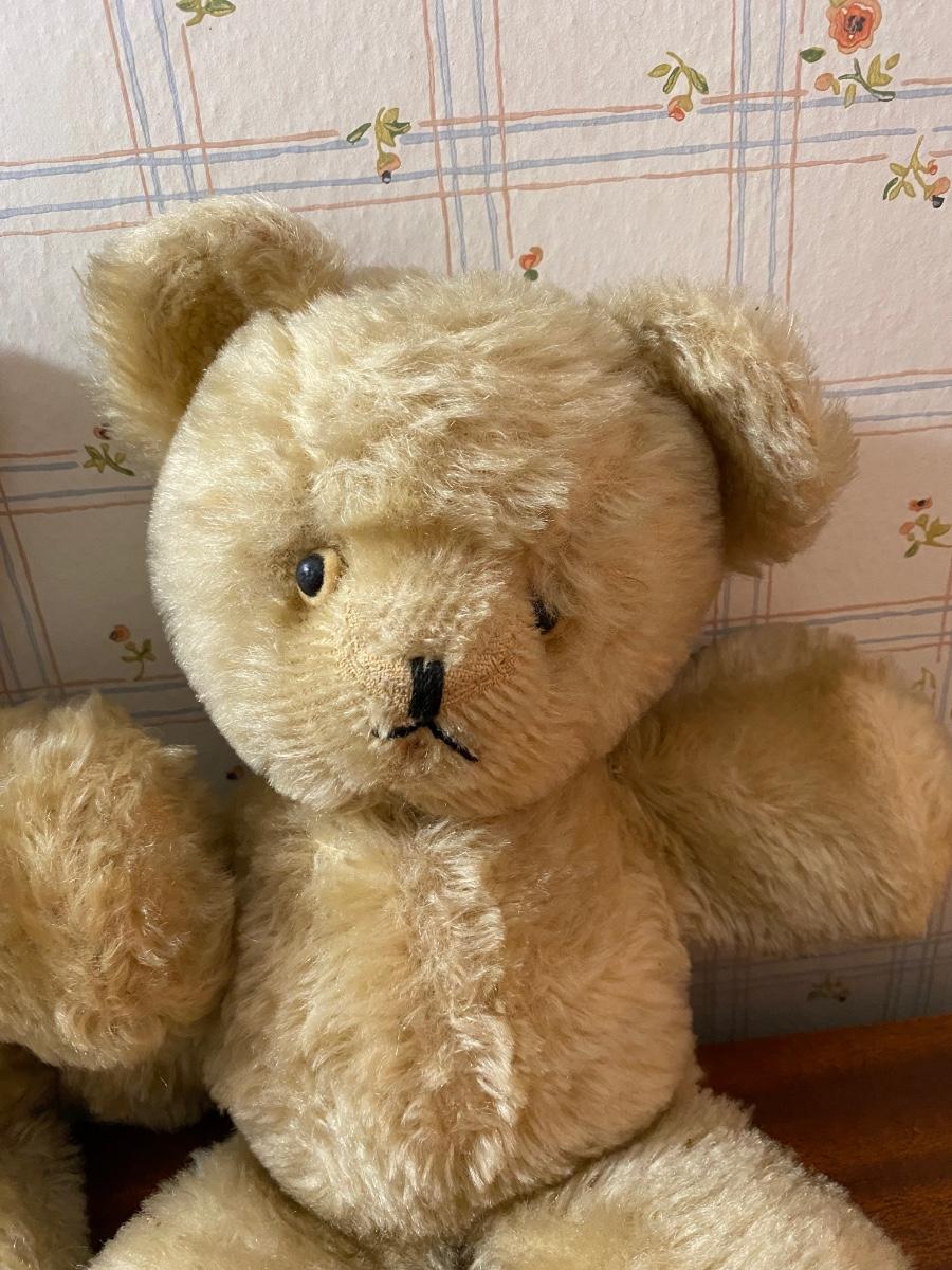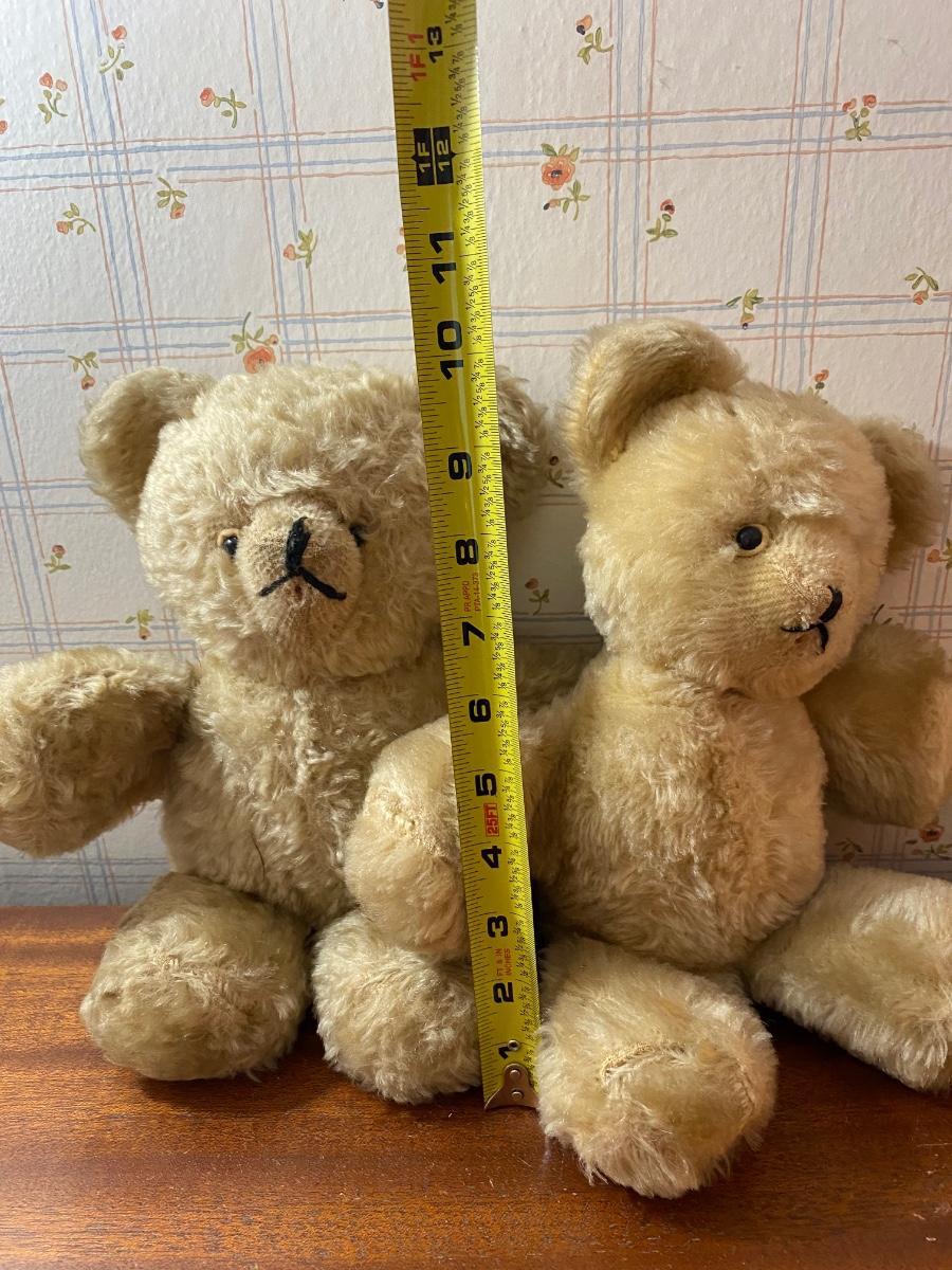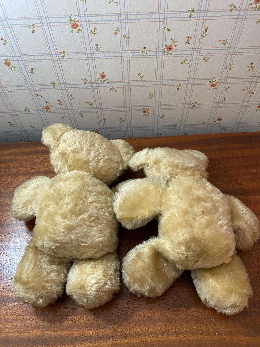 Pair of Vintage Blonde Mohair Teddy Bears Stuffed Plush Animals. In well-loved condition. No stains but some thin spots in fur from age.