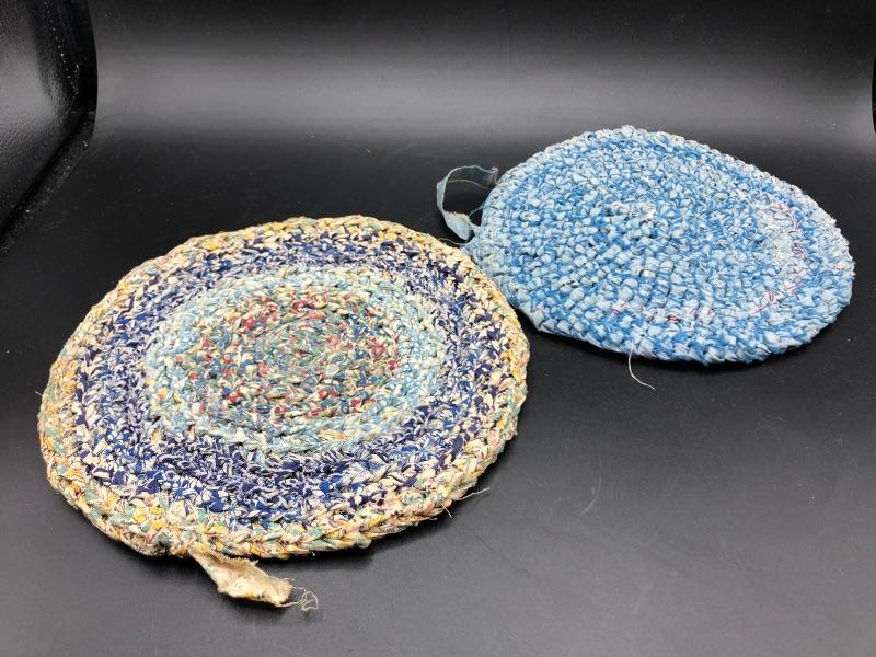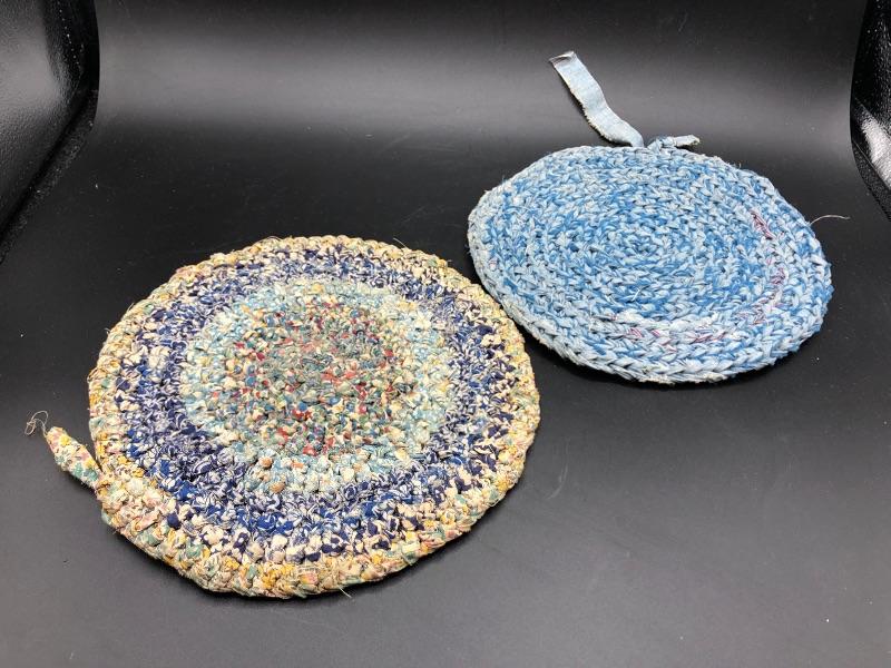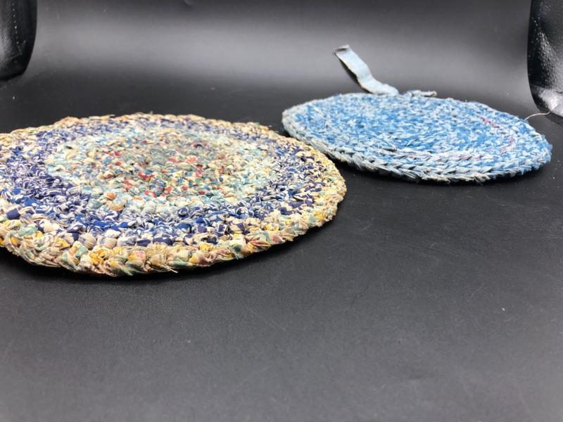 Vintage braided table coaster. One in blue and the other is multicolored. About 8" size.