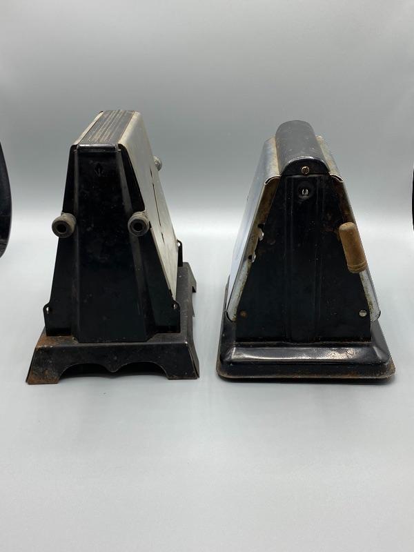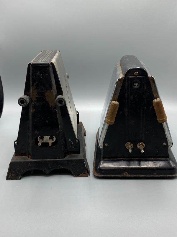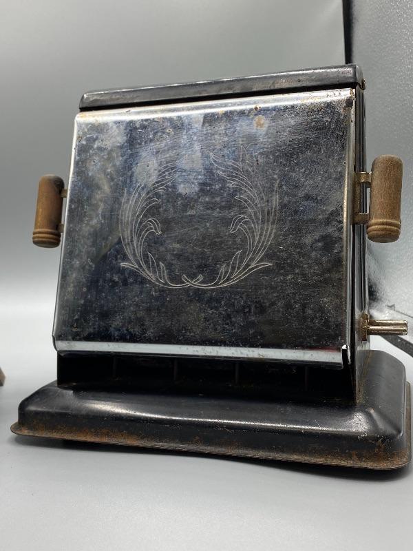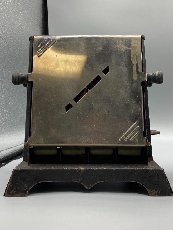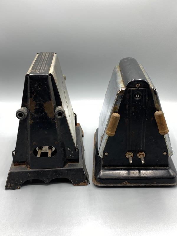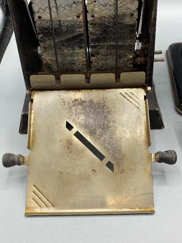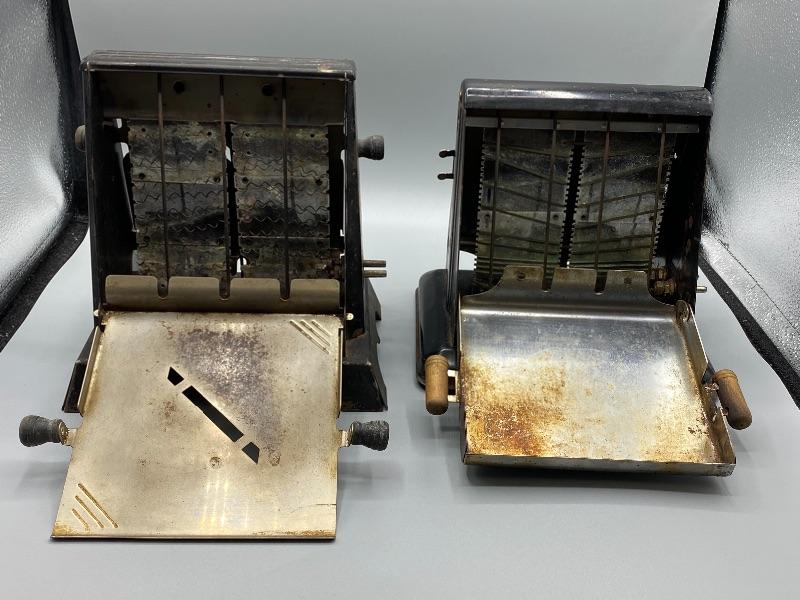 Pair of vintage toasters. Fold down sides. Electric but missing the cords. Have signs of use and rust. Great for display.