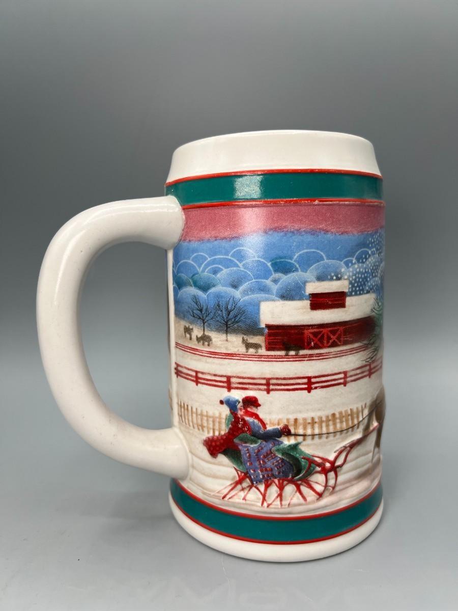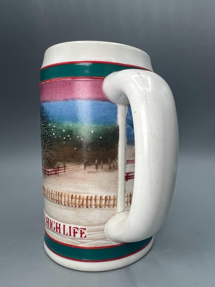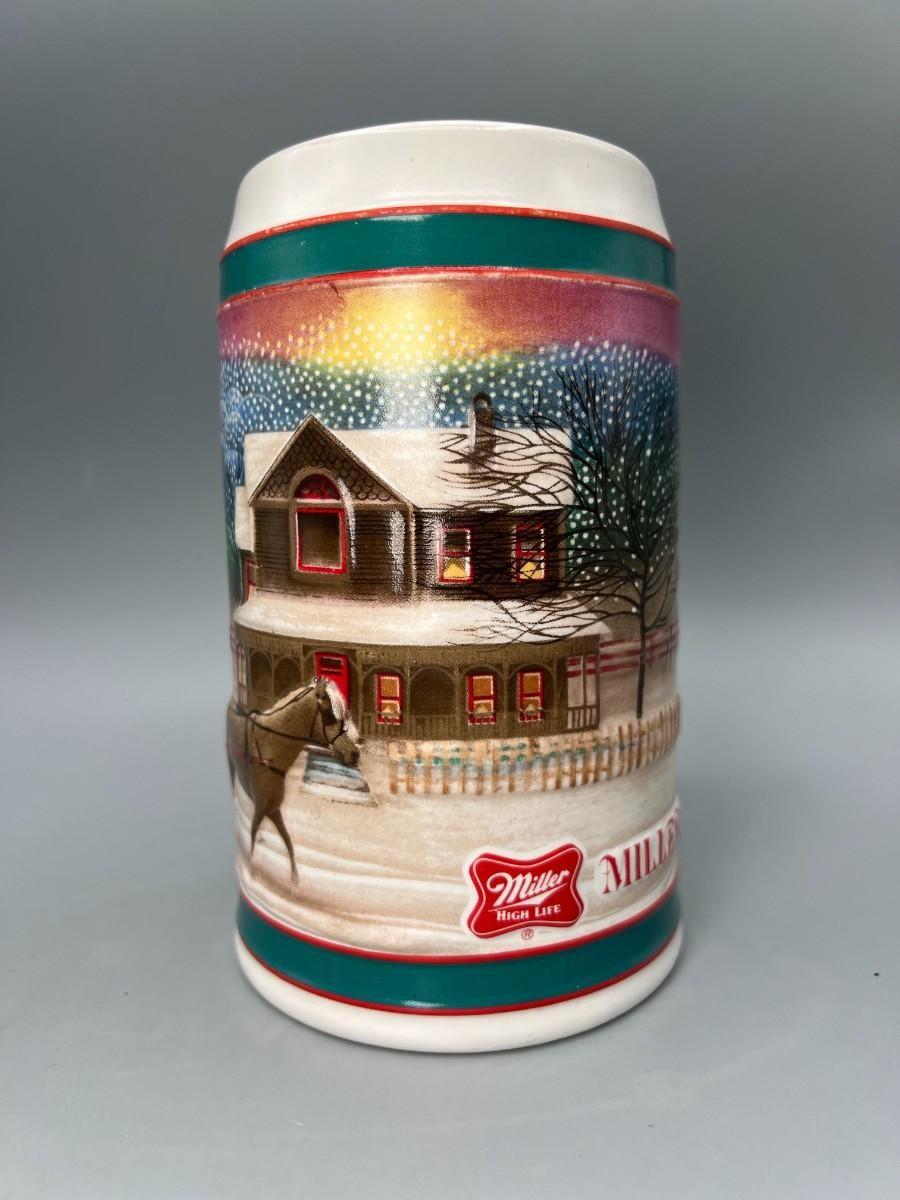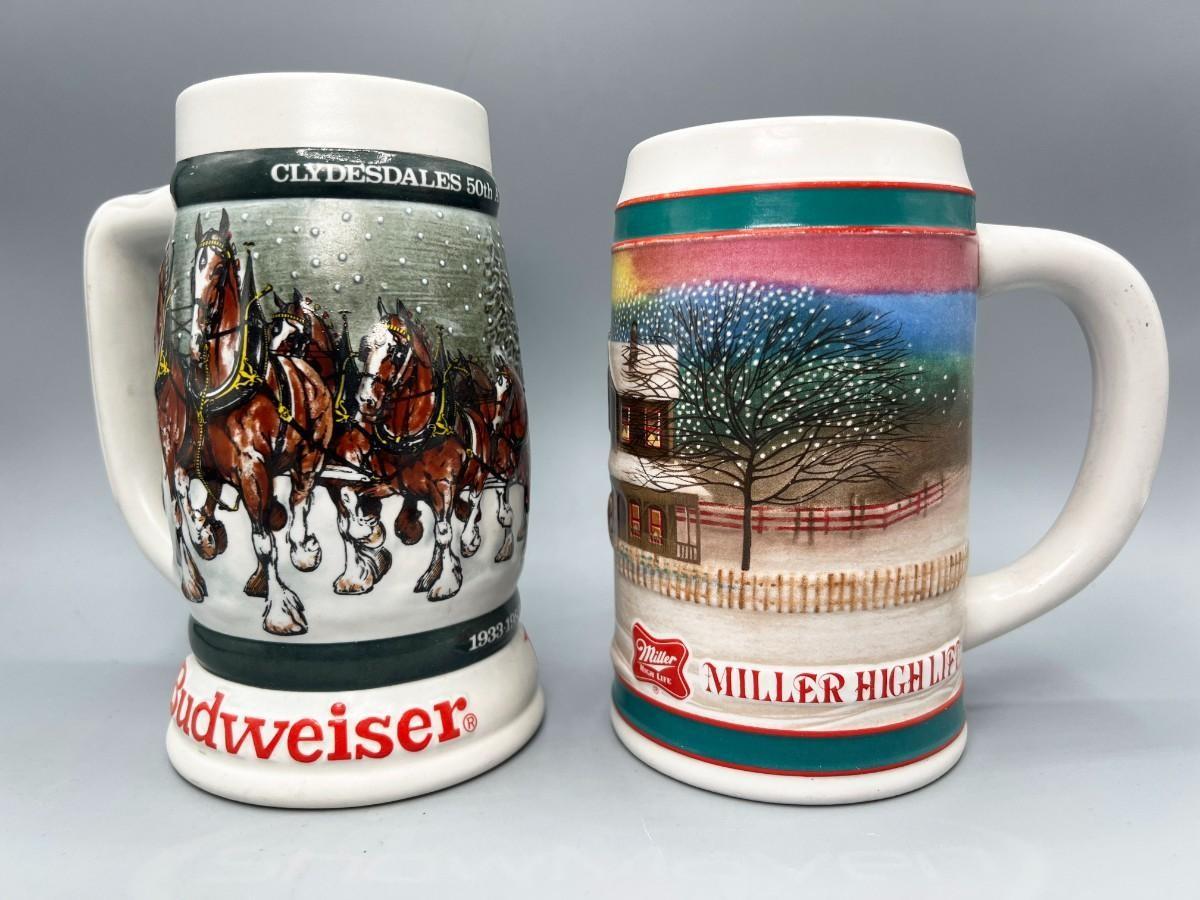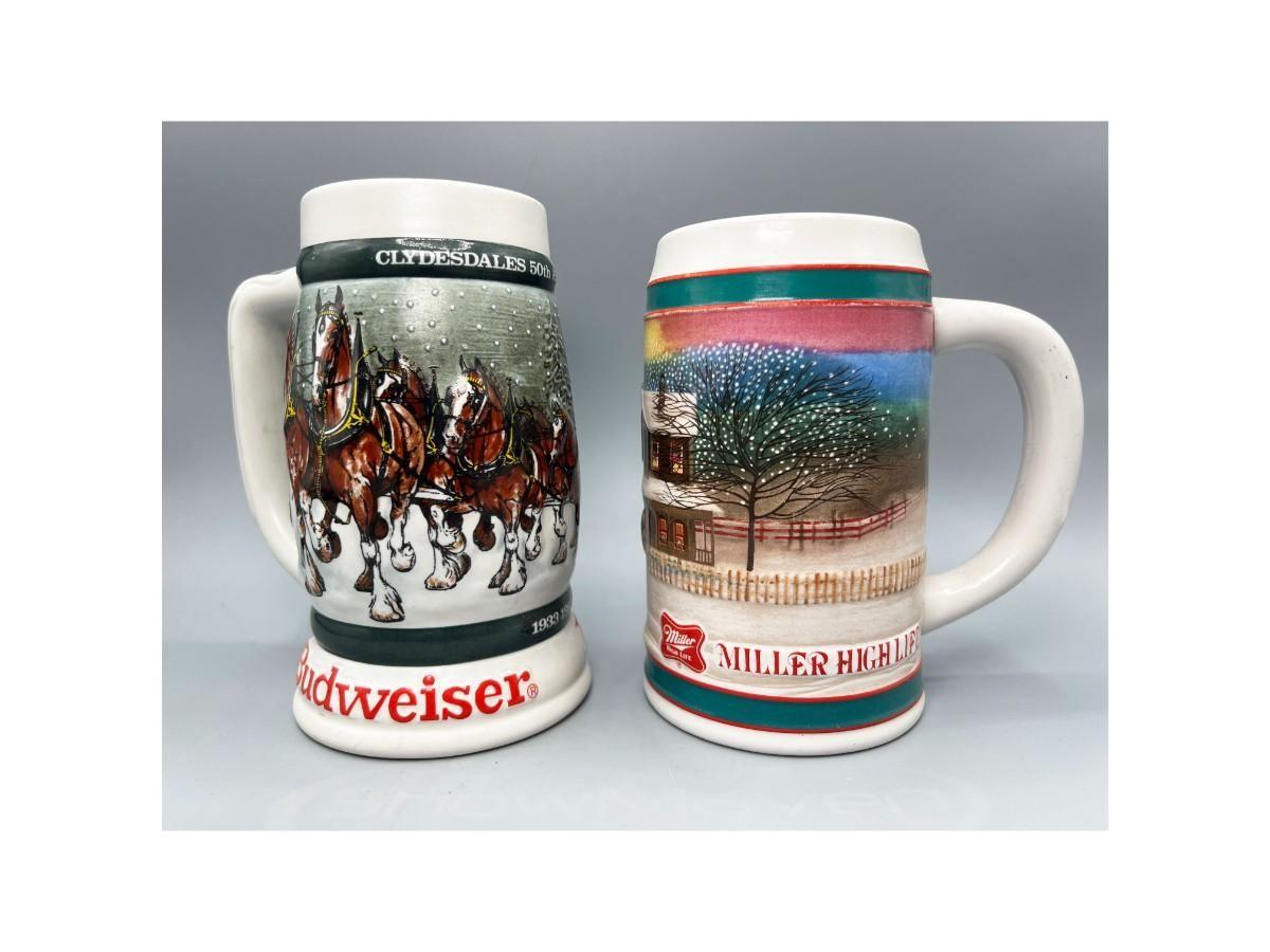 Pair of Vintage Budweiser Holiday Collectible Steins Clydesdale 50th Anniversary & Miller High Life Christmas Sled Stein