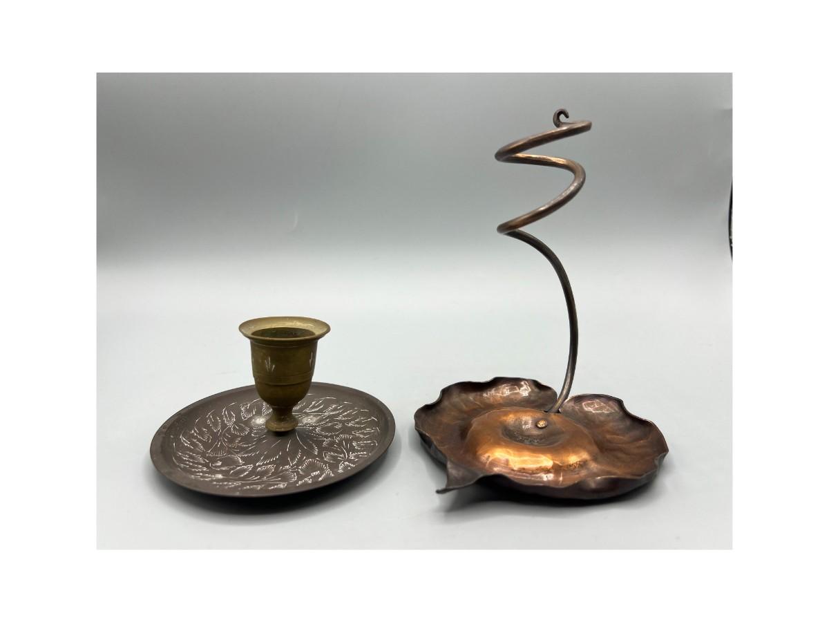 Pair of Vintage California Historical Design Craftsman Studios Copper Candle Holder 357 & Art Nouveau Styled Candle Holder, there is some light wear to the Art Noveau candle holder, but there is no significant damage to both pieces and is in good displayable condition. Check pictures for more details and for sizing