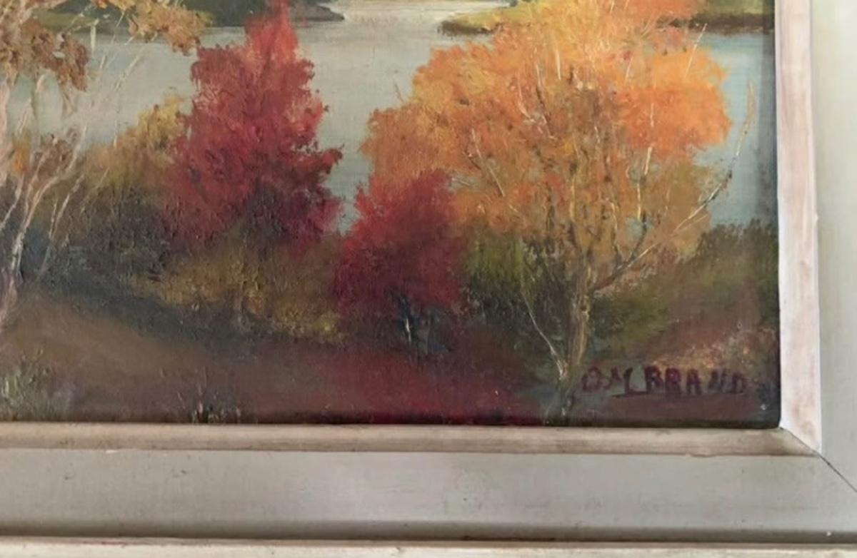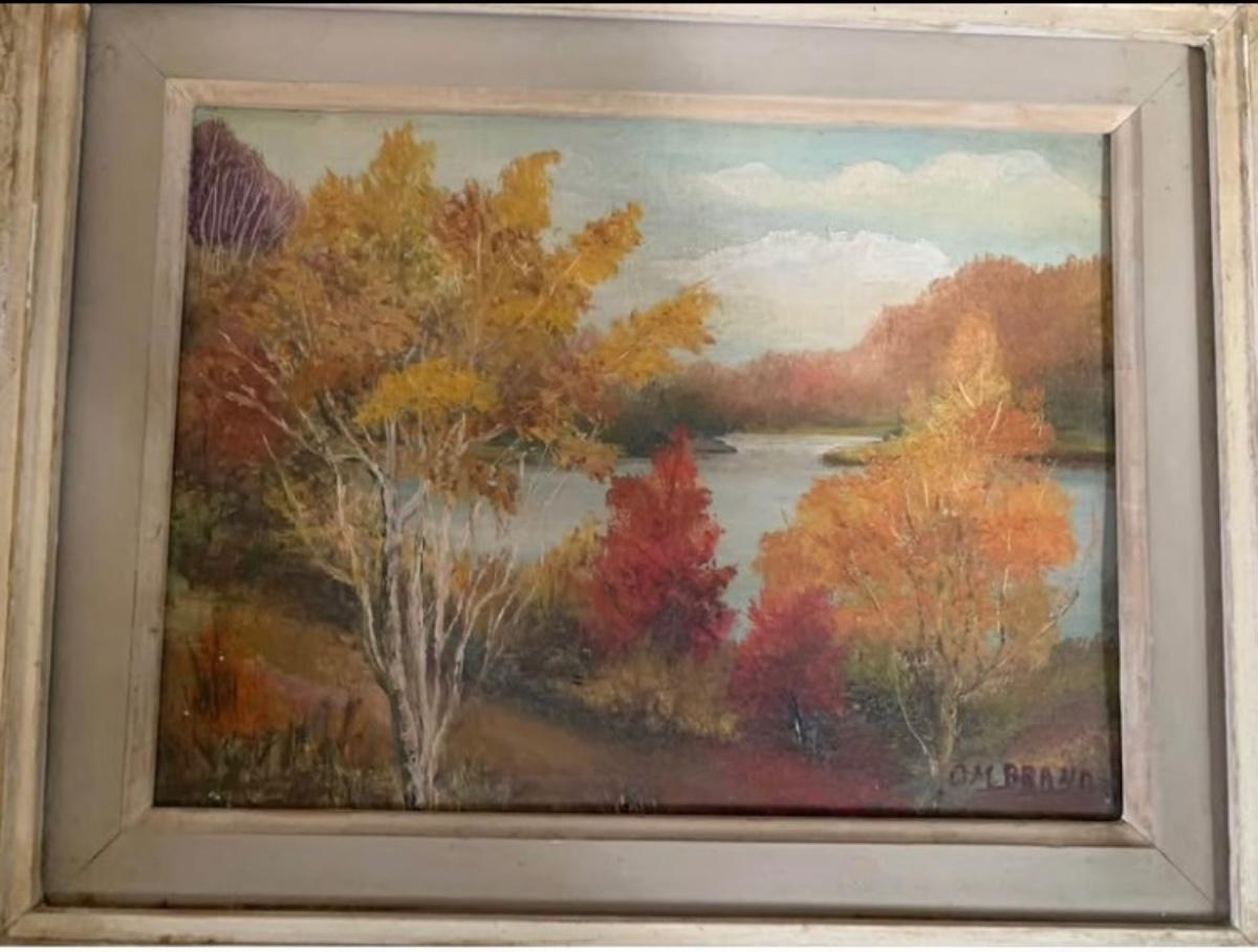 Canadian art, Canadian landscape, Hamilton Ontario art, vintage oil painting, autumn landscape, forest painting, lakeside painting, cottagecore wall décor, rustic décor, framed original art, mid-century oil painting, Olive M. Brand, O. M. Brand
