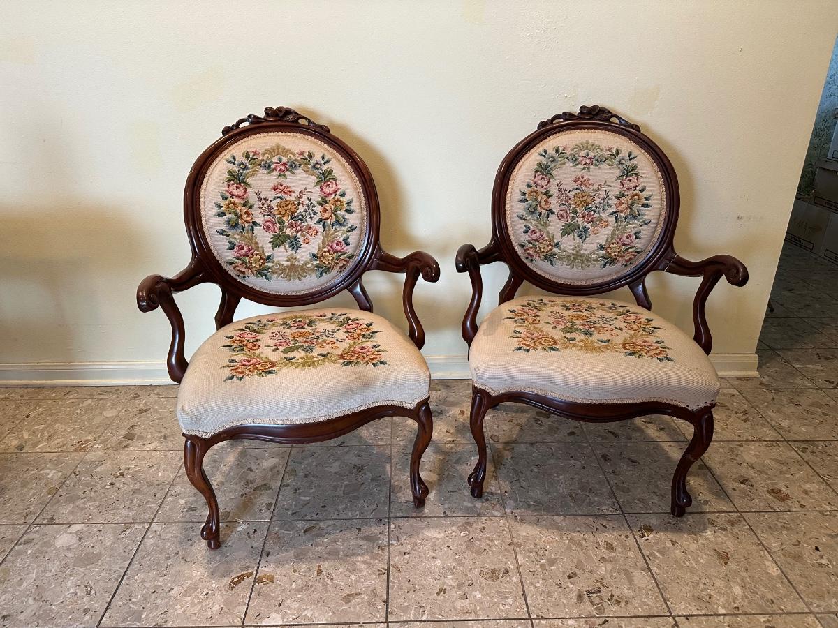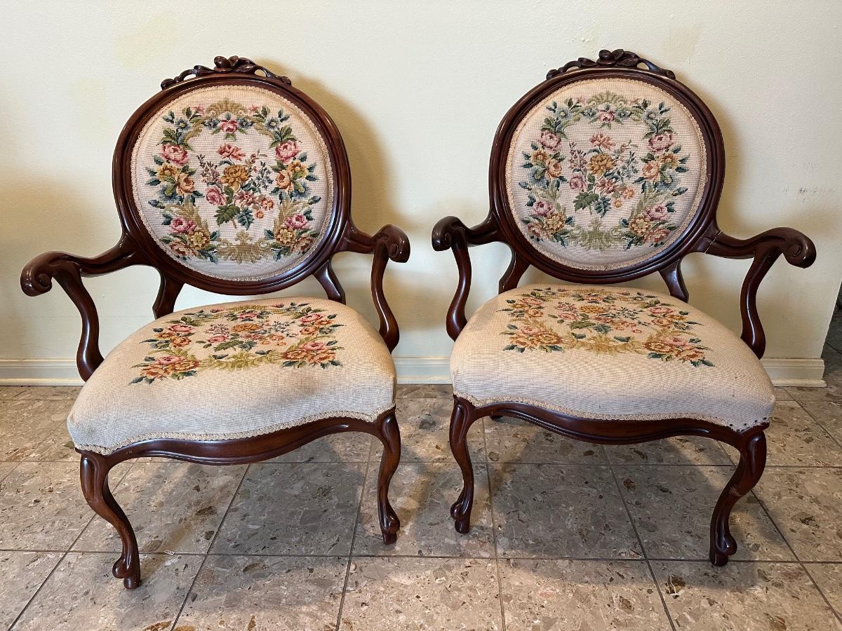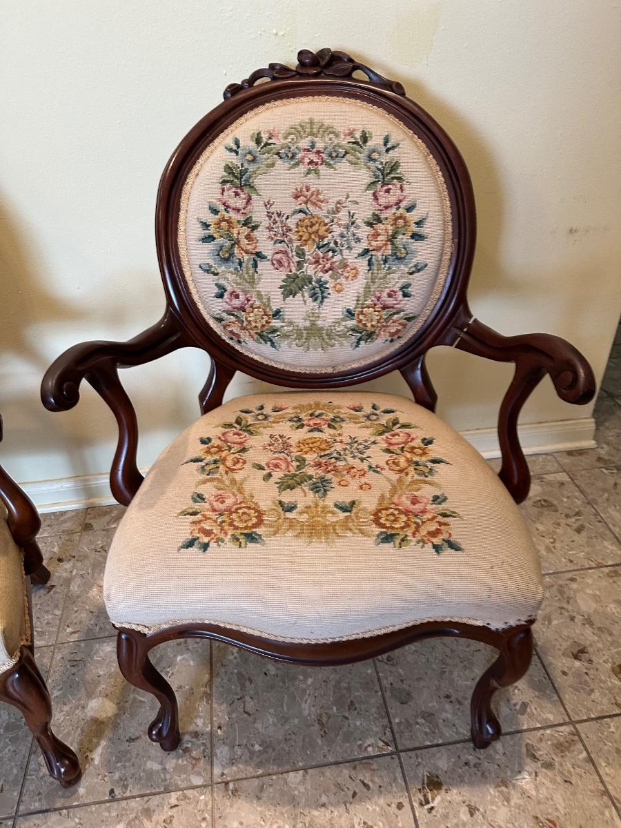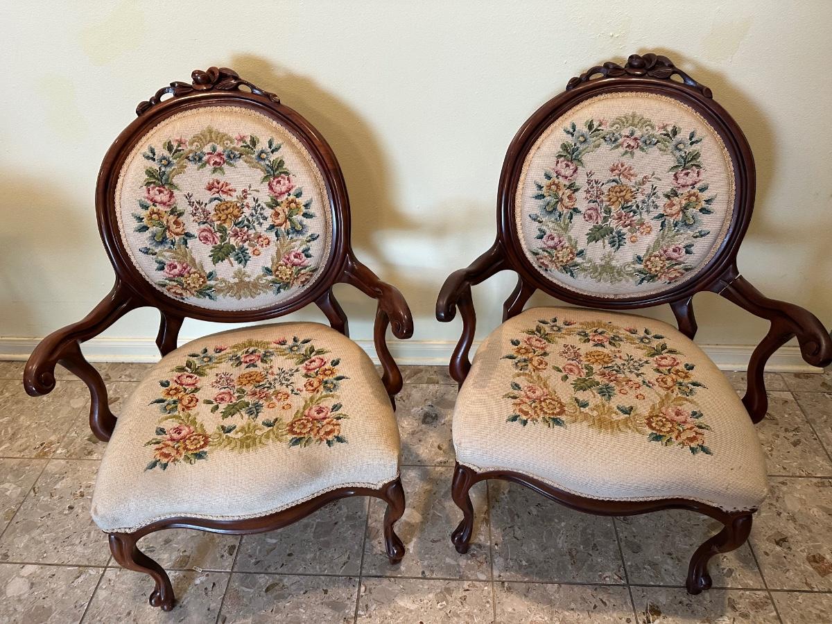 Pair of vintage carved wood armchairs with floral tapestry-style upholstery. Both show wear and staining to fabric, and one has a visible split at the arm joint (see photos). Sturdy overall with elegant carved frames.