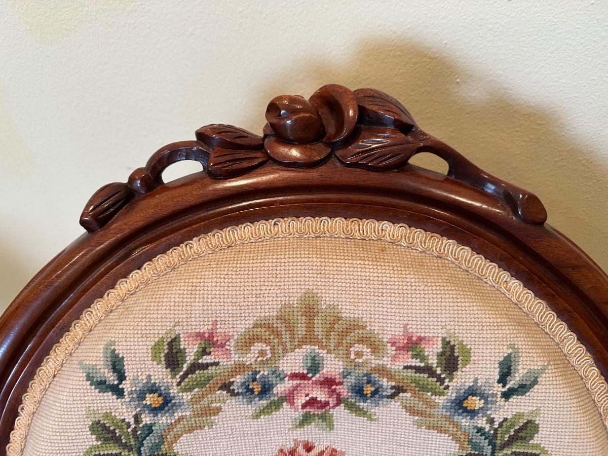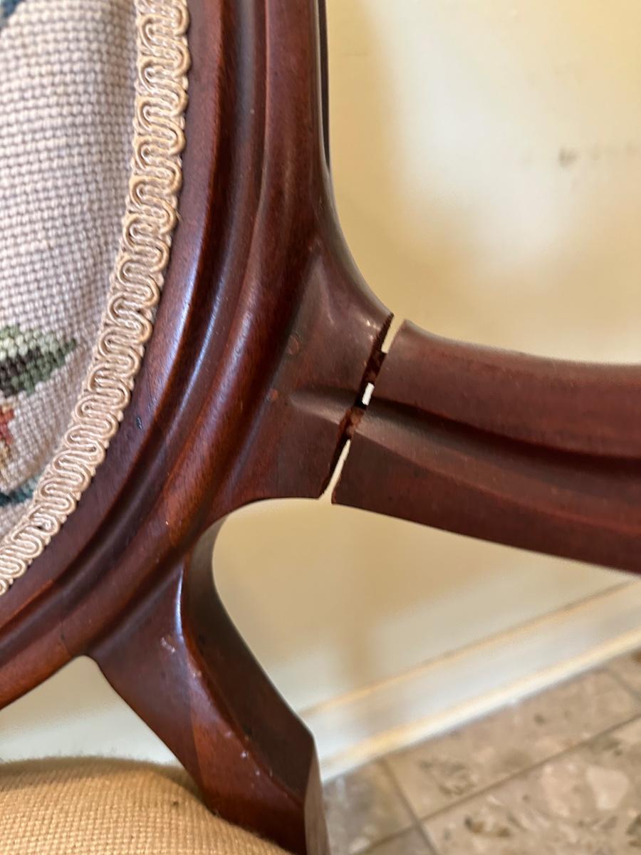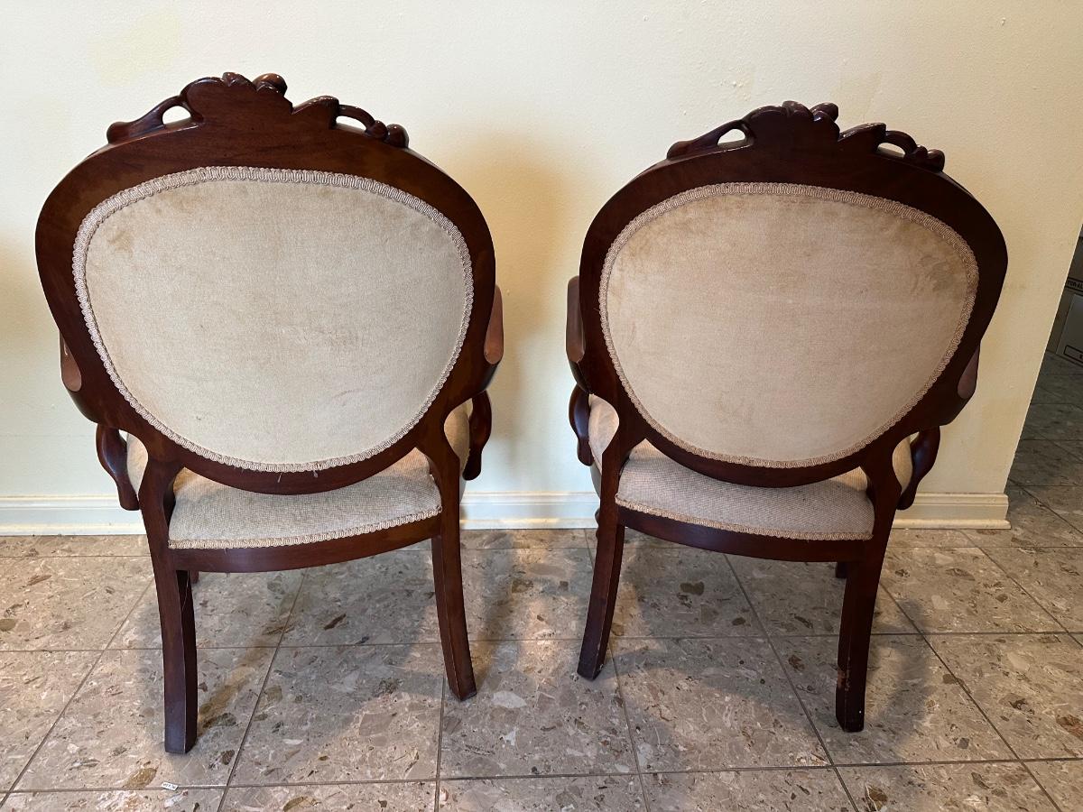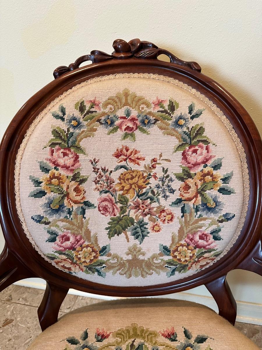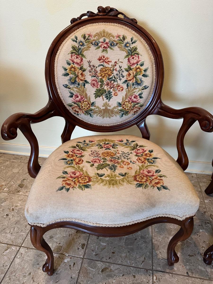 Pair of vintage carved wood armchairs with floral tapestry-style upholstery. Both show wear and staining to fabric, and one has a visible split at the arm joint (see photos). Sturdy overall with elegant carved frames.