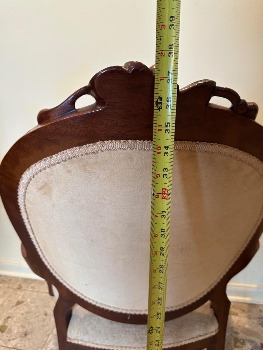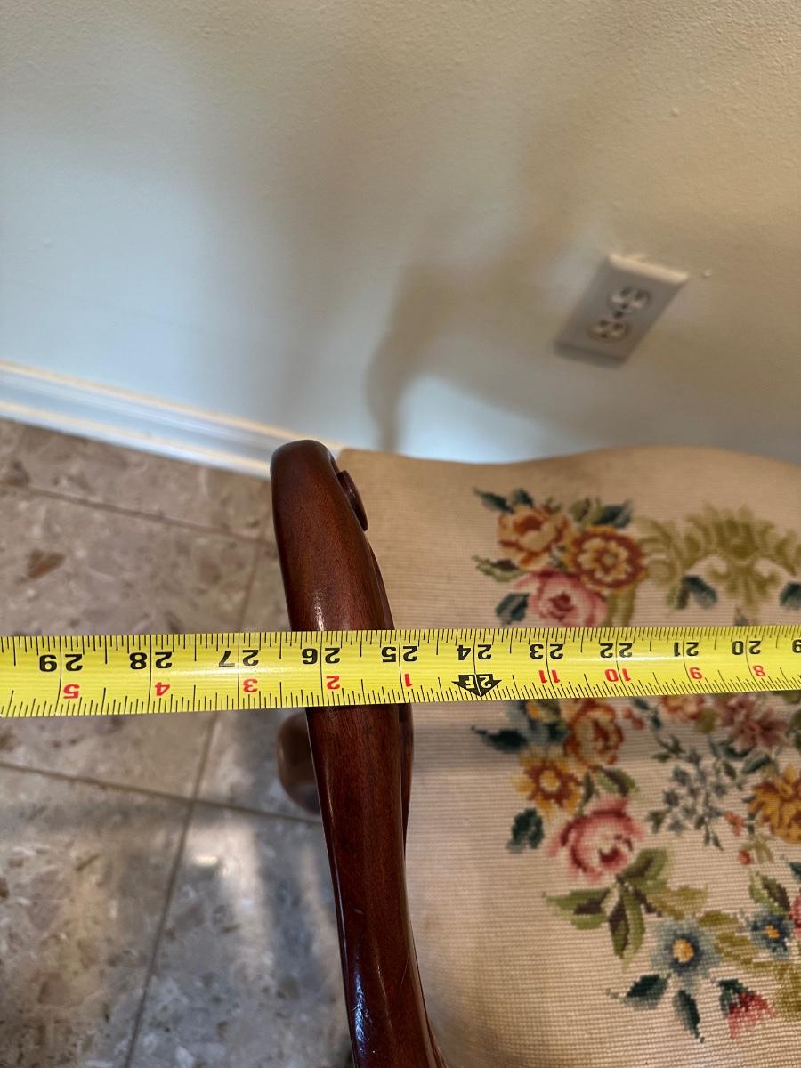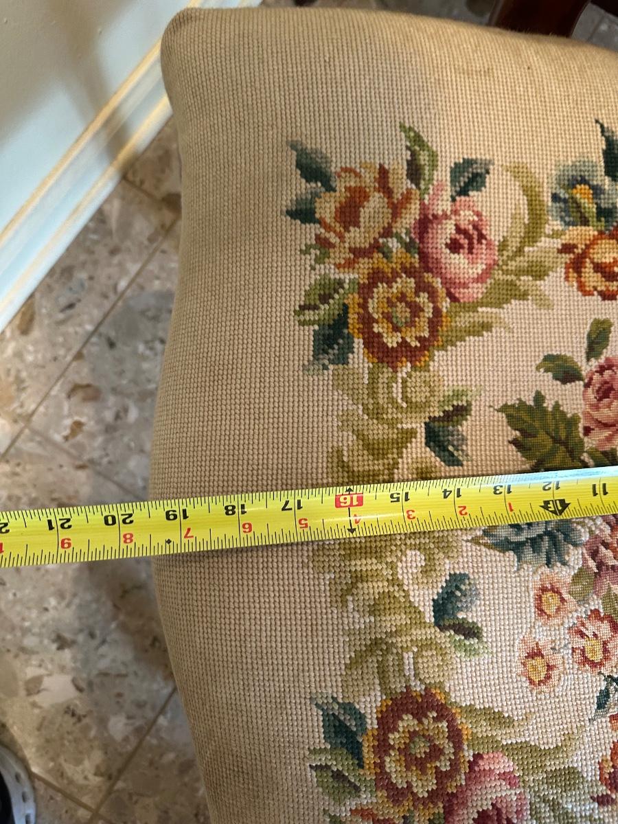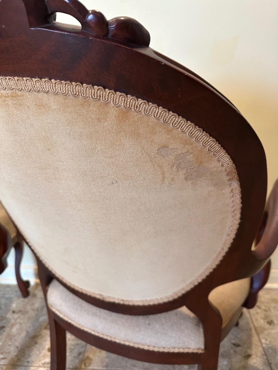 Pair of vintage carved wood armchairs with floral tapestry-style upholstery. Both show wear and staining to fabric, and one has a visible split at the arm joint (see photos). Sturdy overall with elegant carved frames.