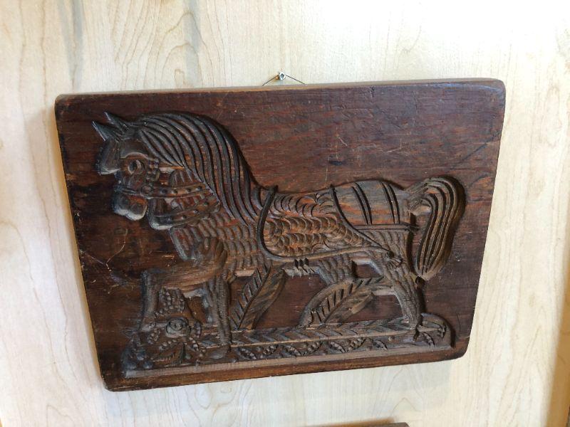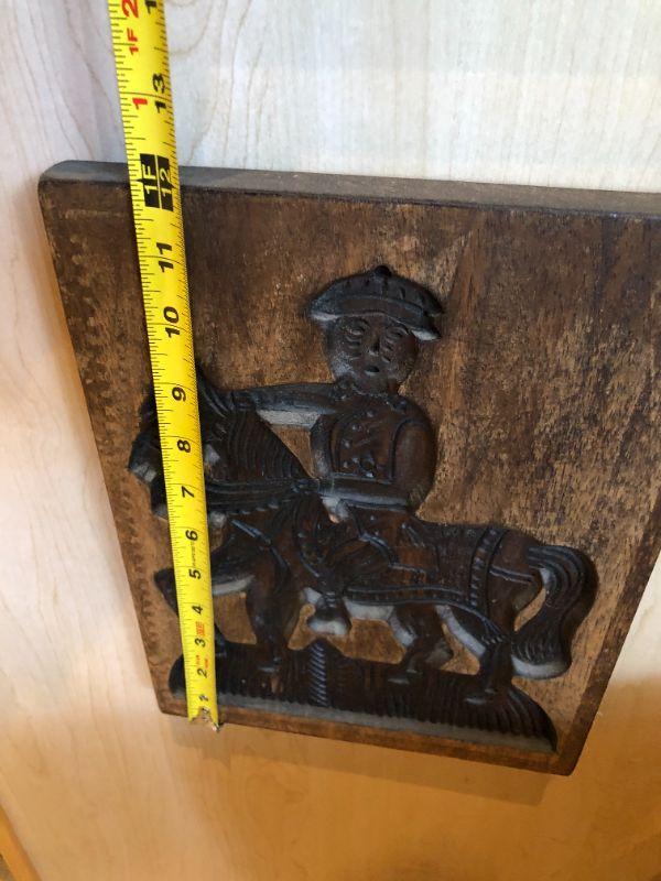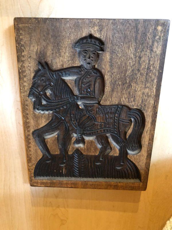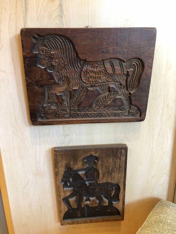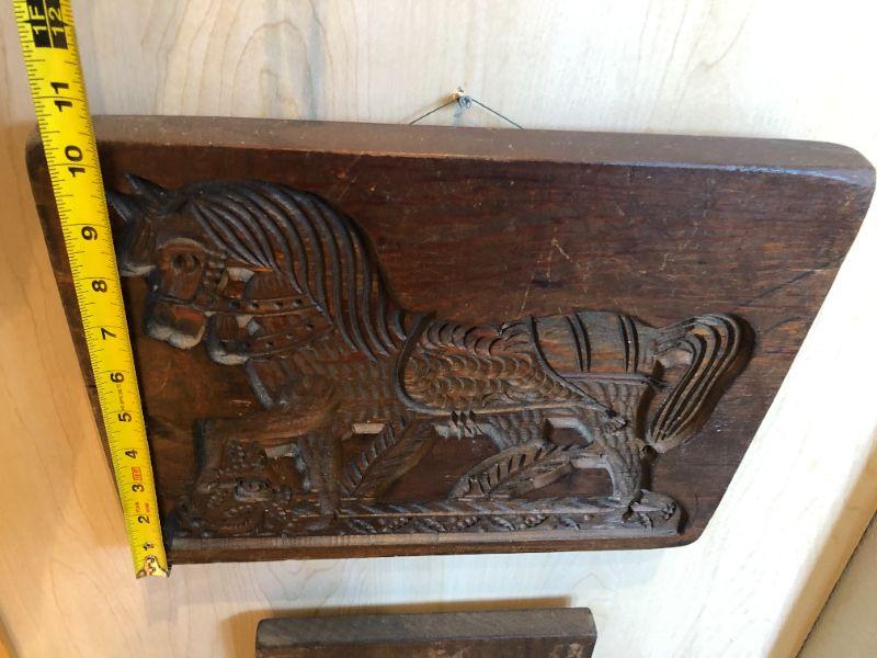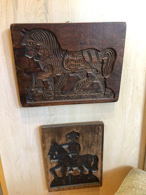 Great pair of vintage carved wood blocks, featuring a horse and a horseback rider. In very good condition.