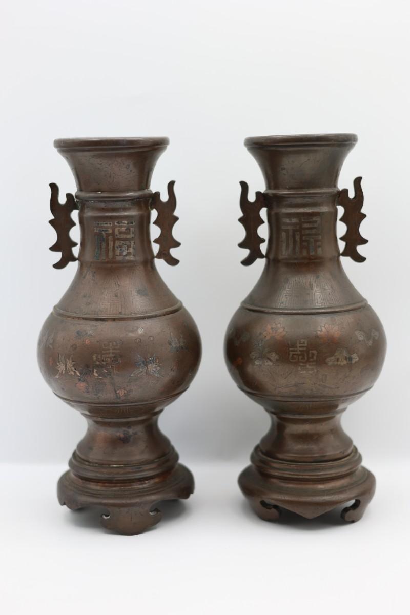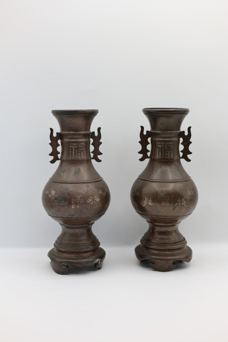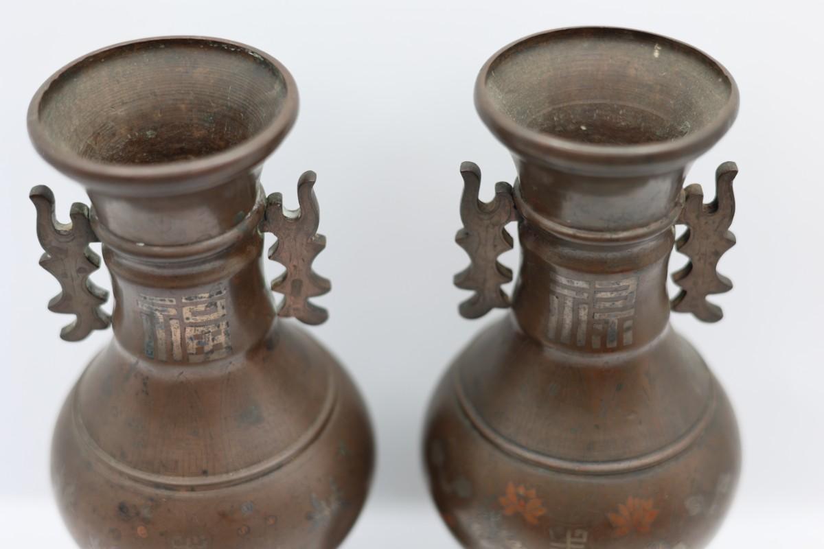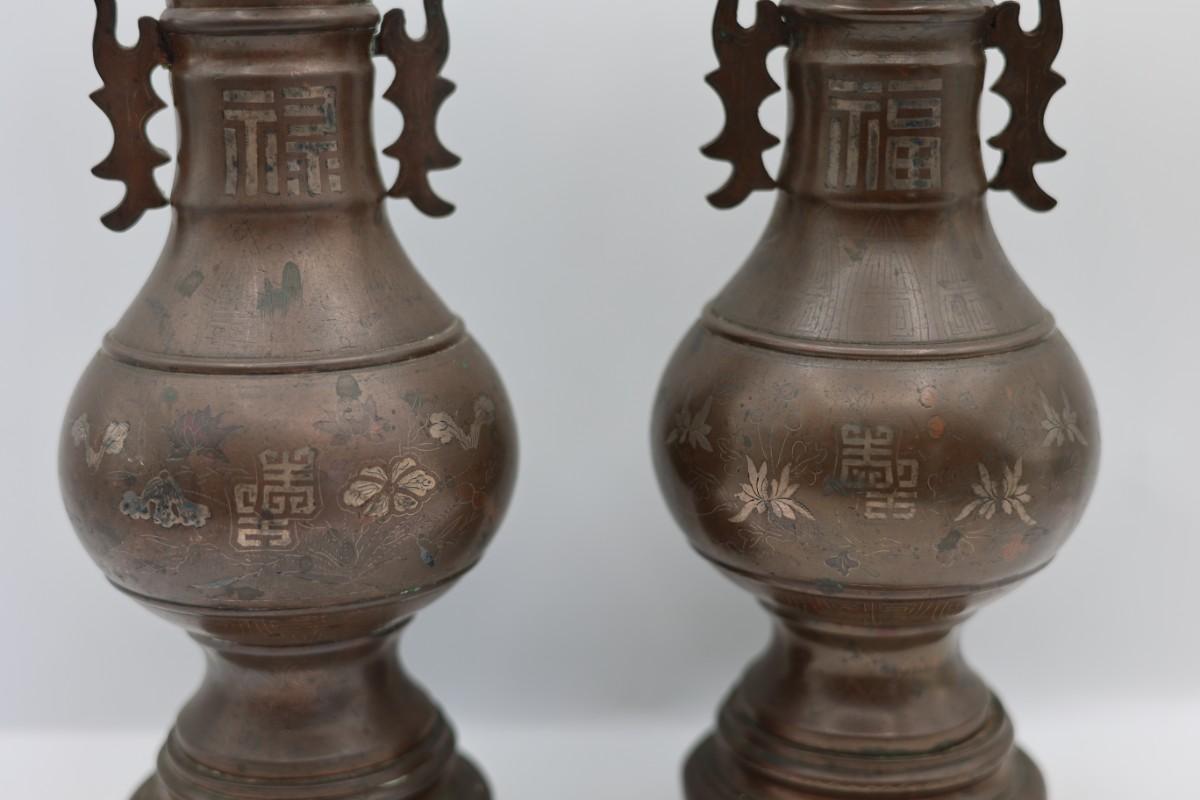 Vintage cast bronze vases with engraved and mixed-metal inlaid longevity and floral motifs. Stylized archaistic side handles. Warm patina with age-related wear.