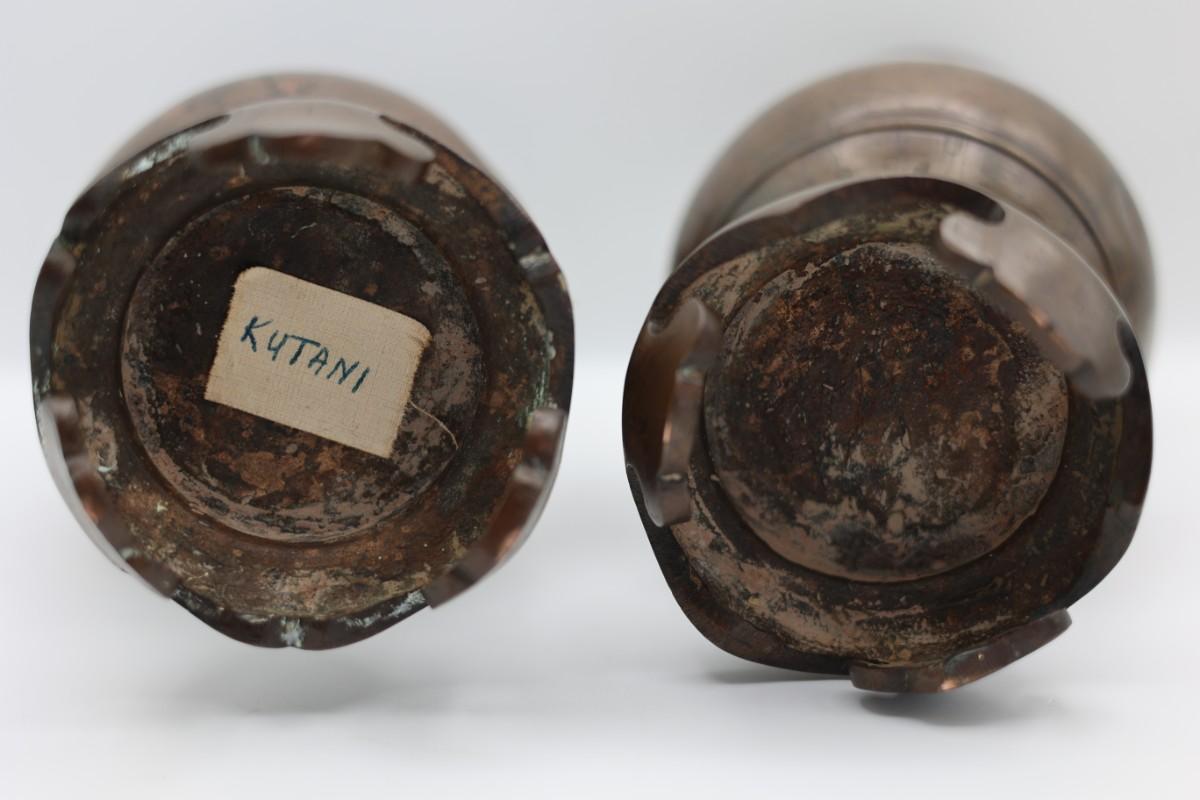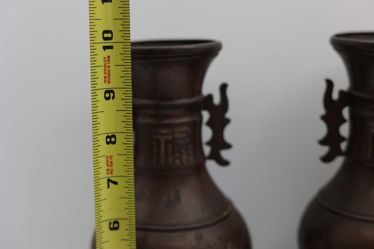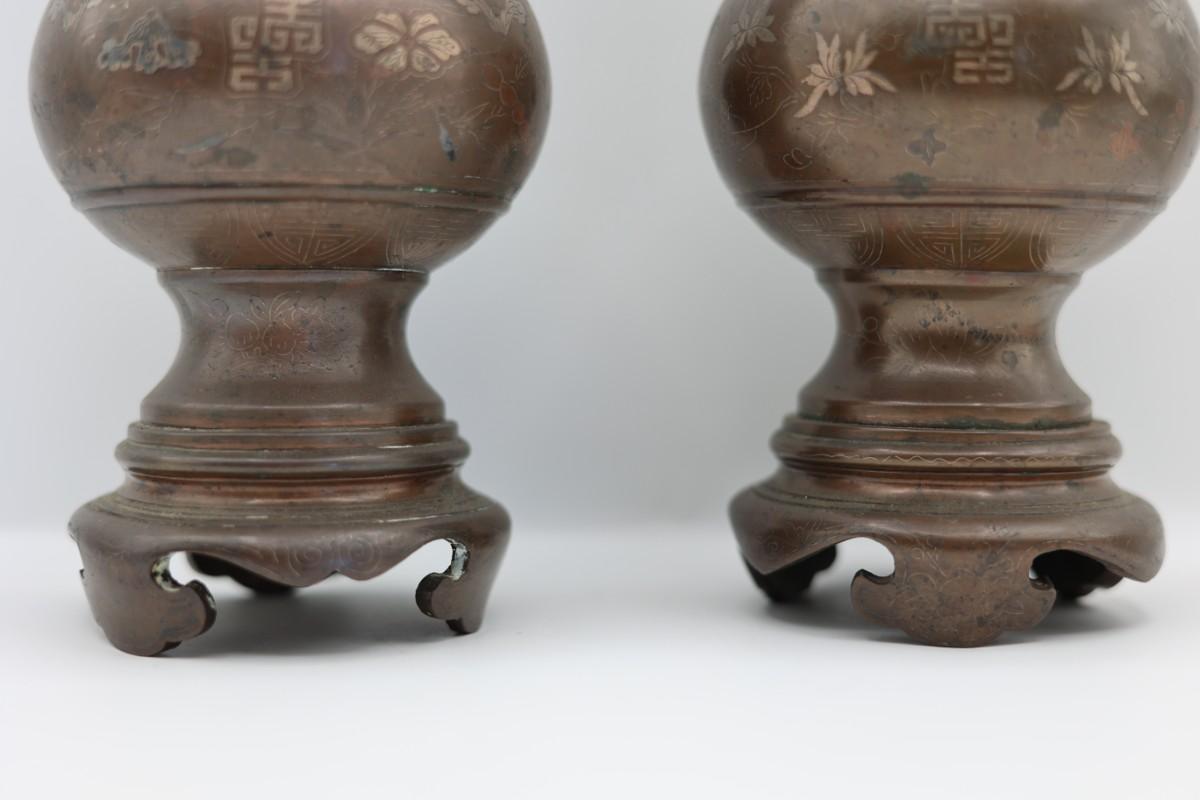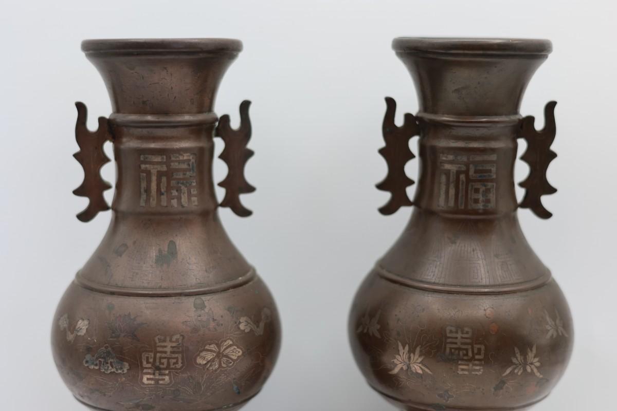 Vintage cast bronze vases with engraved and mixed-metal inlaid longevity and floral motifs. Stylized archaistic side handles. Warm patina with age-related wear.