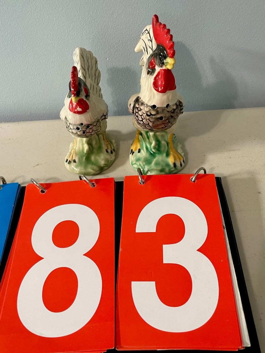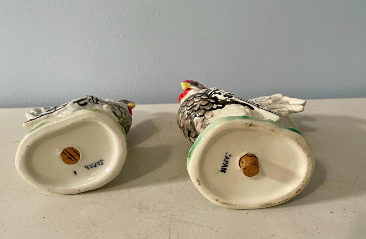 Pair of vintage ceramic rooster + hen salt & pepper shakers