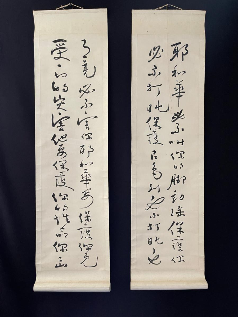 DESCRIPTION: This pair of scrolls are each detailed with two vertical lines of boldly rendered calligraphic characters artfully arranged to fill the length and width of the scroll.
