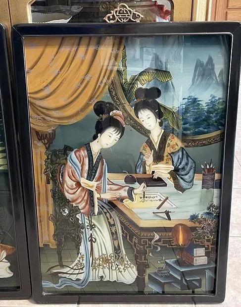 Pair of Vintage Chinese Reverse Glass Paintings 19.5" x 27.25" Preowned from an Estate Cleanout in VG Condition. (Free Local Pickup Only in Berlin, NJ 08009)