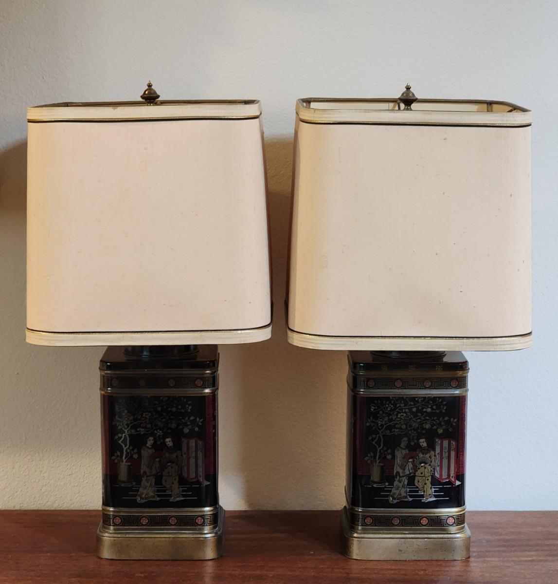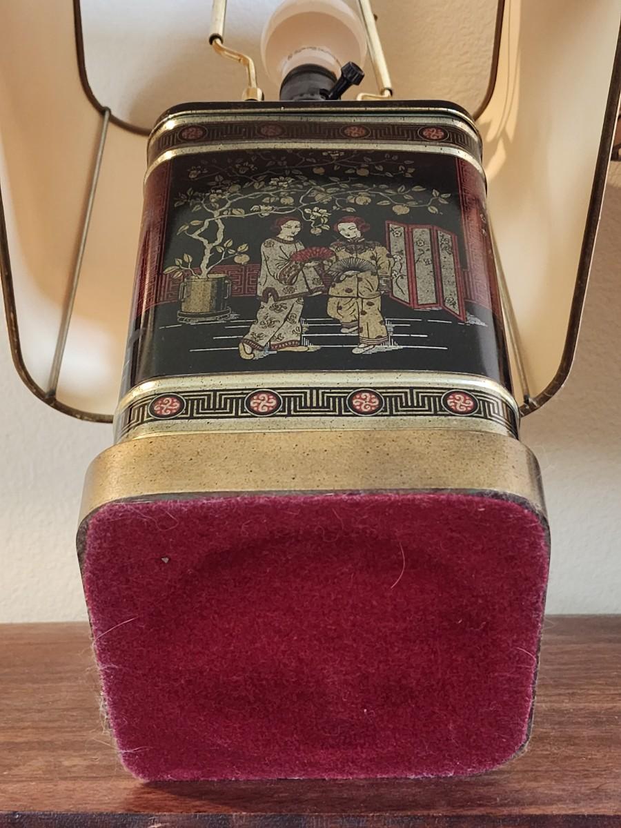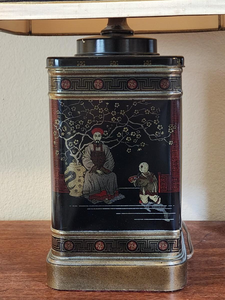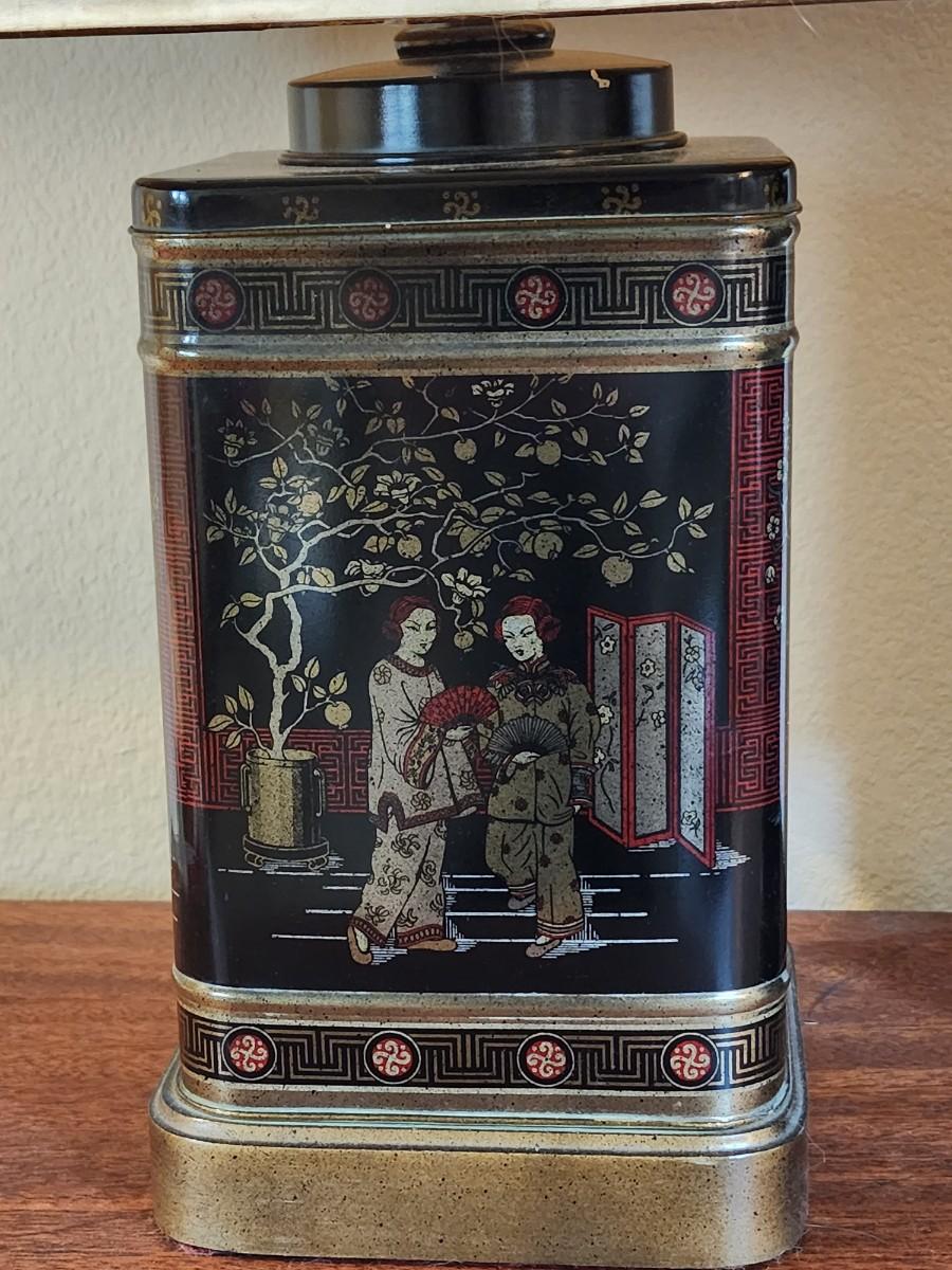Very nice vintage tea tins in excellent condition. No rust, dents, dings or scratches. Original silk over paper shades are solid and intact but somewhat soiled.