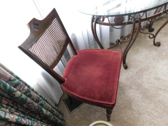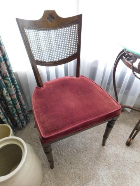 Pair of Vintage Classic Wood Framed Chairs with Cane Webb Back and Upholstered Seat