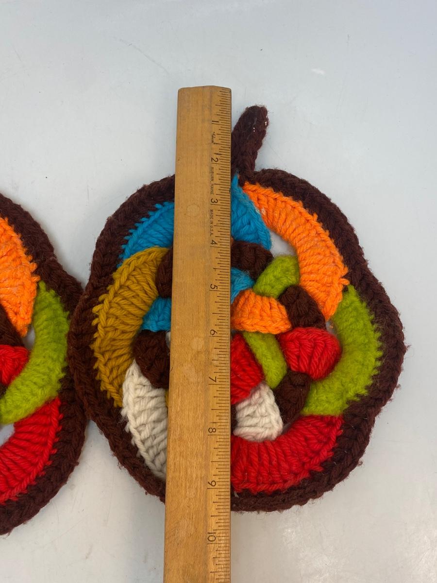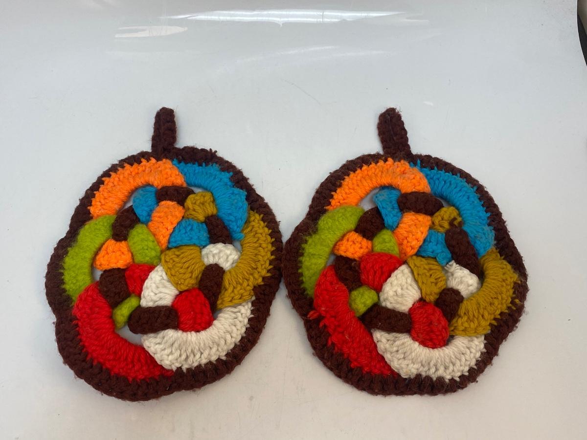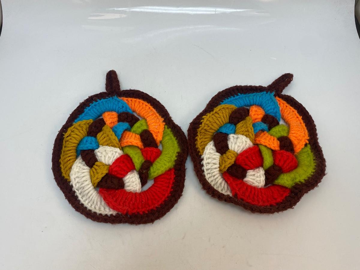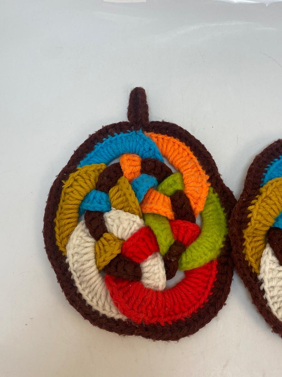 Pair of Vintage Colorful Knot Crochet Potholder Trivets. In good vintage condition, light signs of use.
