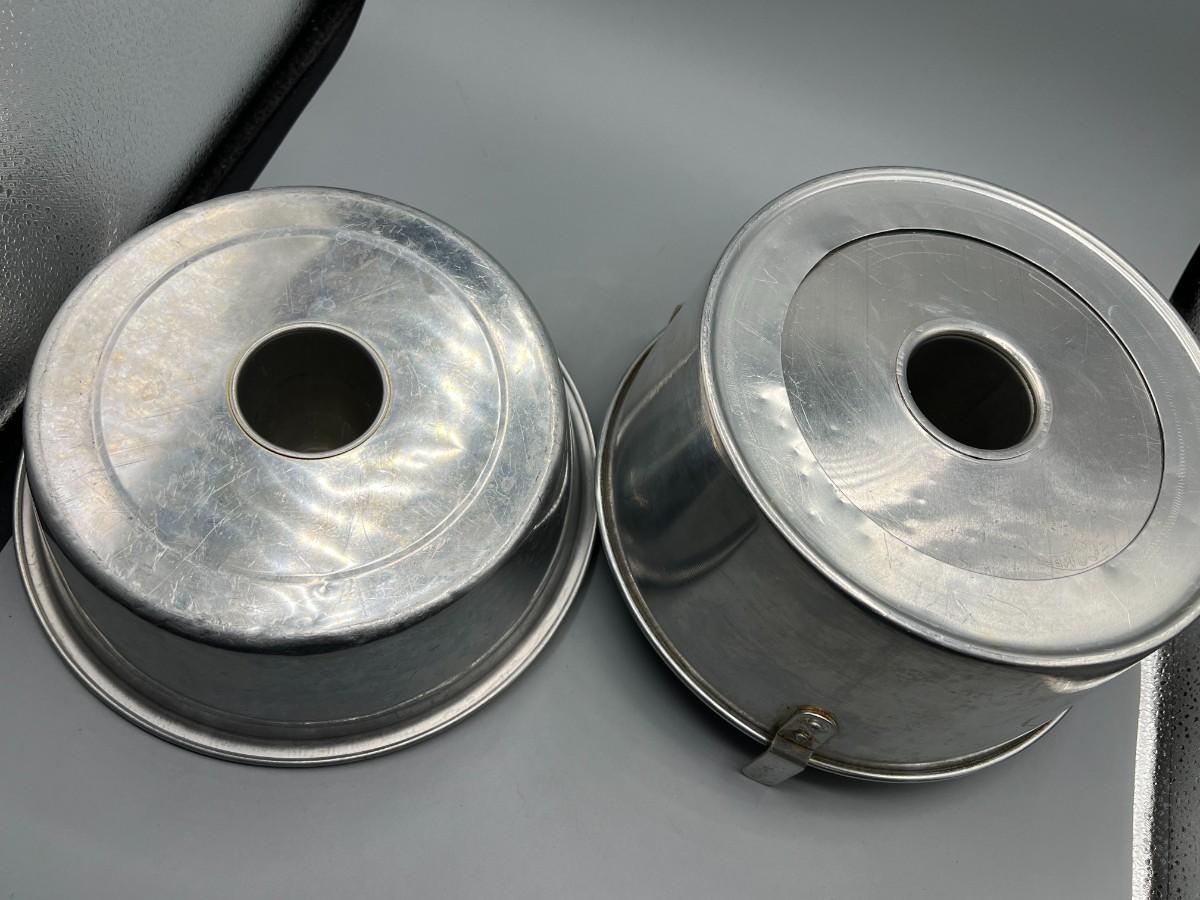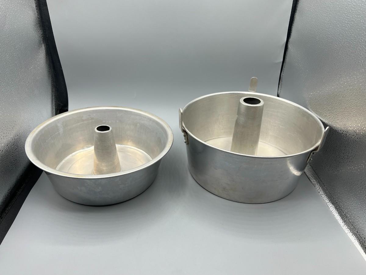 Pair of Vintage Comet Tube Cake Pan Aluminum Baking Bowls, there is some wear to the bowls, but there is no significant damage and is in fair vintage condition. Check pictures for more details and for sizing