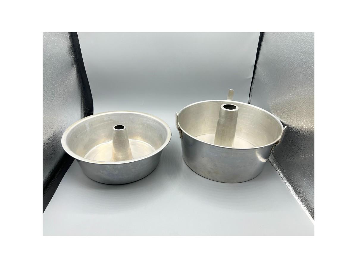 Pair of Vintage Comet Tube Cake Pan Aluminum Baking Bowls, there is some wear to the bowls, but there is no significant damage and is in fair vintage condition. Check pictures for more details and for sizing