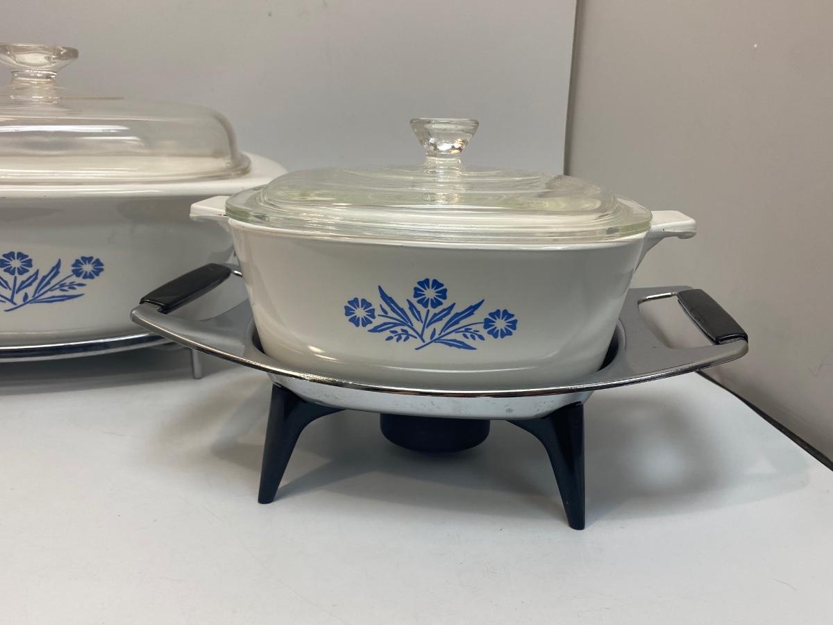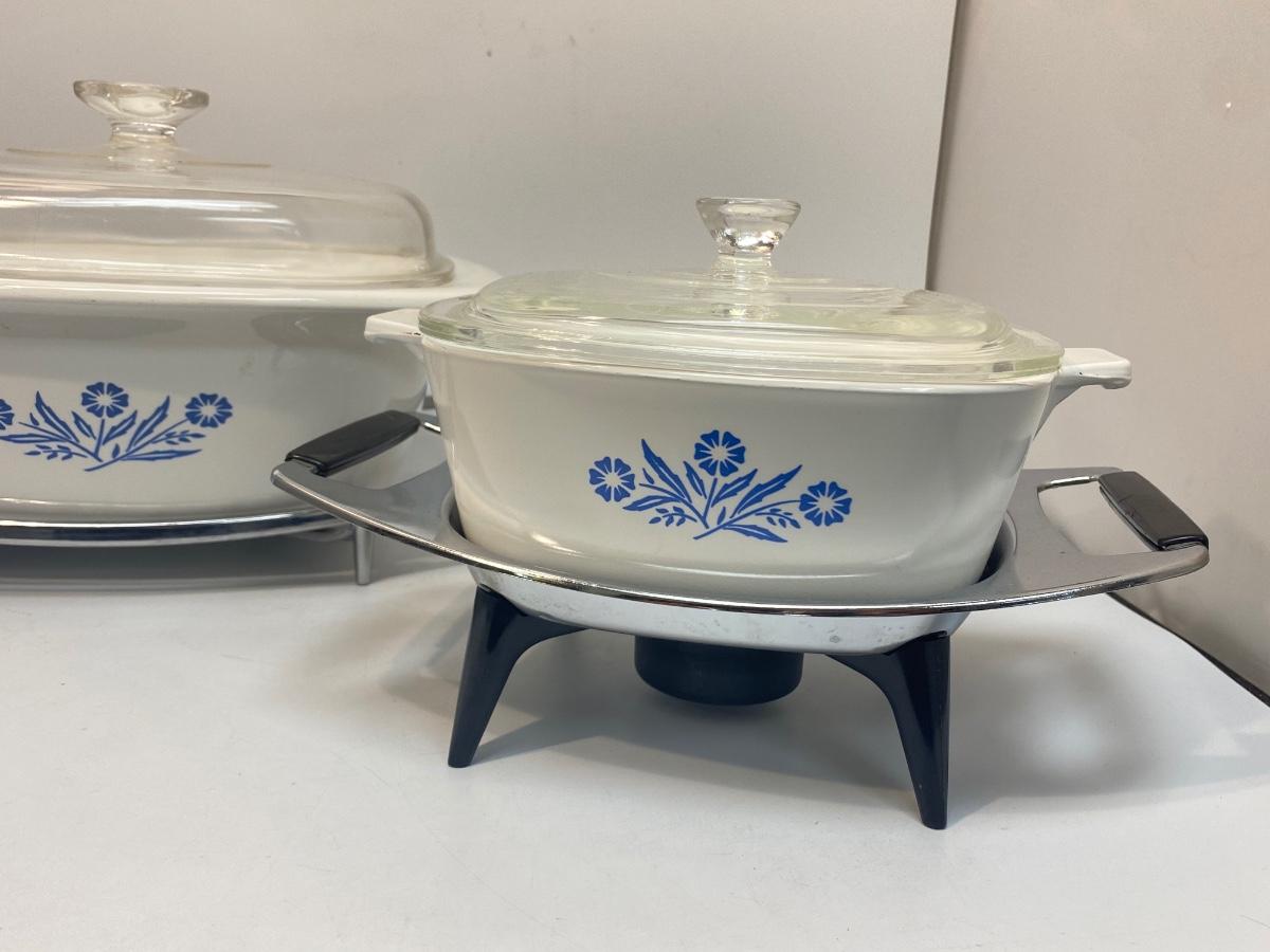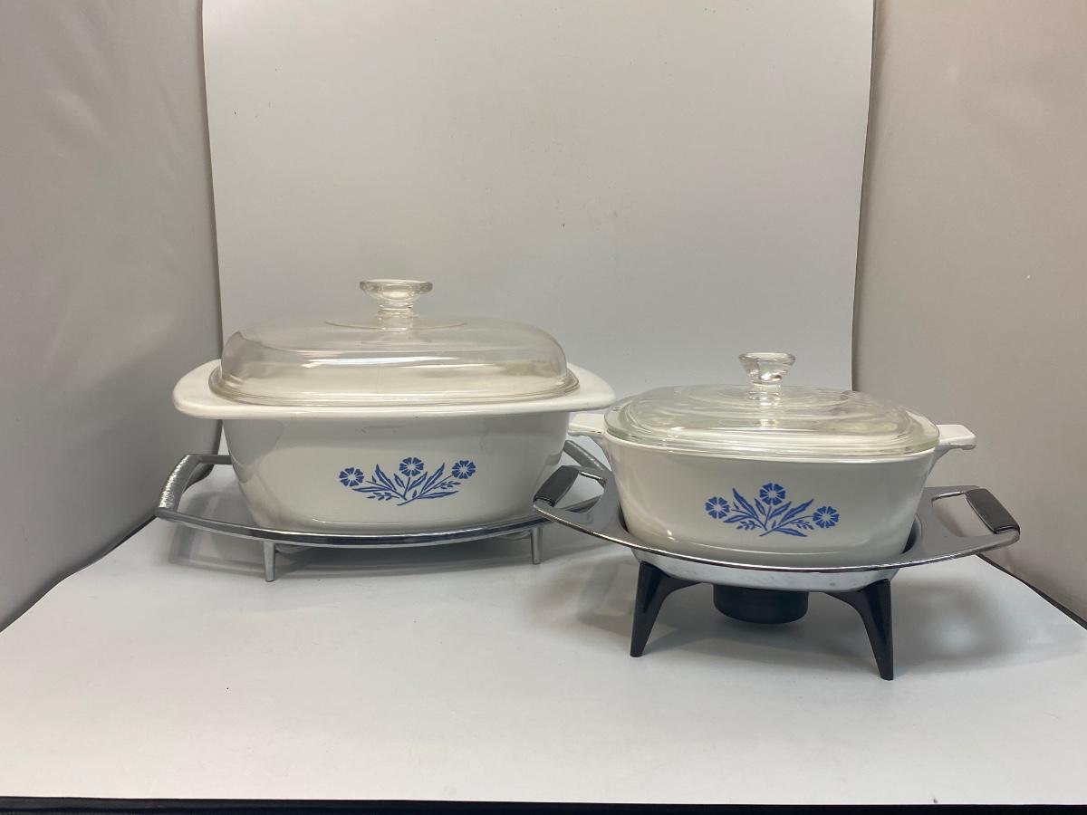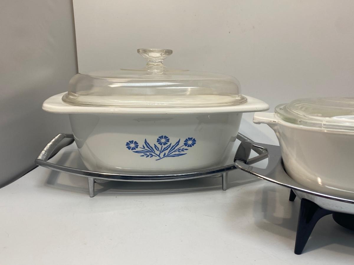 Pair of Vintage Corning Ware Casserole Dishes with Lids & Holding Racks Trivets. Good used condition. The small dish has a chaffing base with candle for keeping food warm, the other is just a metal rack to protect table surfaces.