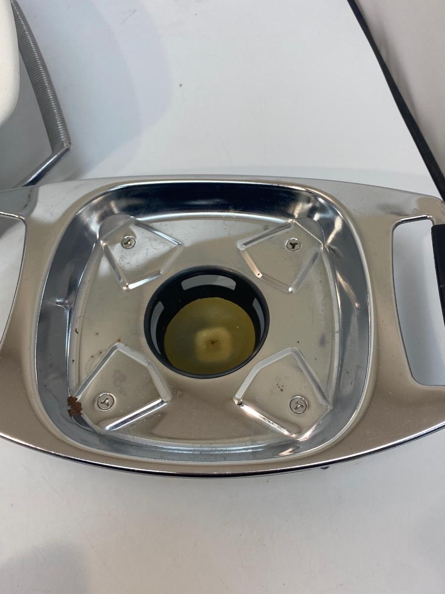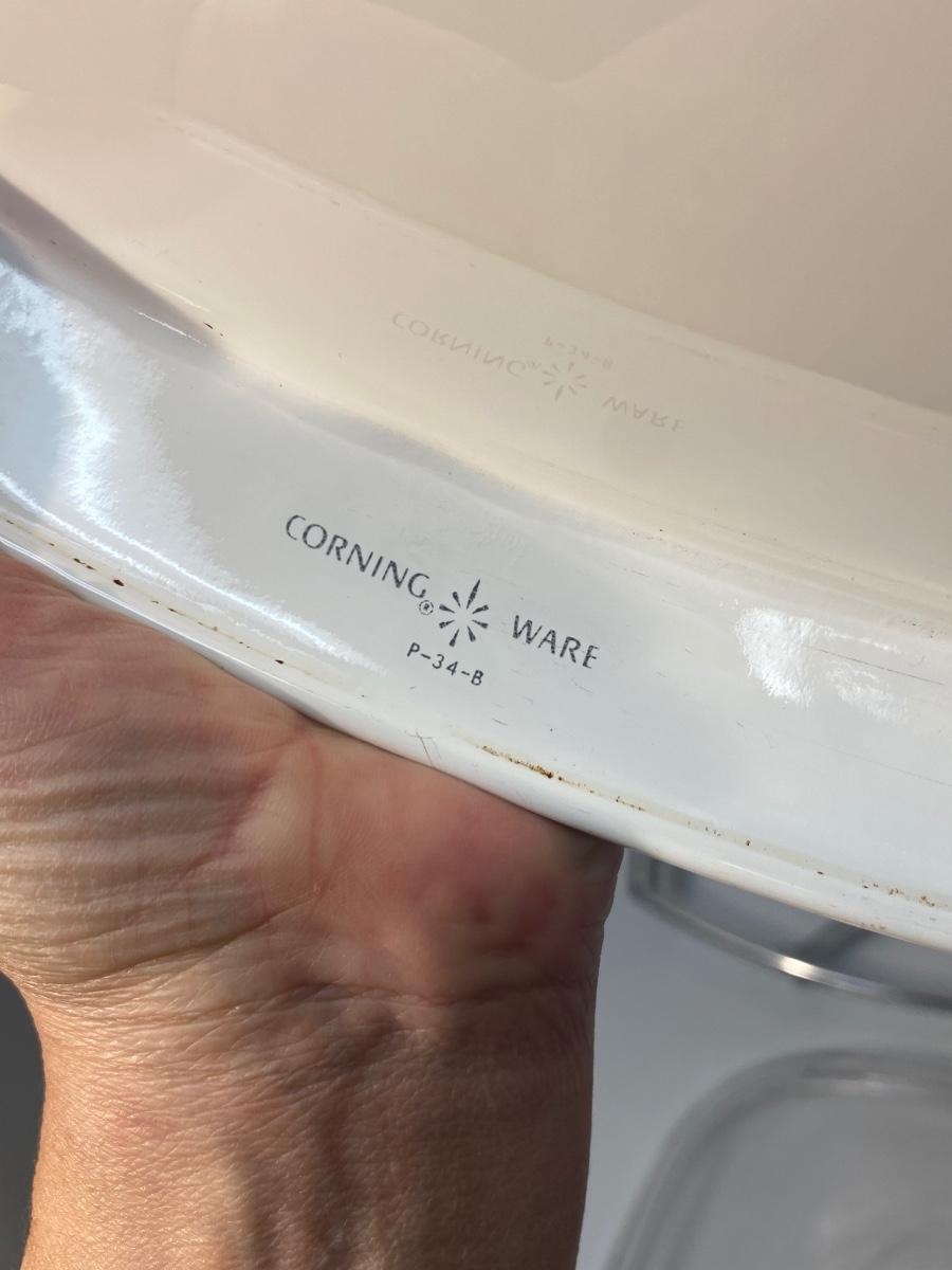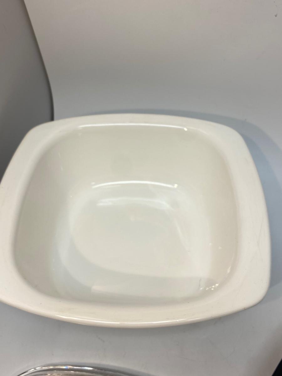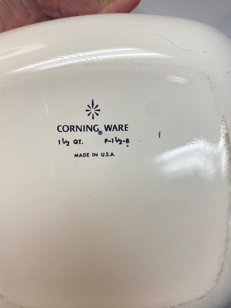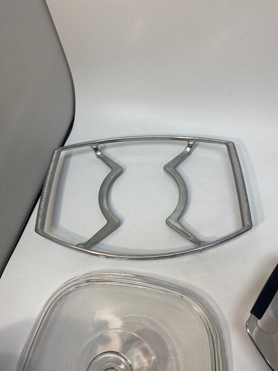 Pair of Vintage Corning Ware Casserole Dishes with Lids & Holding Racks Trivets. Good used condition. The small dish has a chaffing base with candle for keeping food warm, the other is just a metal rack to protect table surfaces.