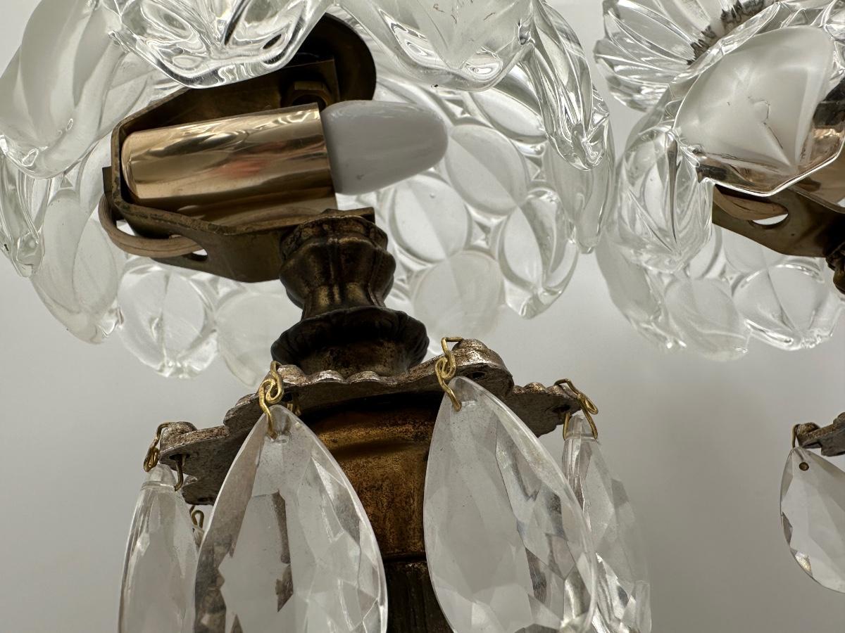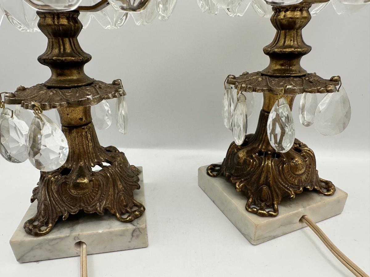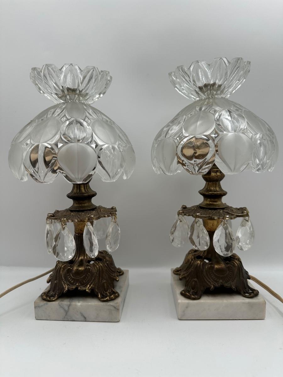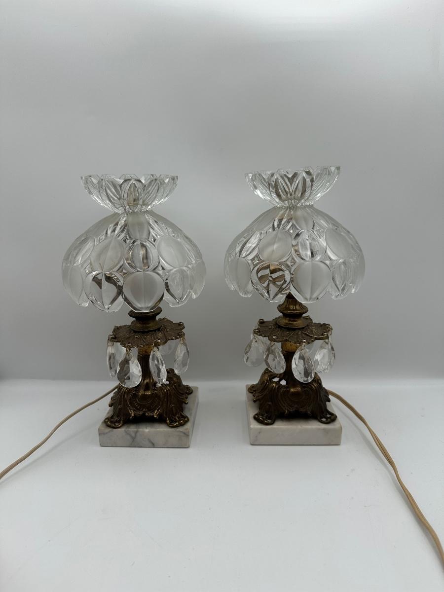 Each features a cut glass dome shade and hanging crystal prisms. Original cords and plugs, untested, rewiring recommended.