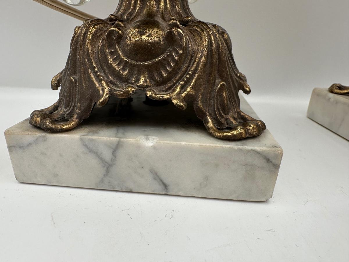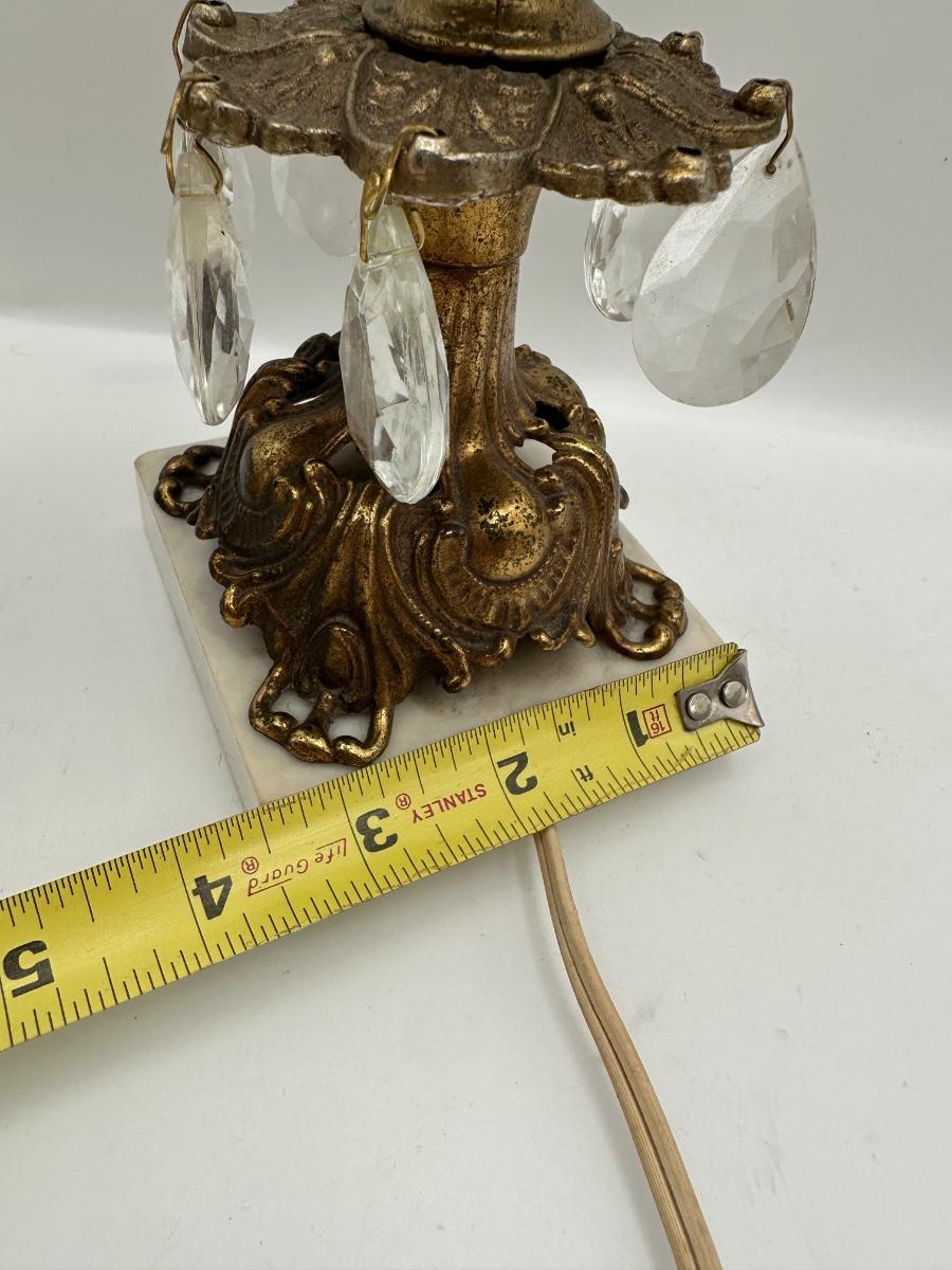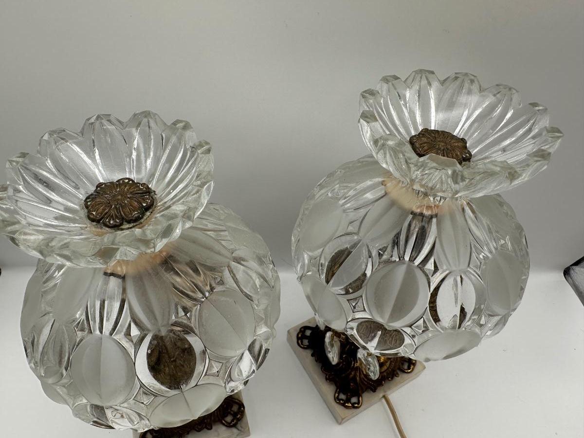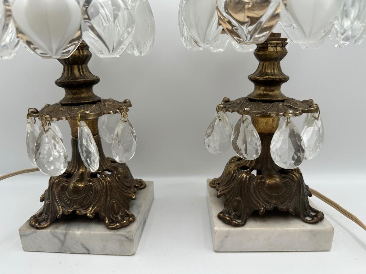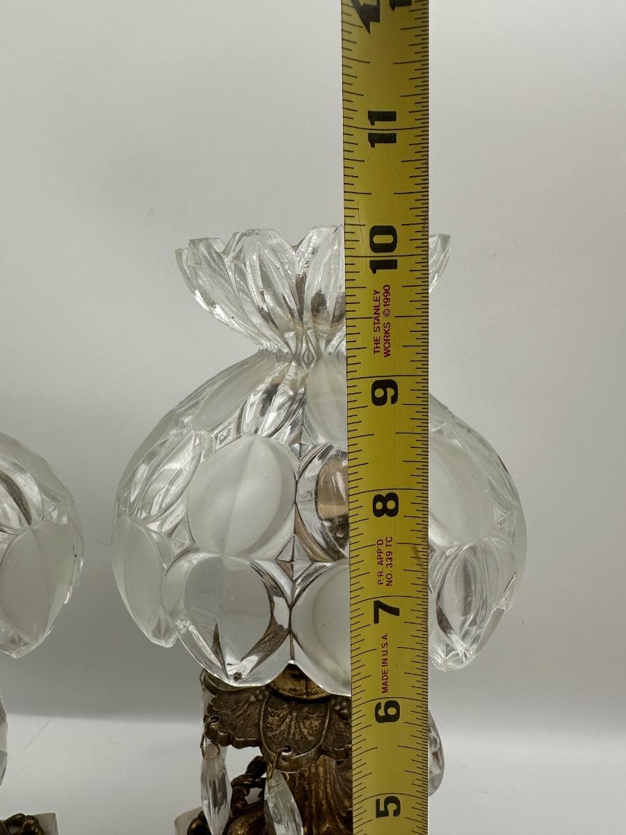 Each features a cut glass dome shade and hanging crystal prisms. Original cords and plugs, untested, rewiring recommended.