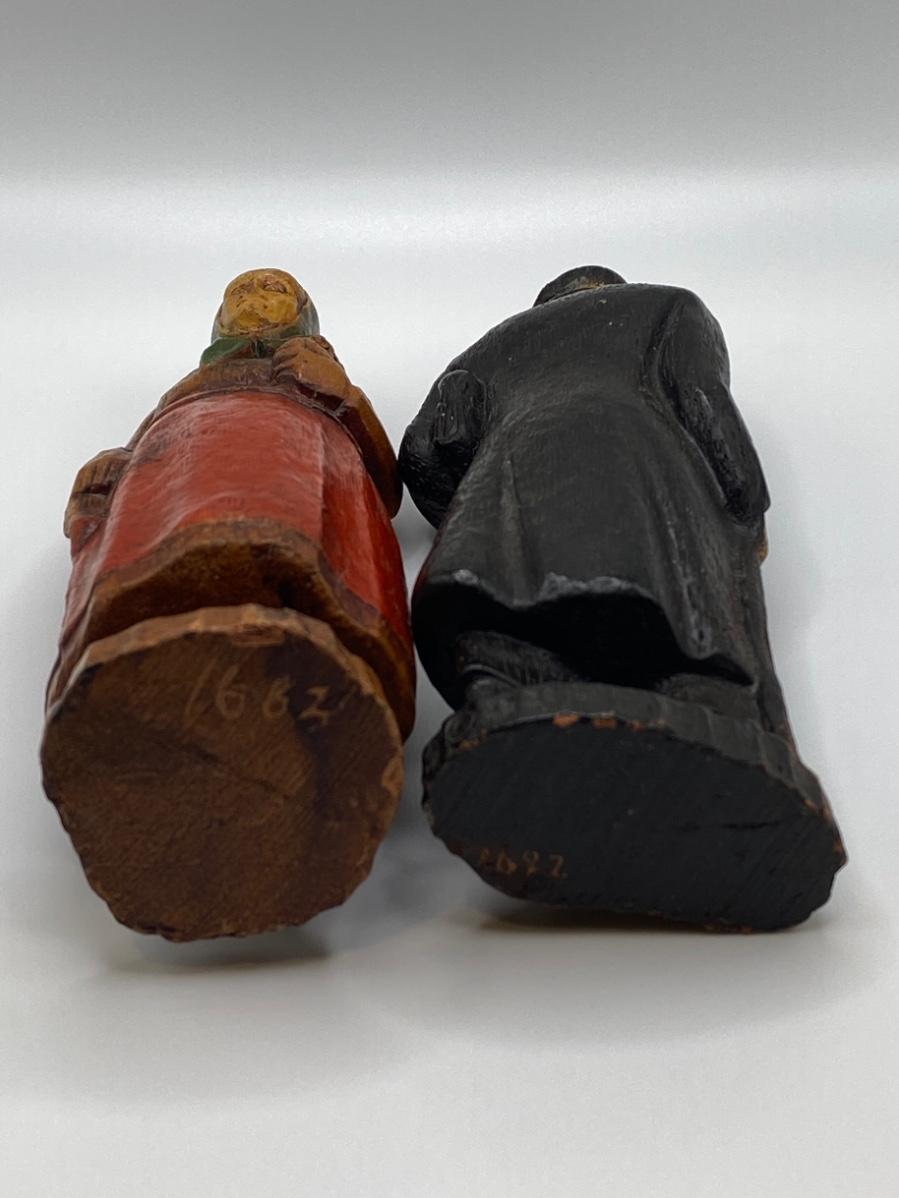 Pair of Vintage Eastern European Jewish Man and Woman Collectible Figurines. 1940's Syrocco Judaica Figurines. Unique Pair of Vintage Eastern European Jewish Man and Woman Collectible Figurines From the 1940s with Both Carrying Bibles (The Woman Holding Star of David Torah) On Their Way To Worship. Judaica Figures Often Called "Bubbe and Zayde" the Yiddish Name for Grandparents. The Pieces Are Made From Syroco, Wood Pulp and Fillers Molded Material Resembling Carved Wood From the Syracuse Ornamental Company. *There is a small chip on the back platform of the gentleman