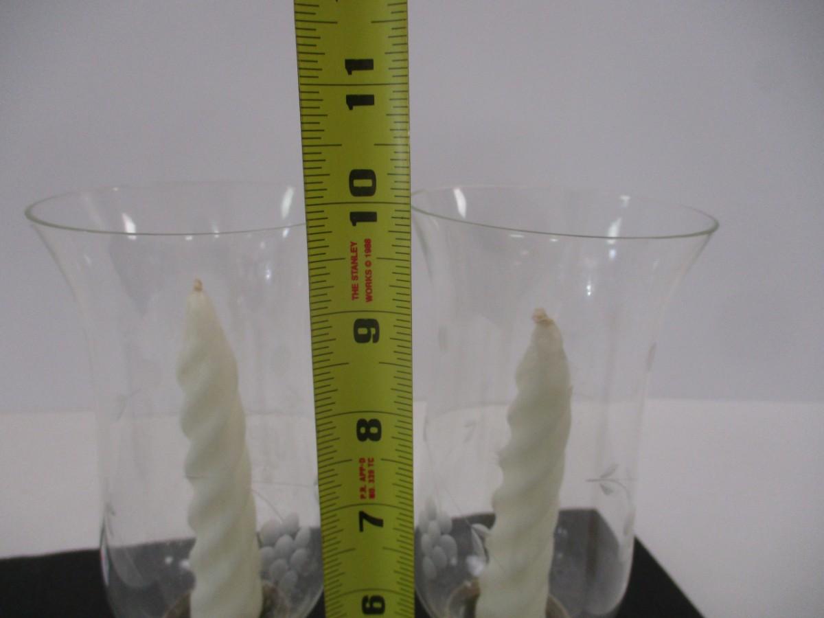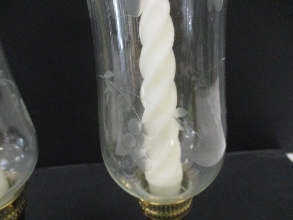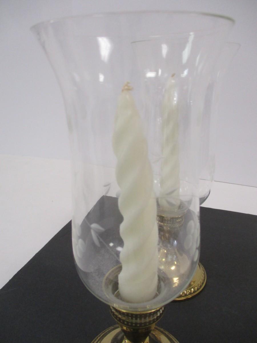 Pair Of Vintage Etched Glass Hurricane Lights With Weighted Stands