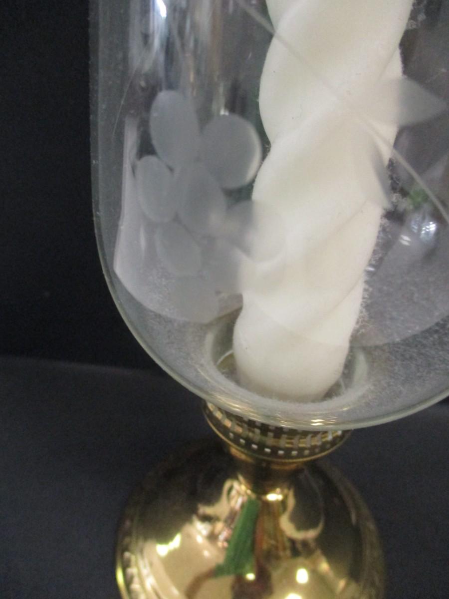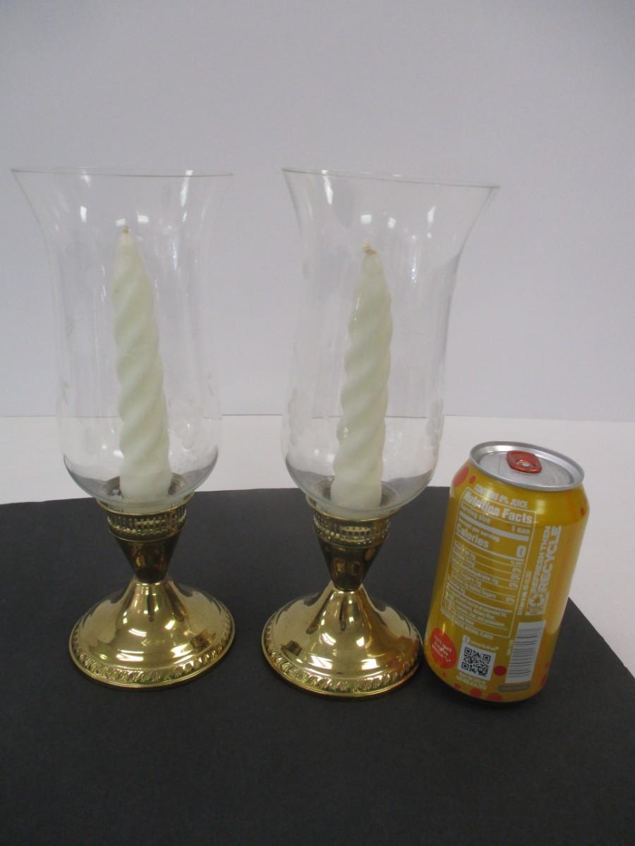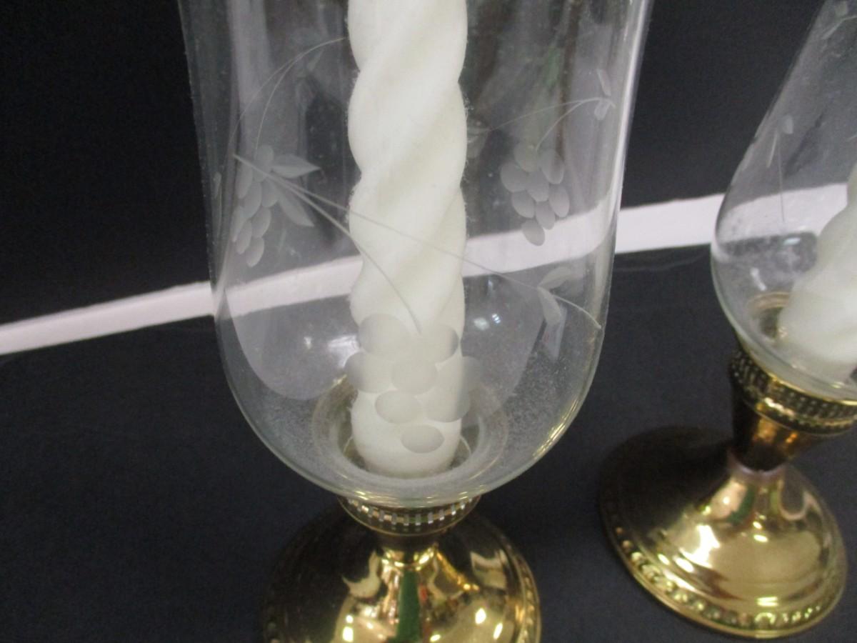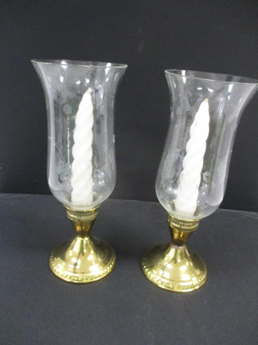 Pair Of Vintage Etched Glass Hurricane Lights With Weighted Stands