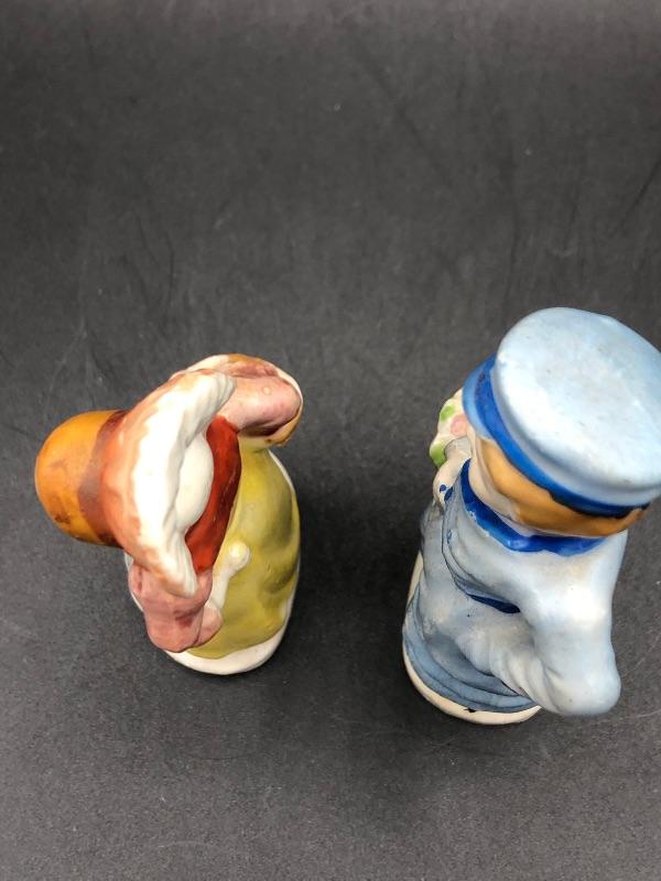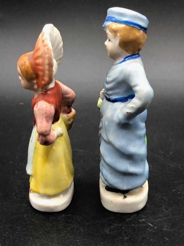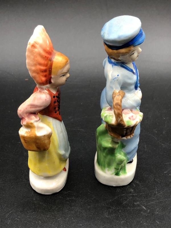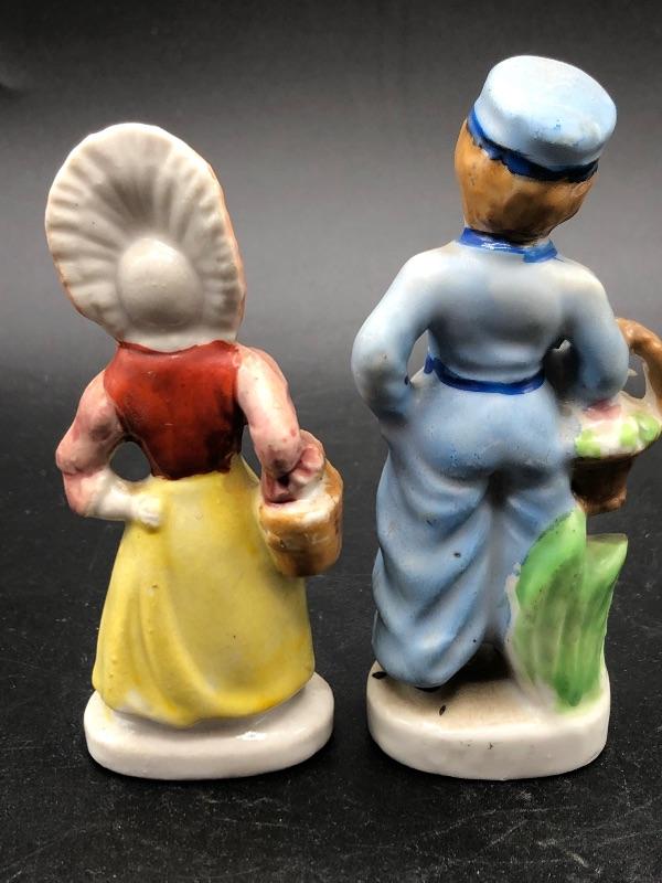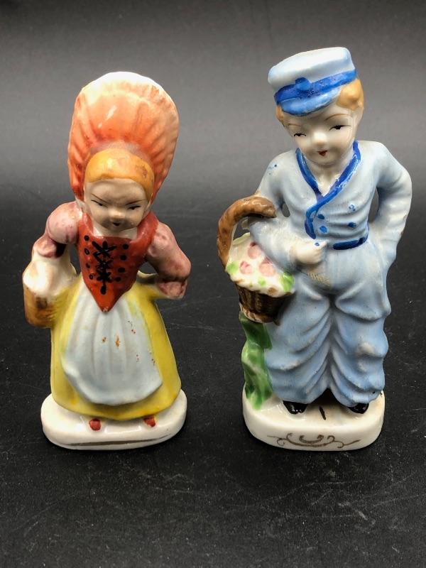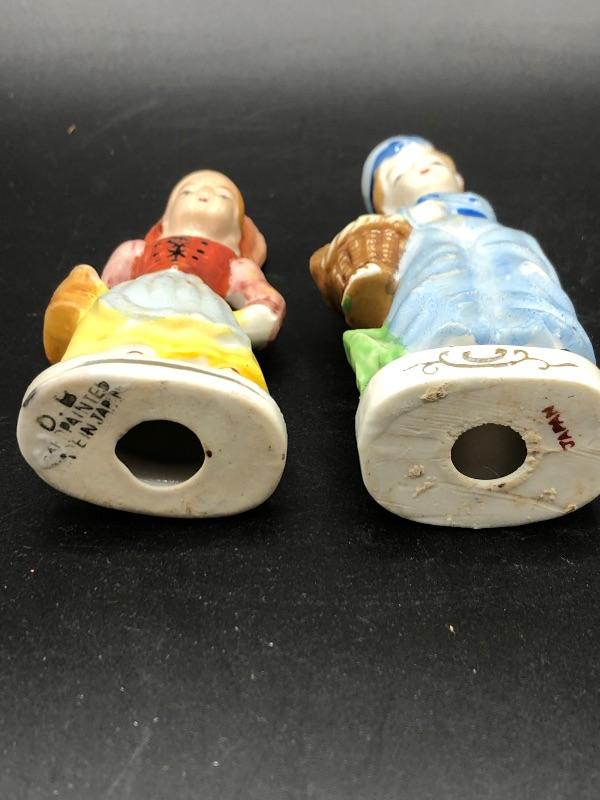 Pair of vintage figurines. A woman in yellow and a woman in blue. Both made in Japan.