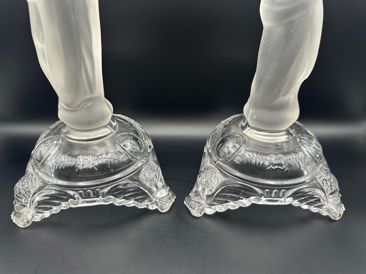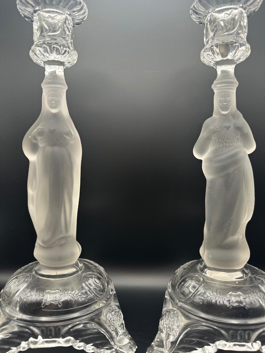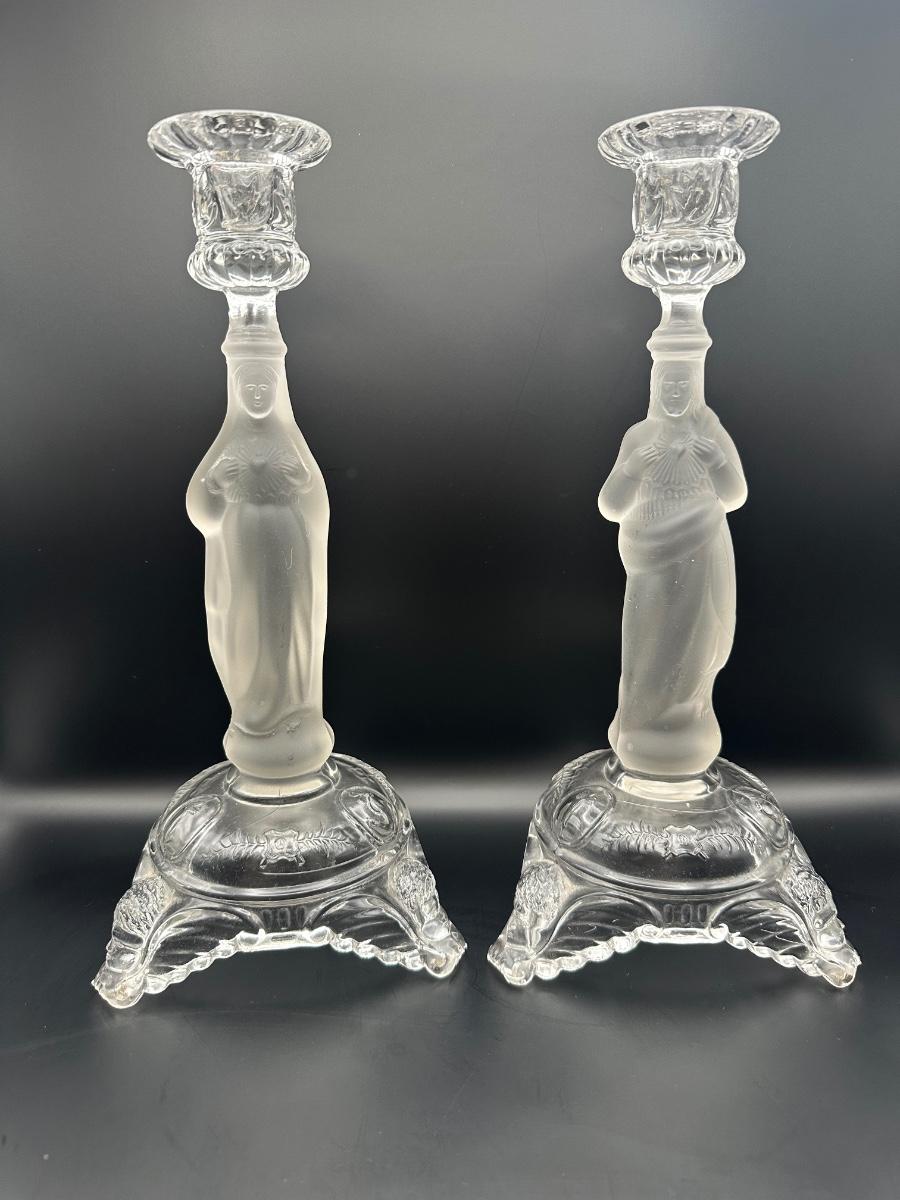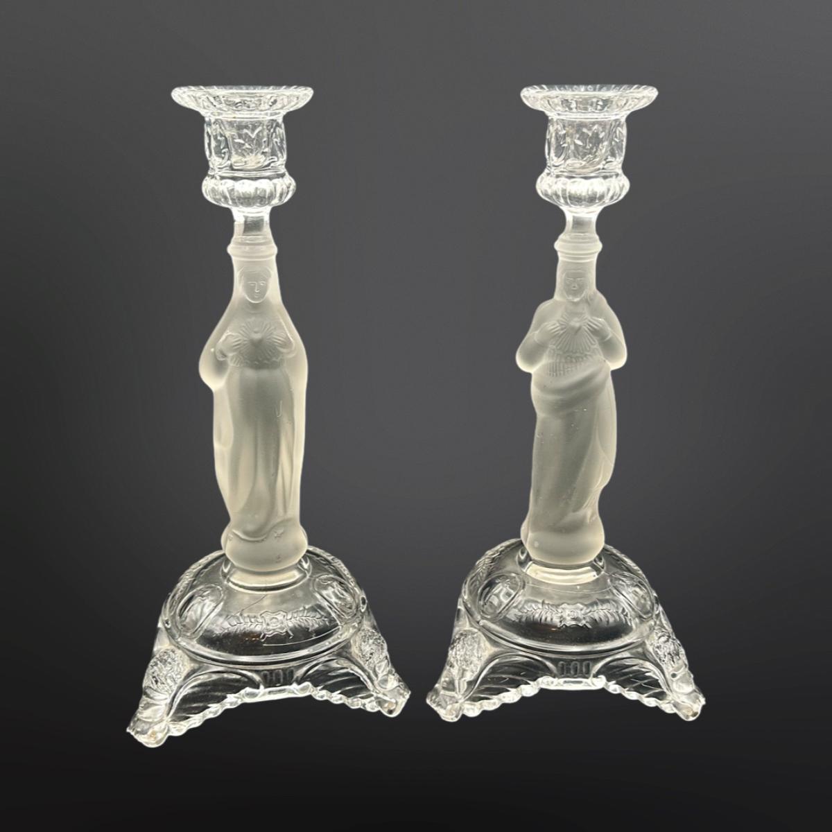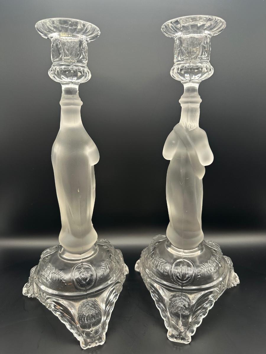 Pair of Vintage Frosted Glass Religious Figural Candle Holders