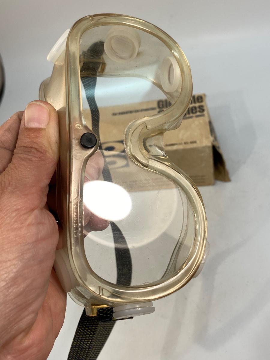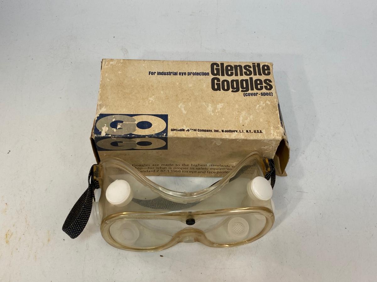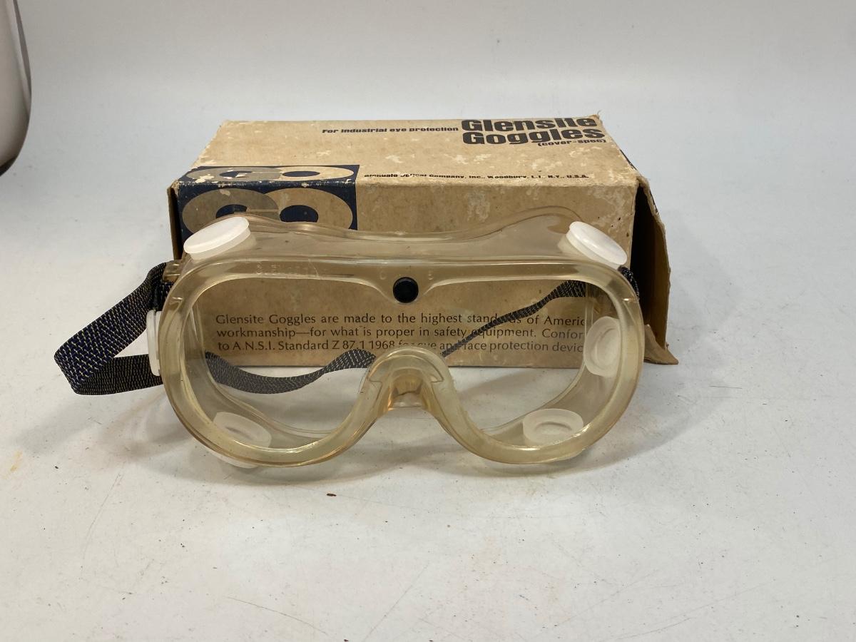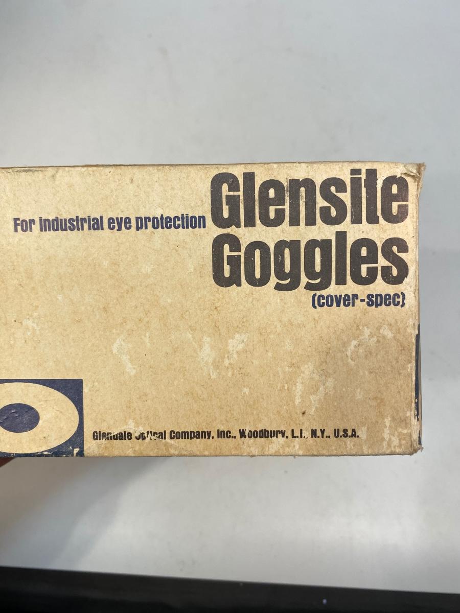 Pair of Vintage Glensite Googles Safety Glasses Eye Protection. In good condition. No scratches on lens noticed. Elastic still has some stretch. Box is worn.