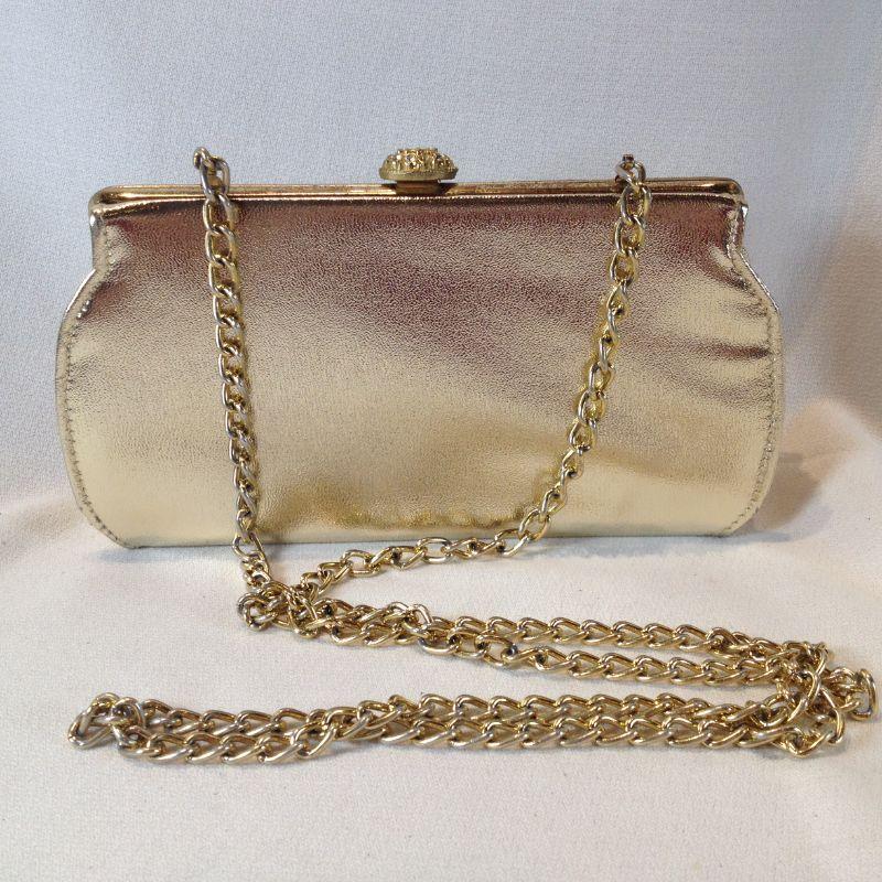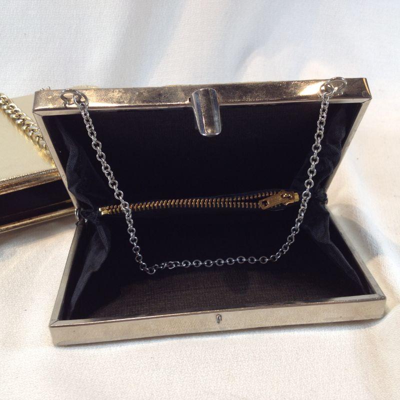 This lot is for a Pair of Vintage Gold Evening Bags. The small boxed clutch has a short chain and shows some wear - inside looks very good. The larger bag has a very long shoulder chain and it is in very good condition inside and out. No maker names. Very Vintage.