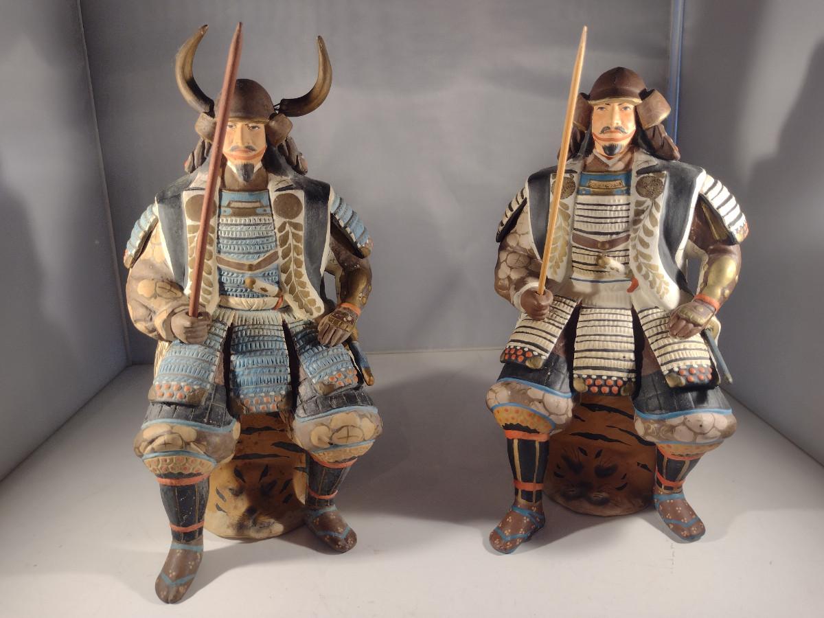 Pair of Vintage Hakata Urasaki Japanese Clay Figurines- Samurai Warriors in Full Armor (#1) (K)