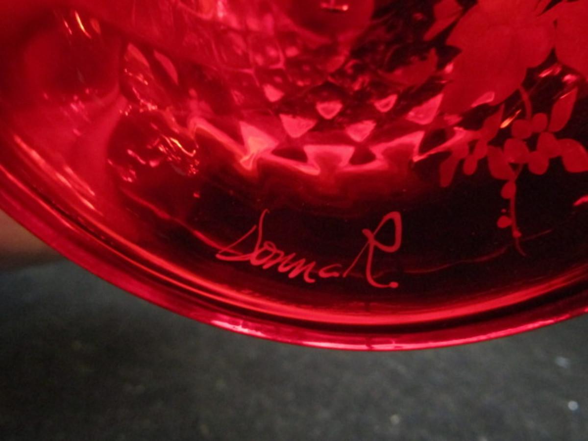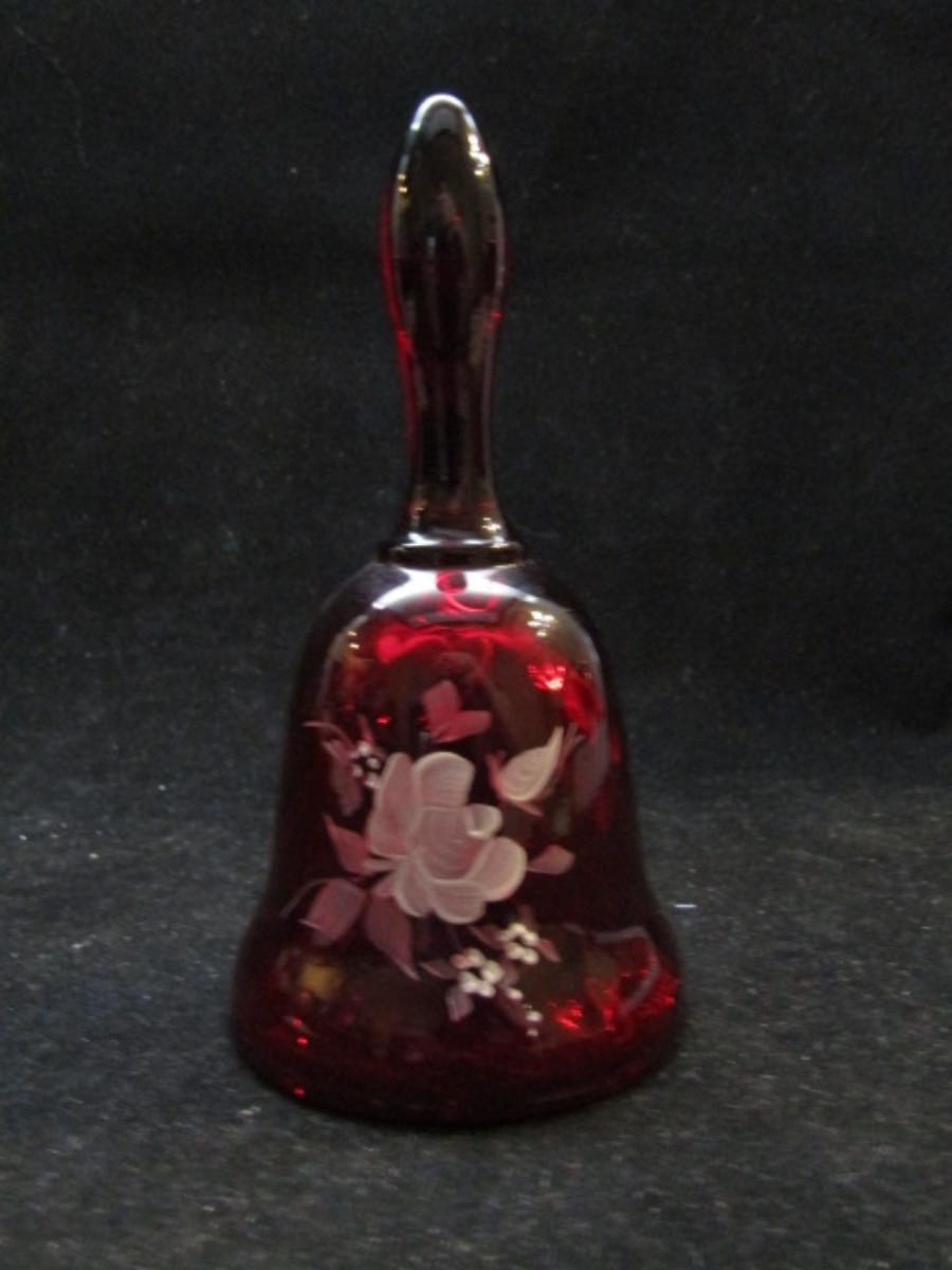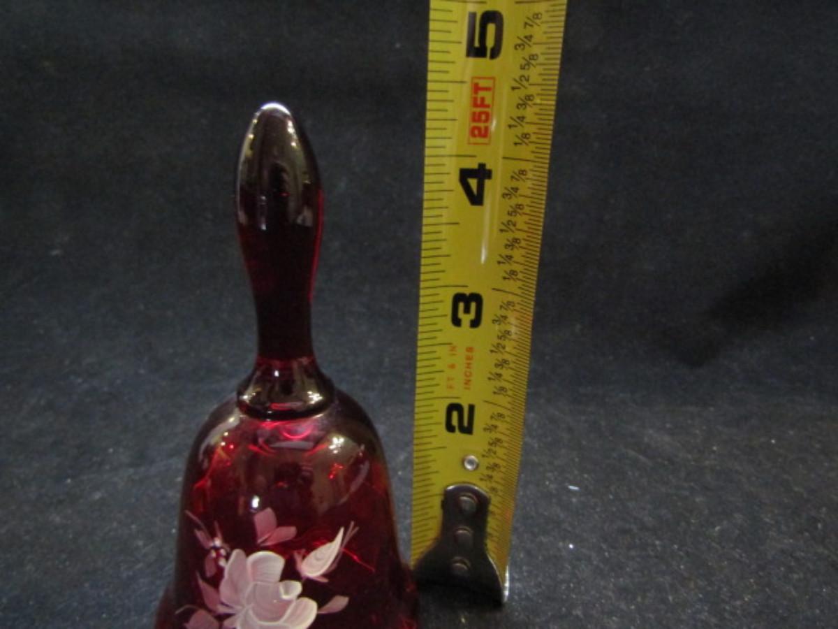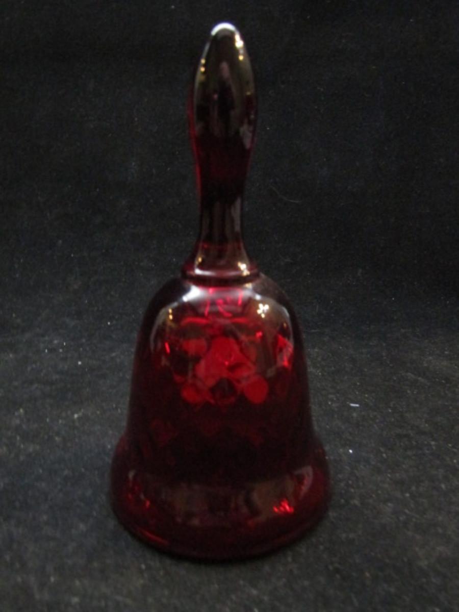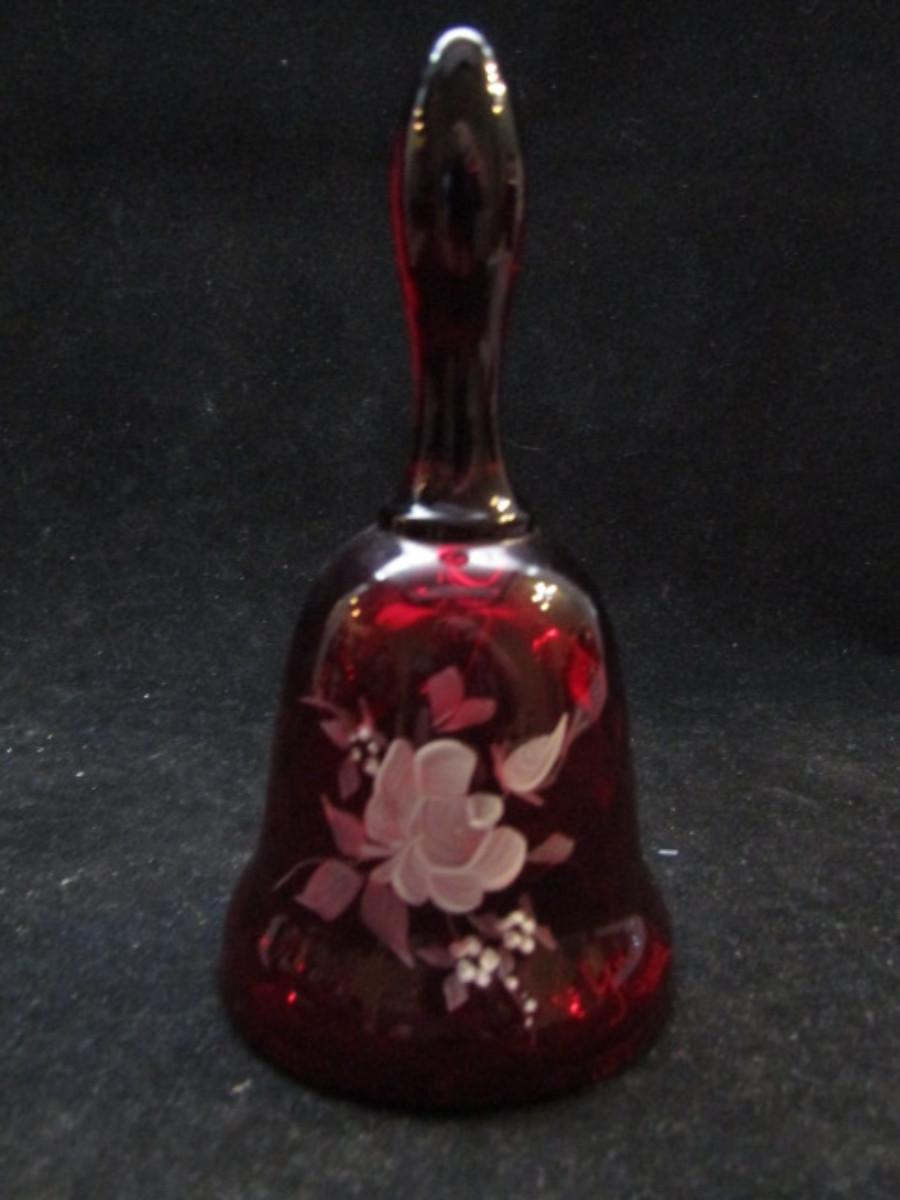 Pair of Vintage Hand Painted Ruby Glass Pieces- Vase and Bell- Possibly Fenton (#157). Bell is signed by artist.