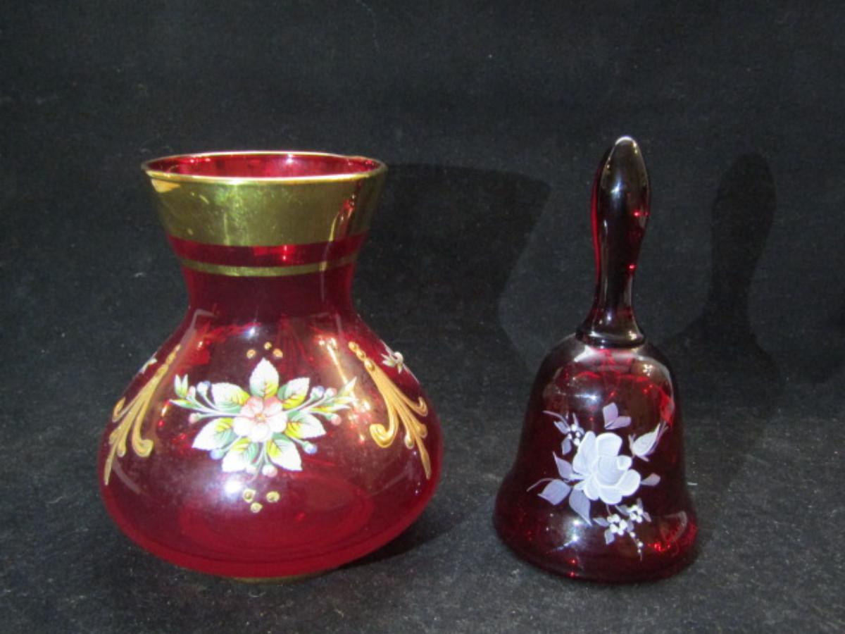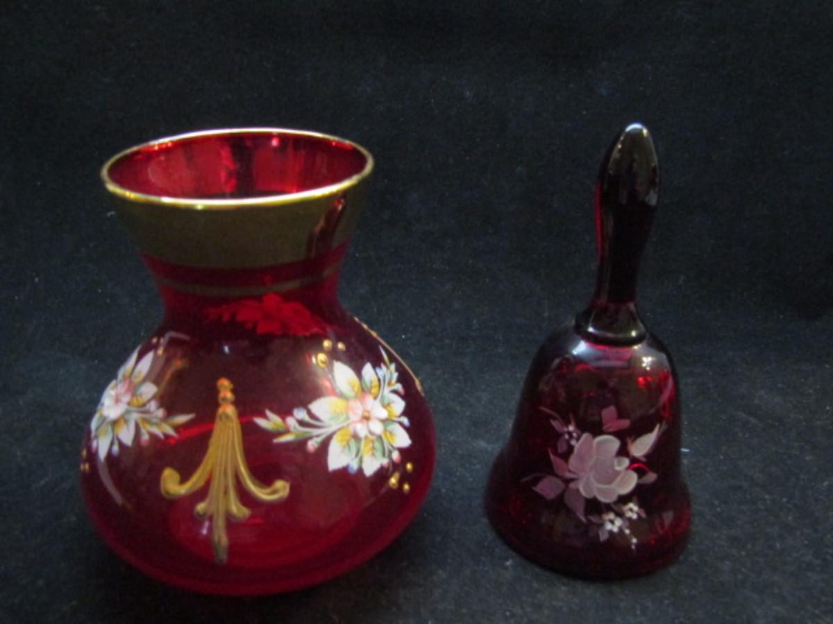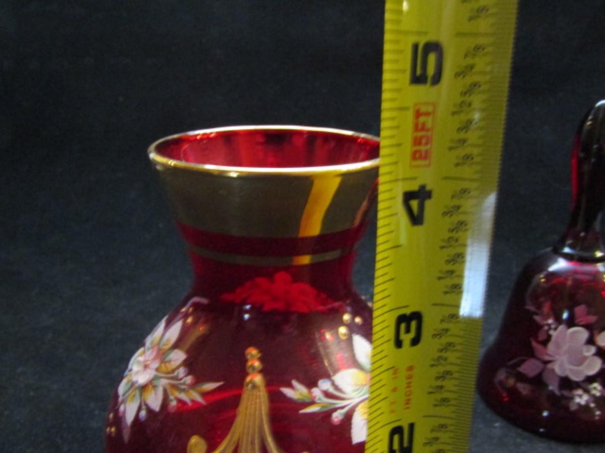 Pair of Vintage Hand Painted Ruby Glass Pieces- Vase and Bell- Possibly Fenton (#157)