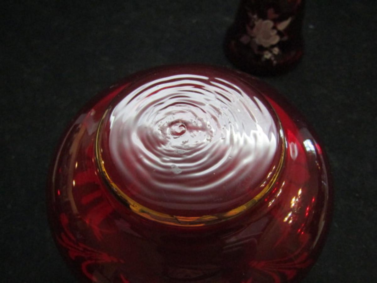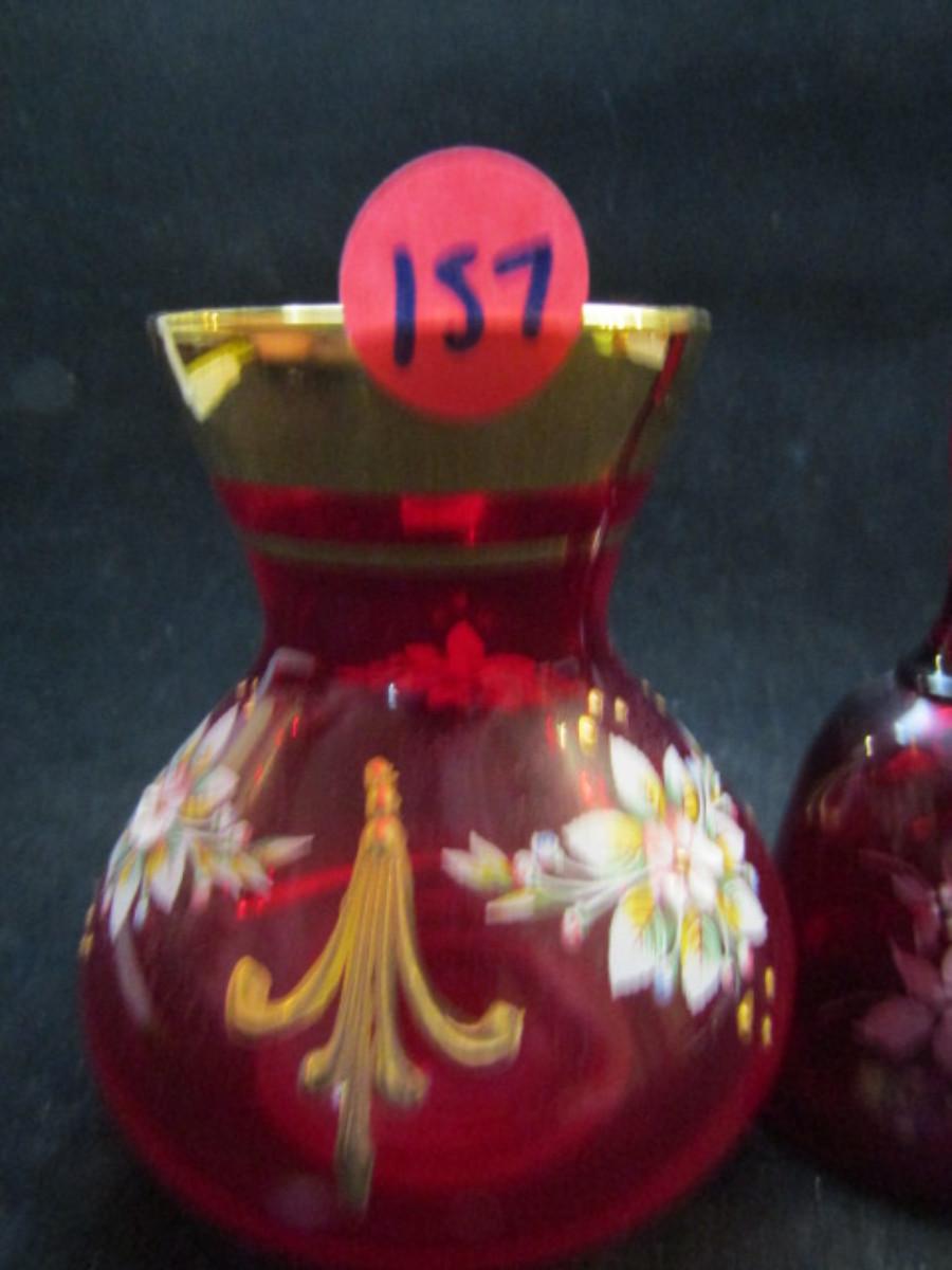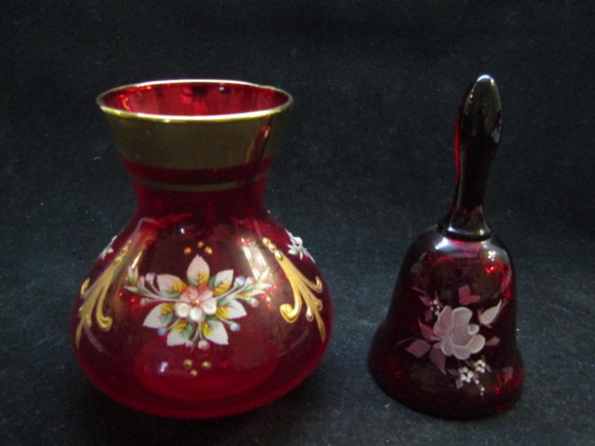 Pair of Vintage Hand Painted Ruby Glass Pieces- Vase and Bell- Possibly Fenton (#157)