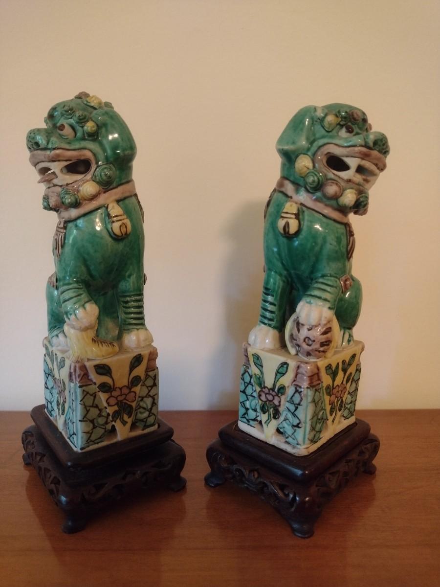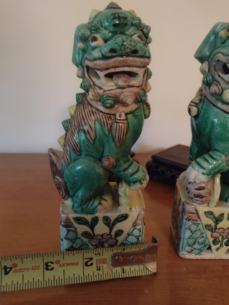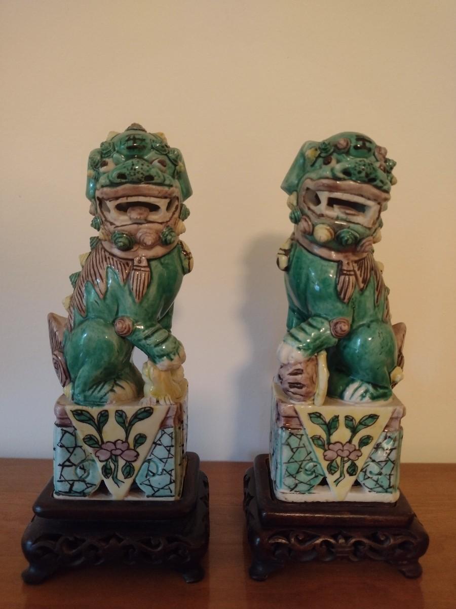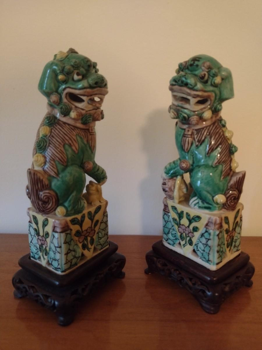 Pair of Vintage Hand Painted Famille Ceramic Foo Lion Dog Statuettes on Rosewood Bases