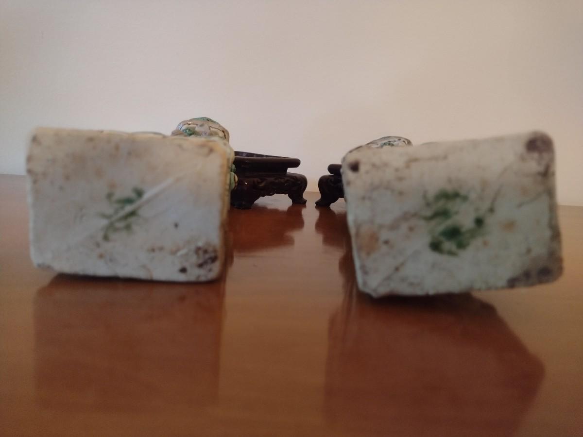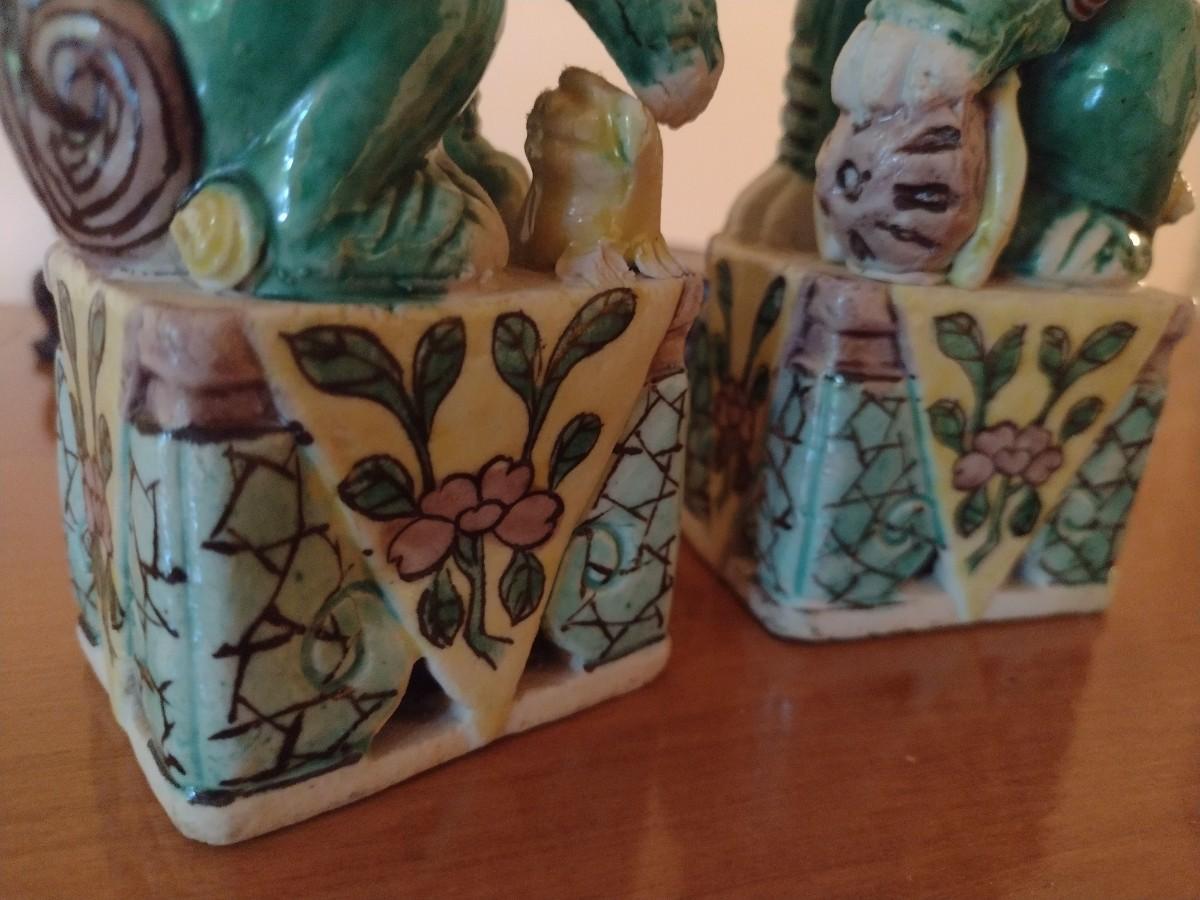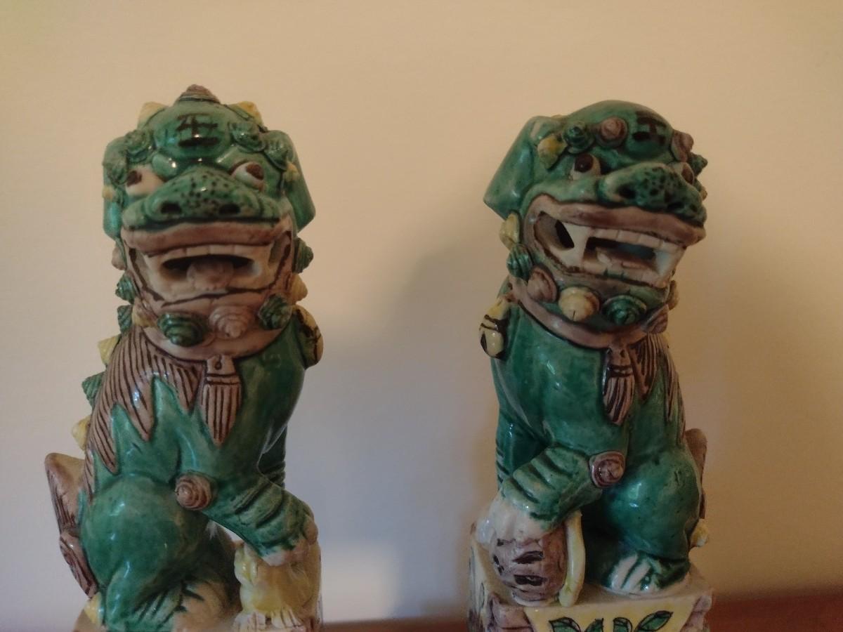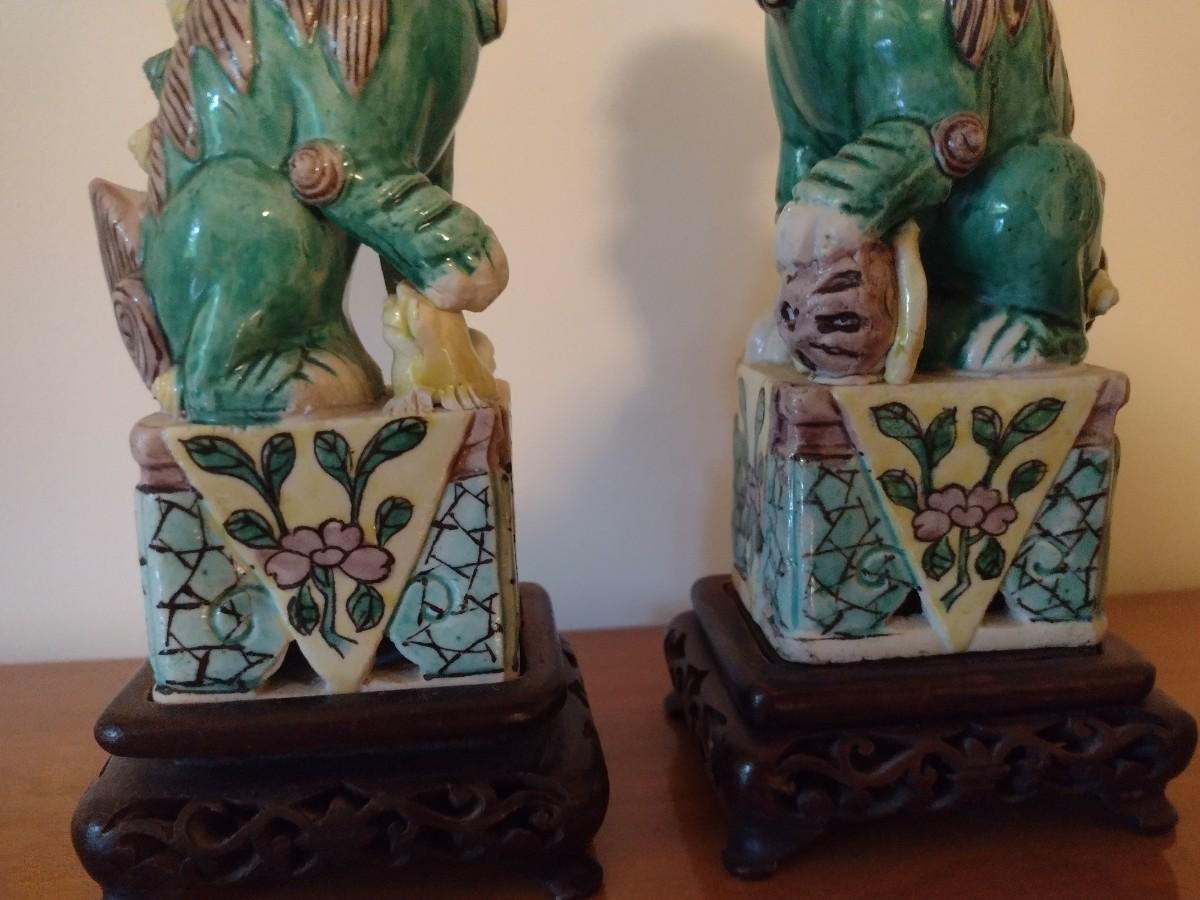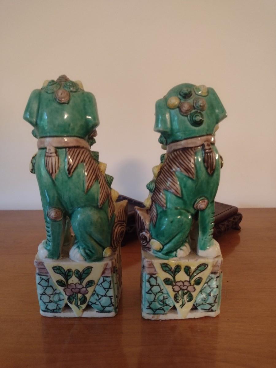 Pair of Vintage Hand Painted Famille Ceramic Foo Lion Dog Statuettes on Rosewood Bases