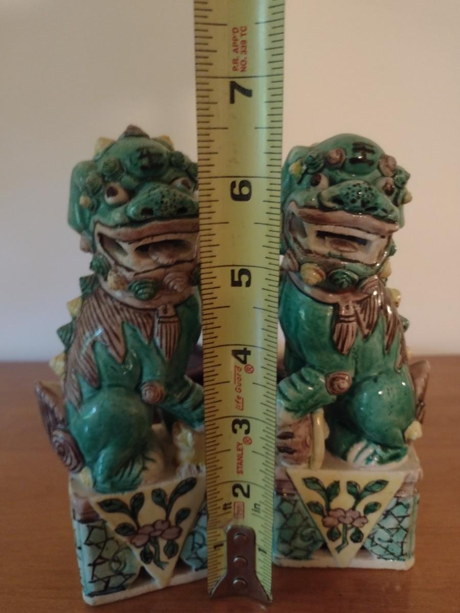 Pair of Vintage Hand Painted Ceramic Foo Dragon Dog Statuettes on Rosewood Bases