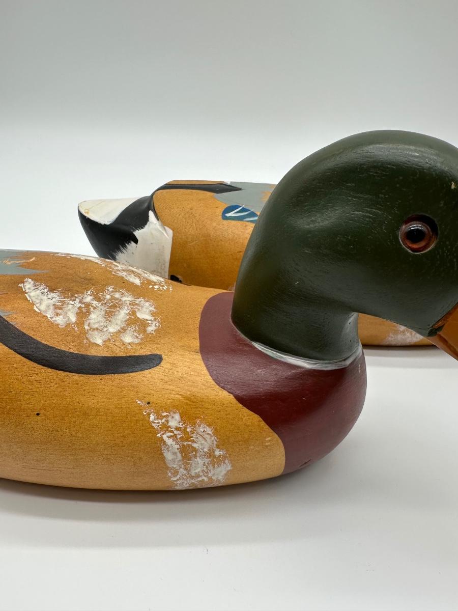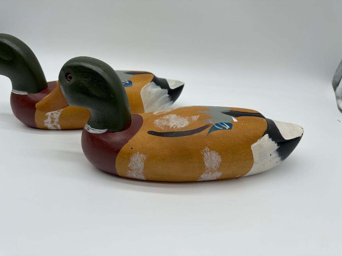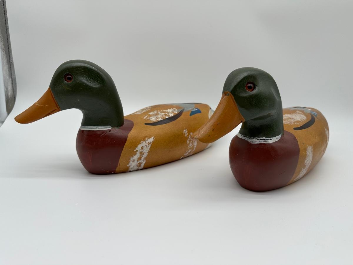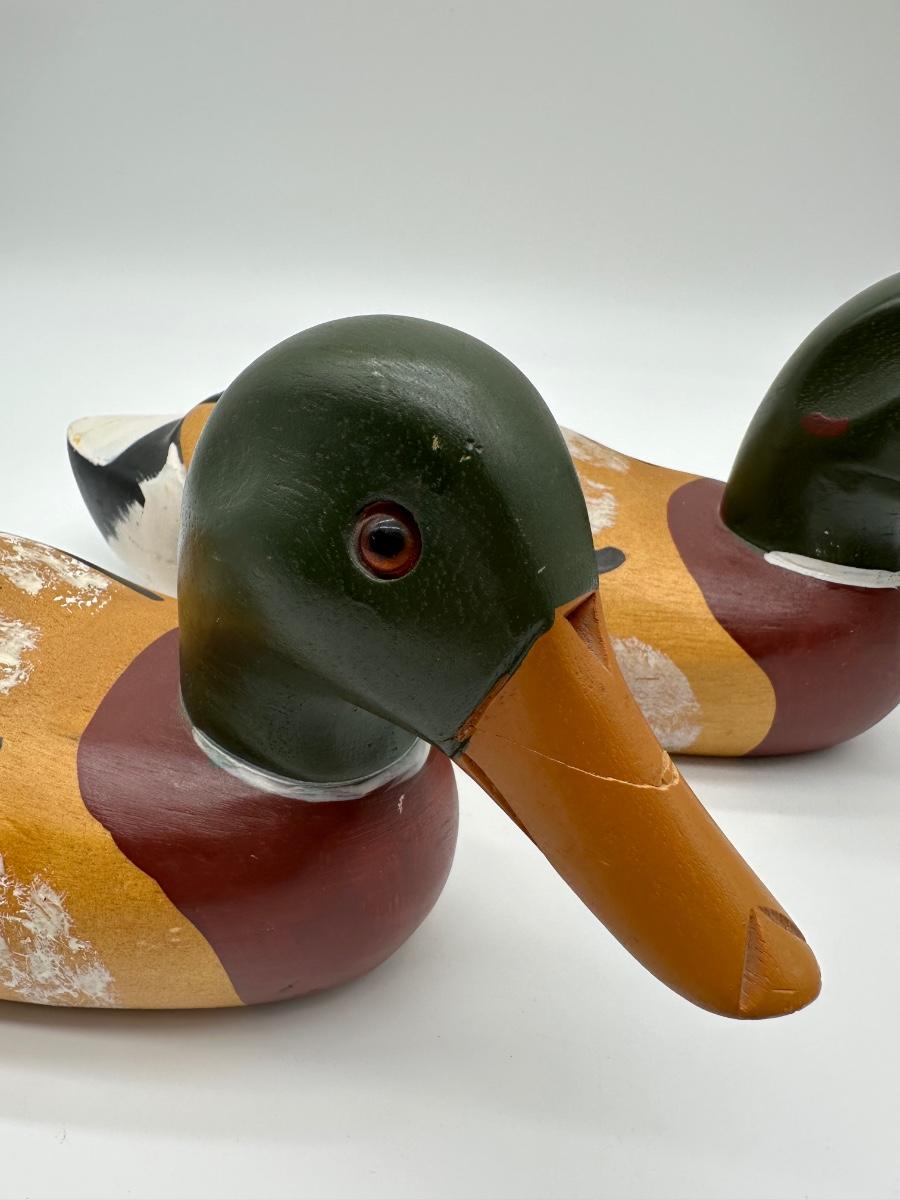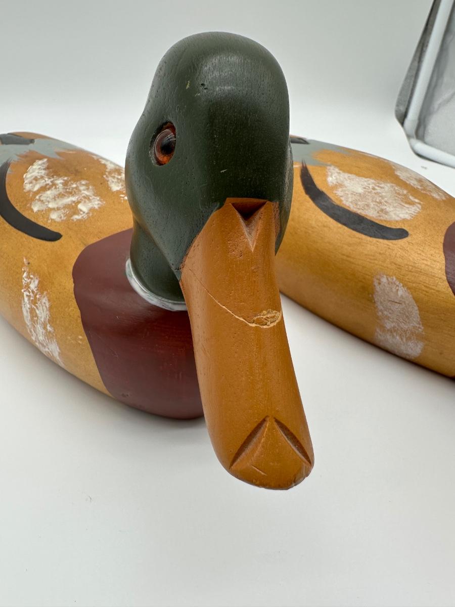 Pair of vintage hand-carved wooden mallard duck decoys with classic painted details. Solid wood construction with traditional form and character. Great for rustic cabin décor, lodge display, folk art / hunting collectible use.