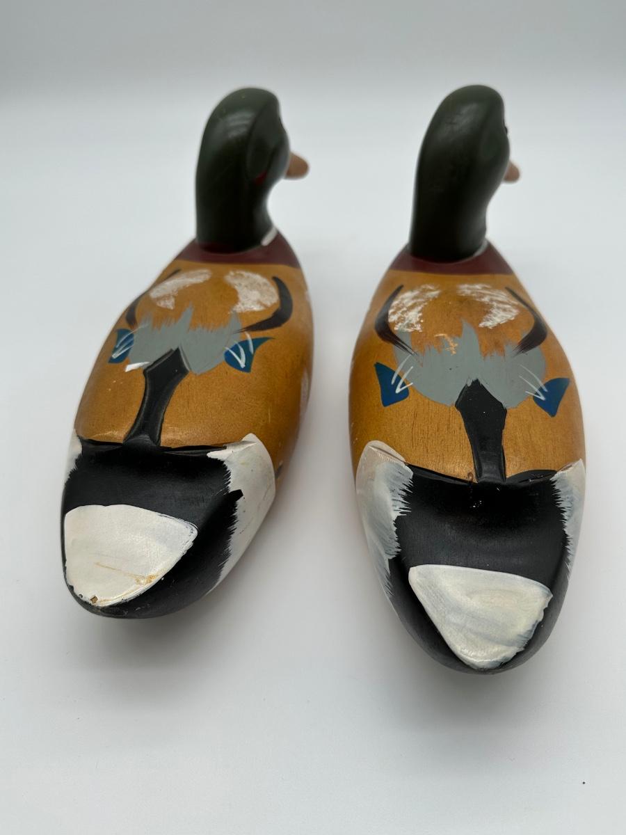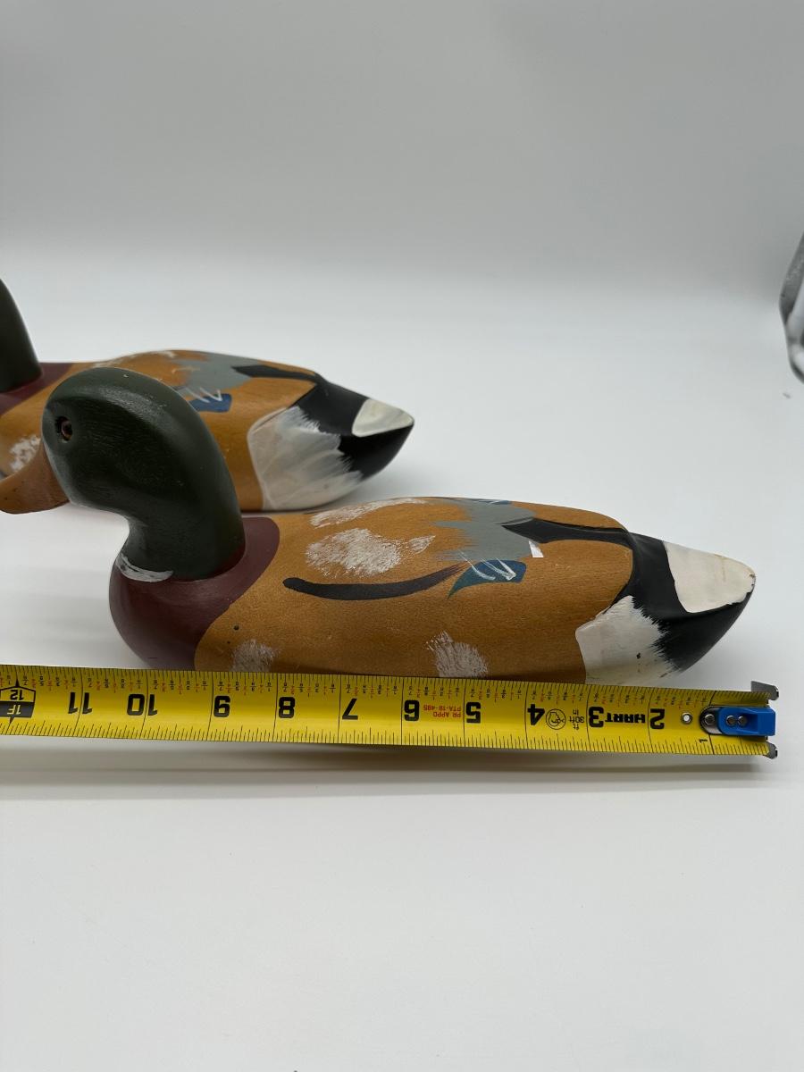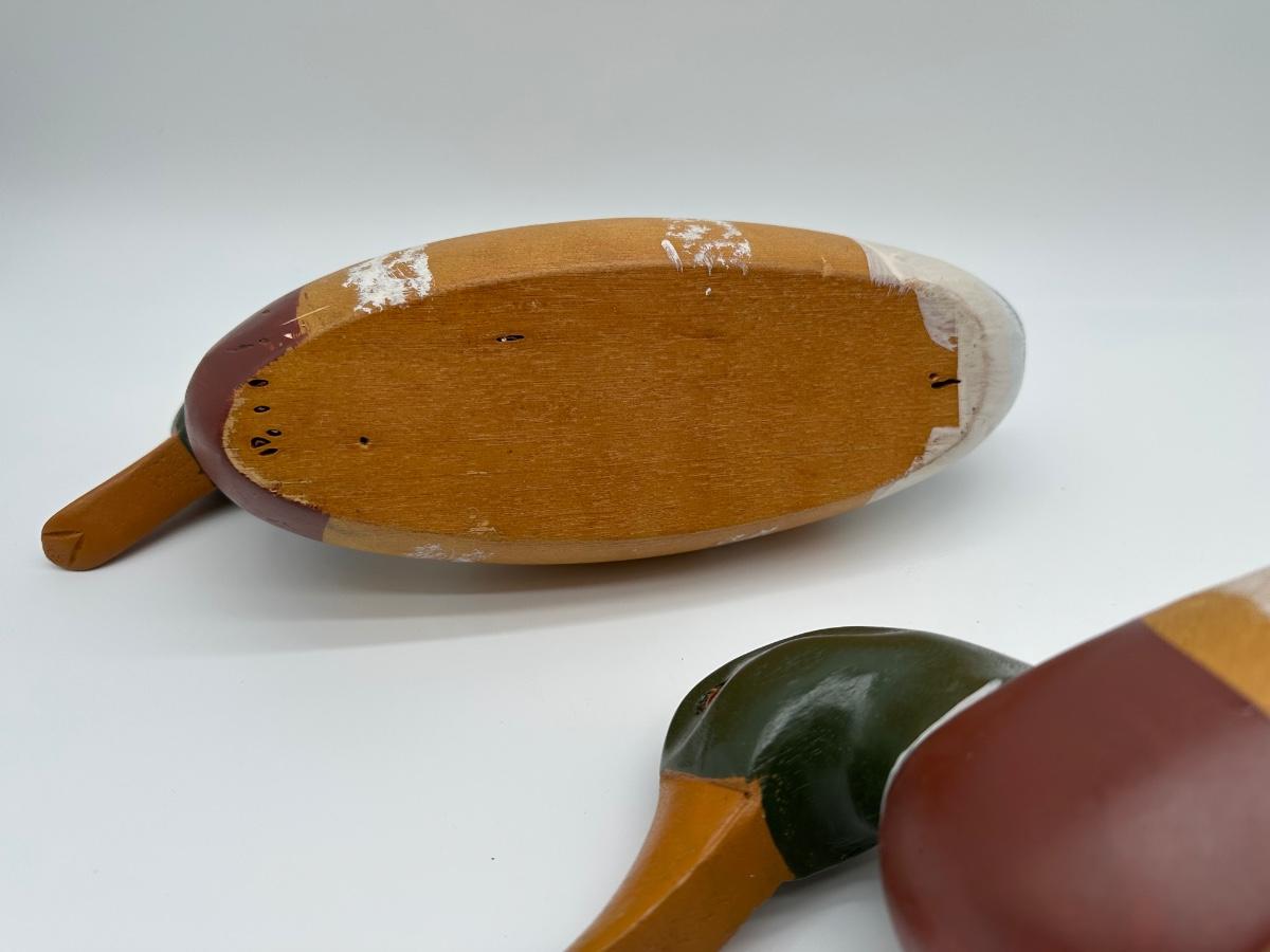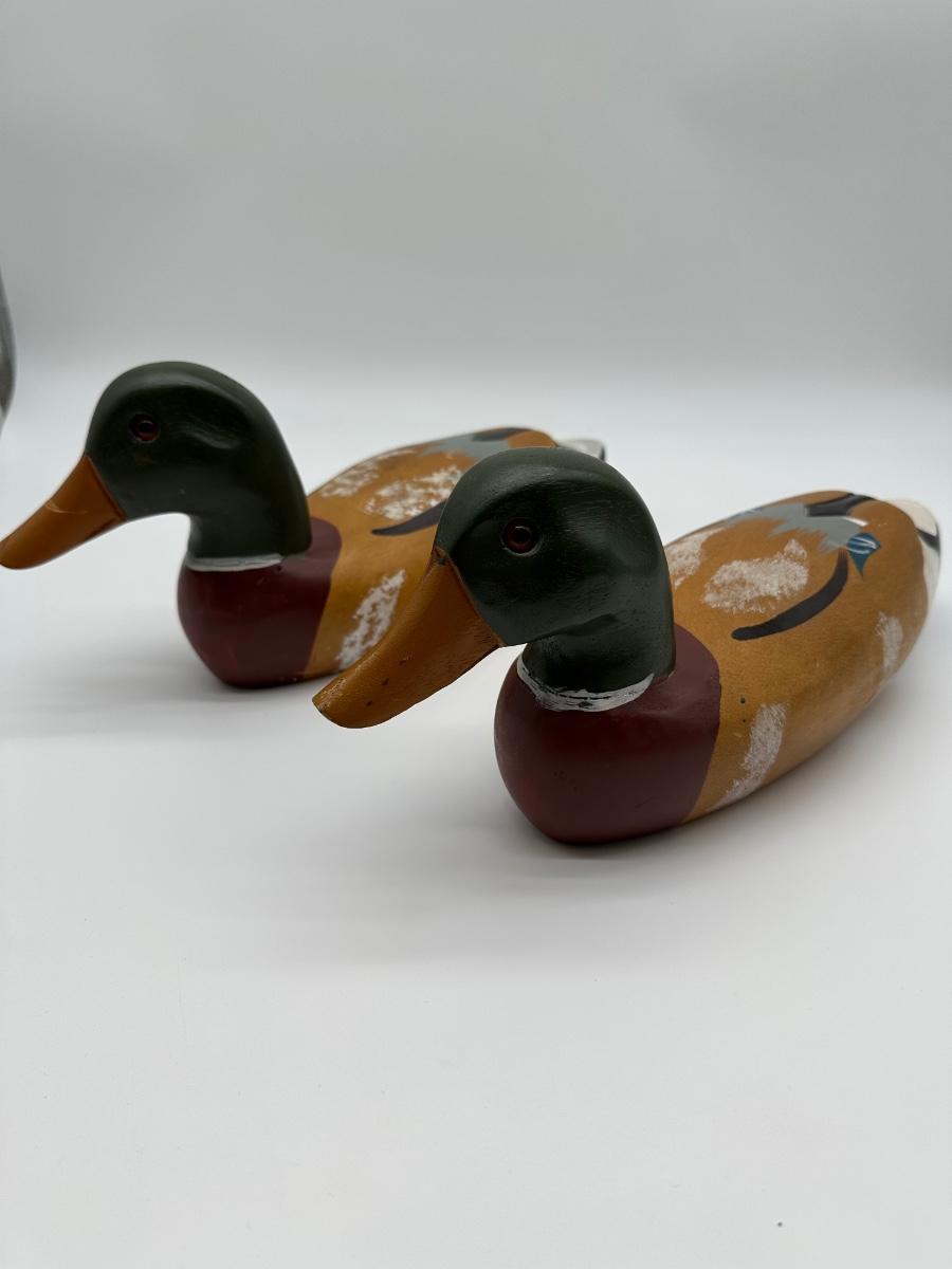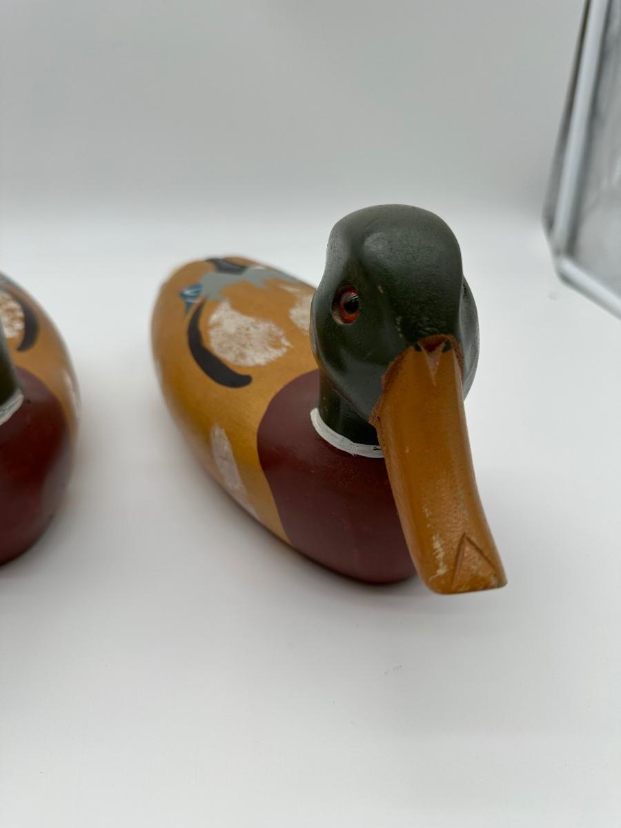 Pair of vintage hand-carved wooden mallard duck decoys with classic painted details. Solid wood construction with traditional form and character. Great for rustic cabin décor, lodge display, folk art / hunting collectible use.