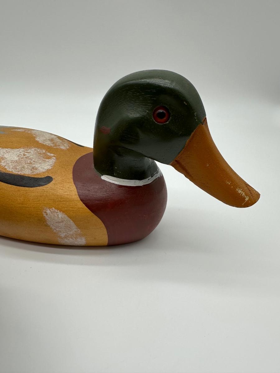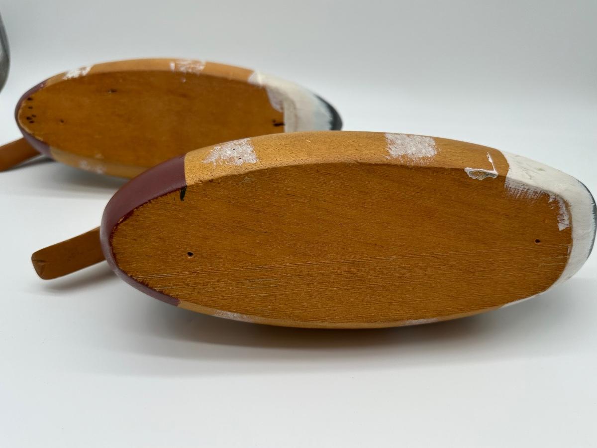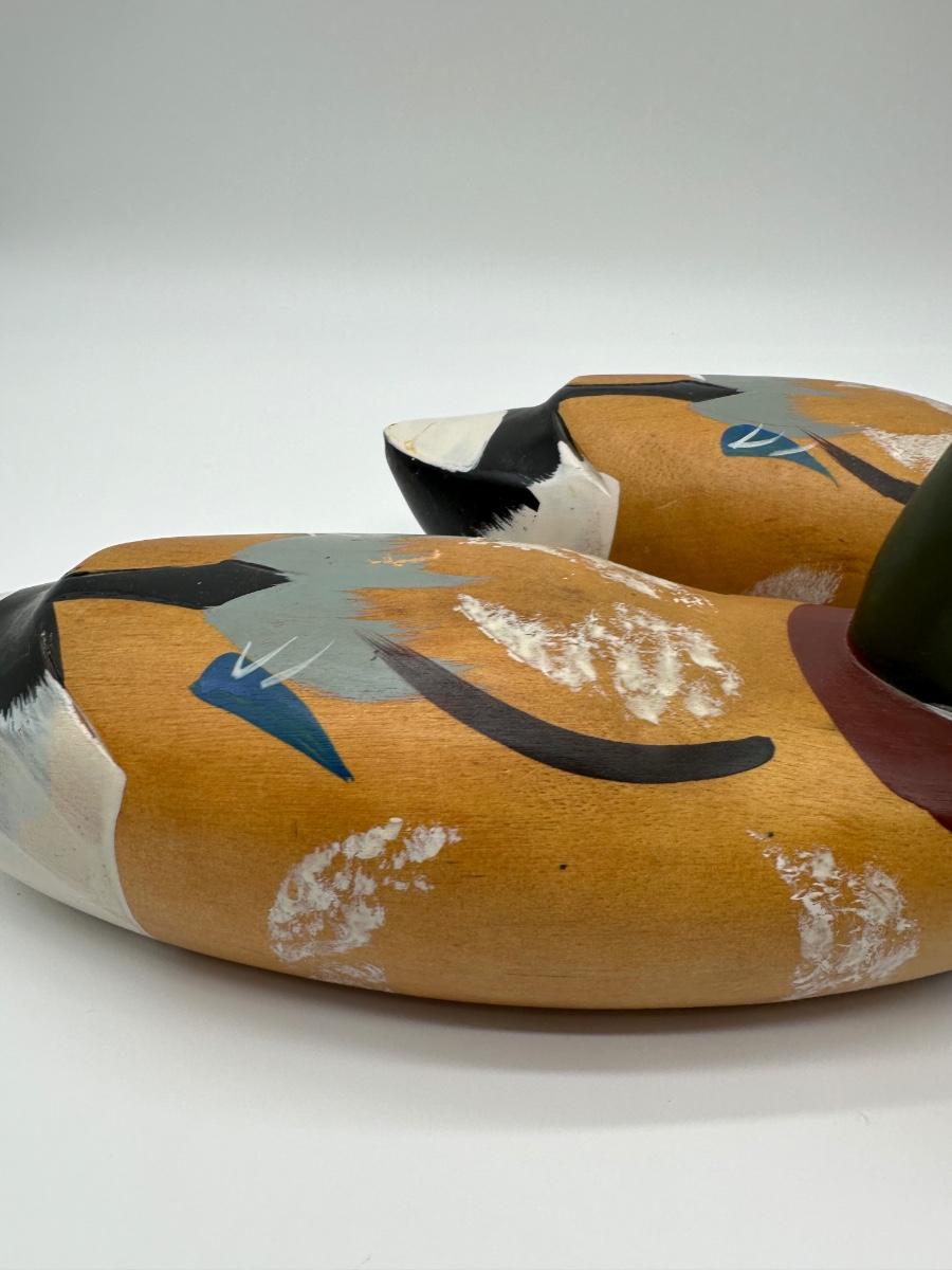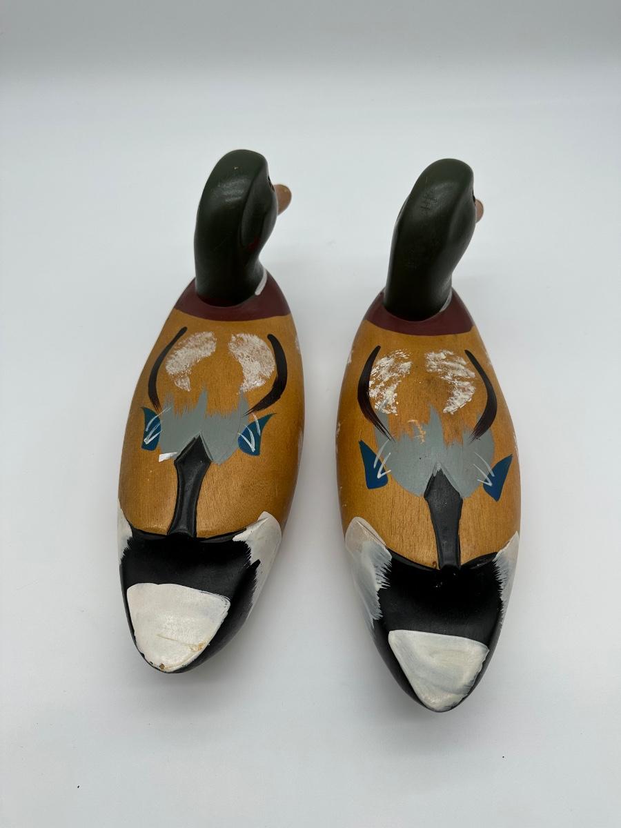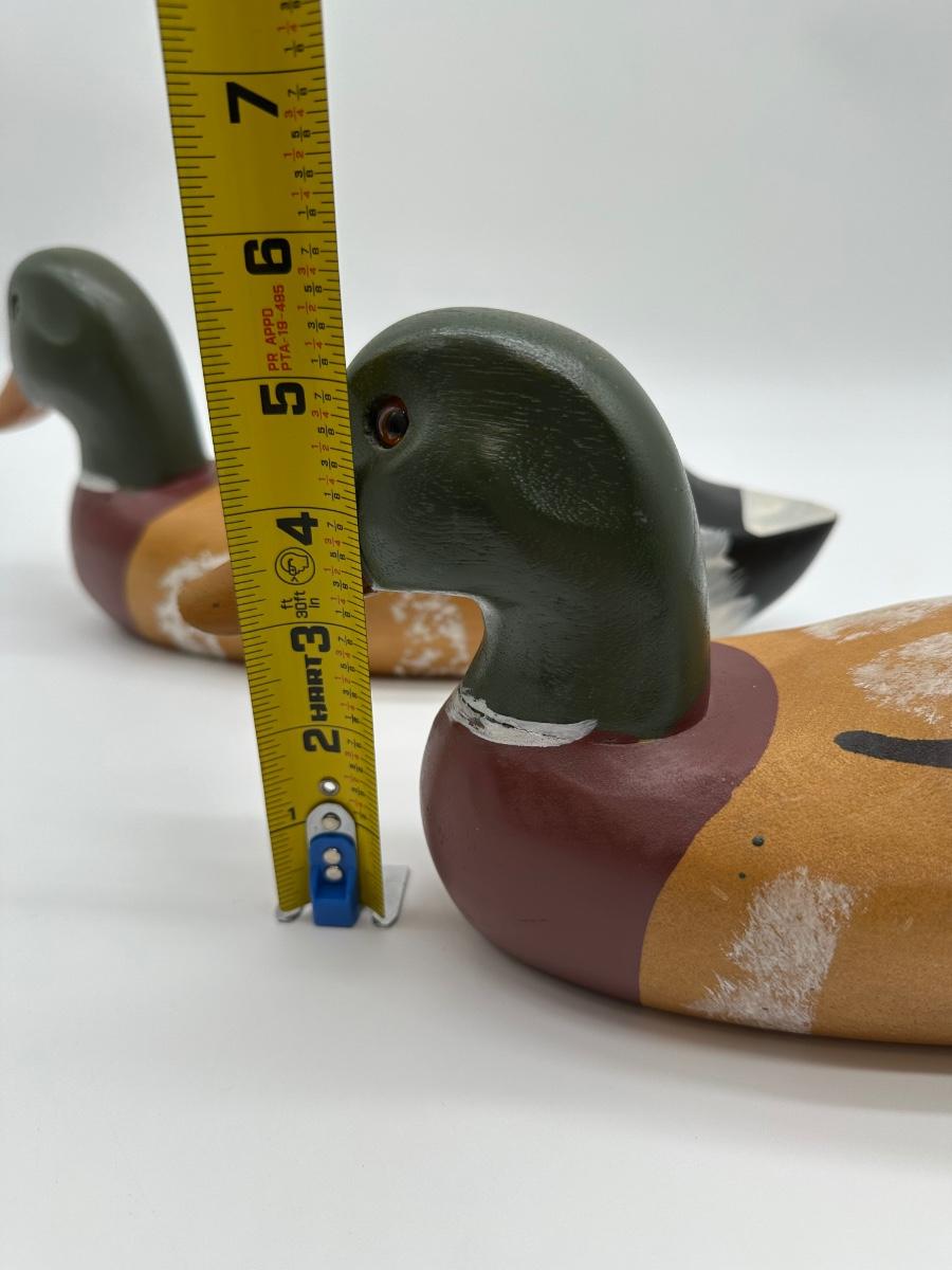 Pair of vintage hand-carved wooden mallard duck decoys with classic painted details. Solid wood construction with traditional form and character. Great for rustic cabin décor, lodge display, folk art / hunting collectible use.