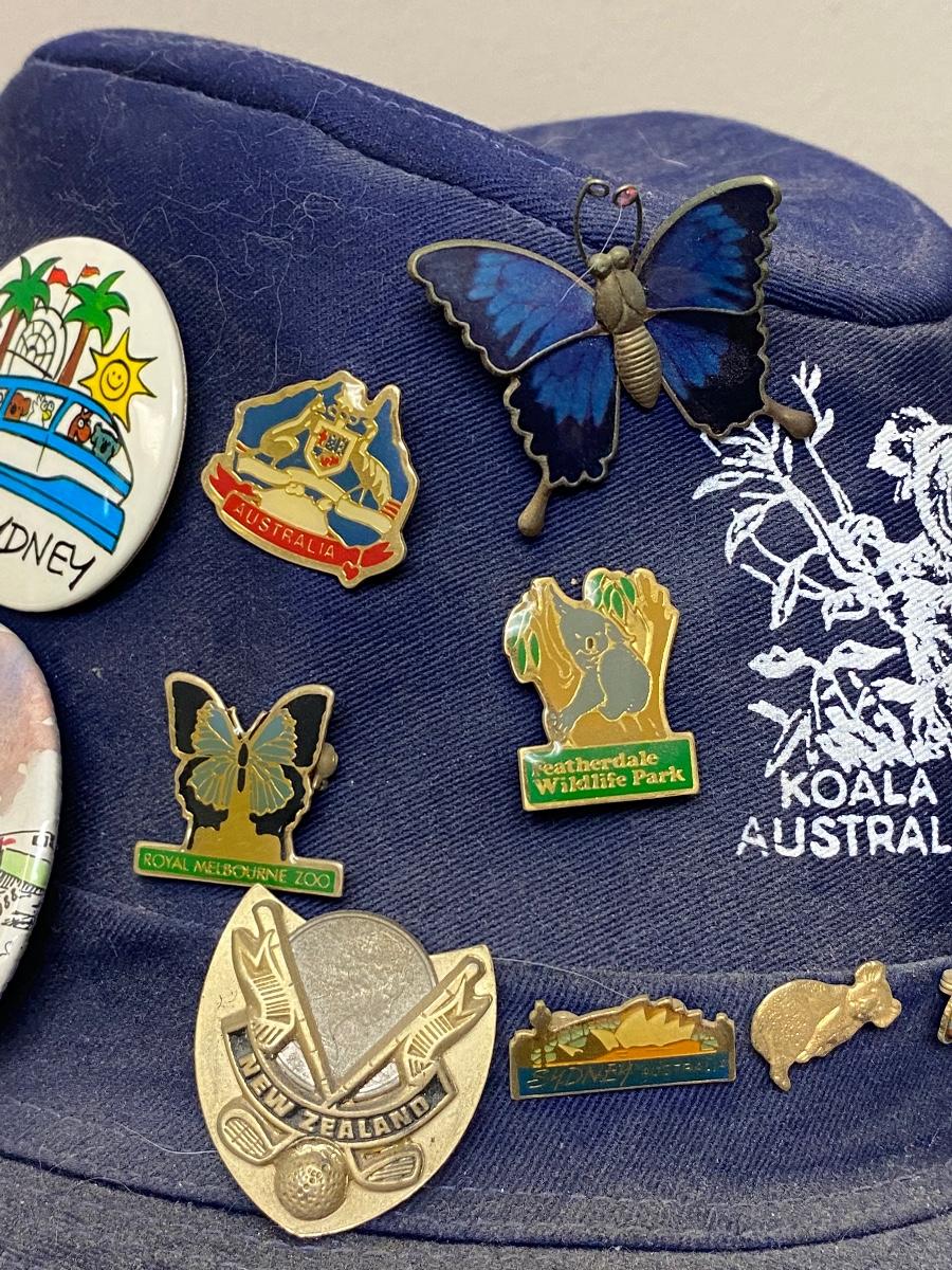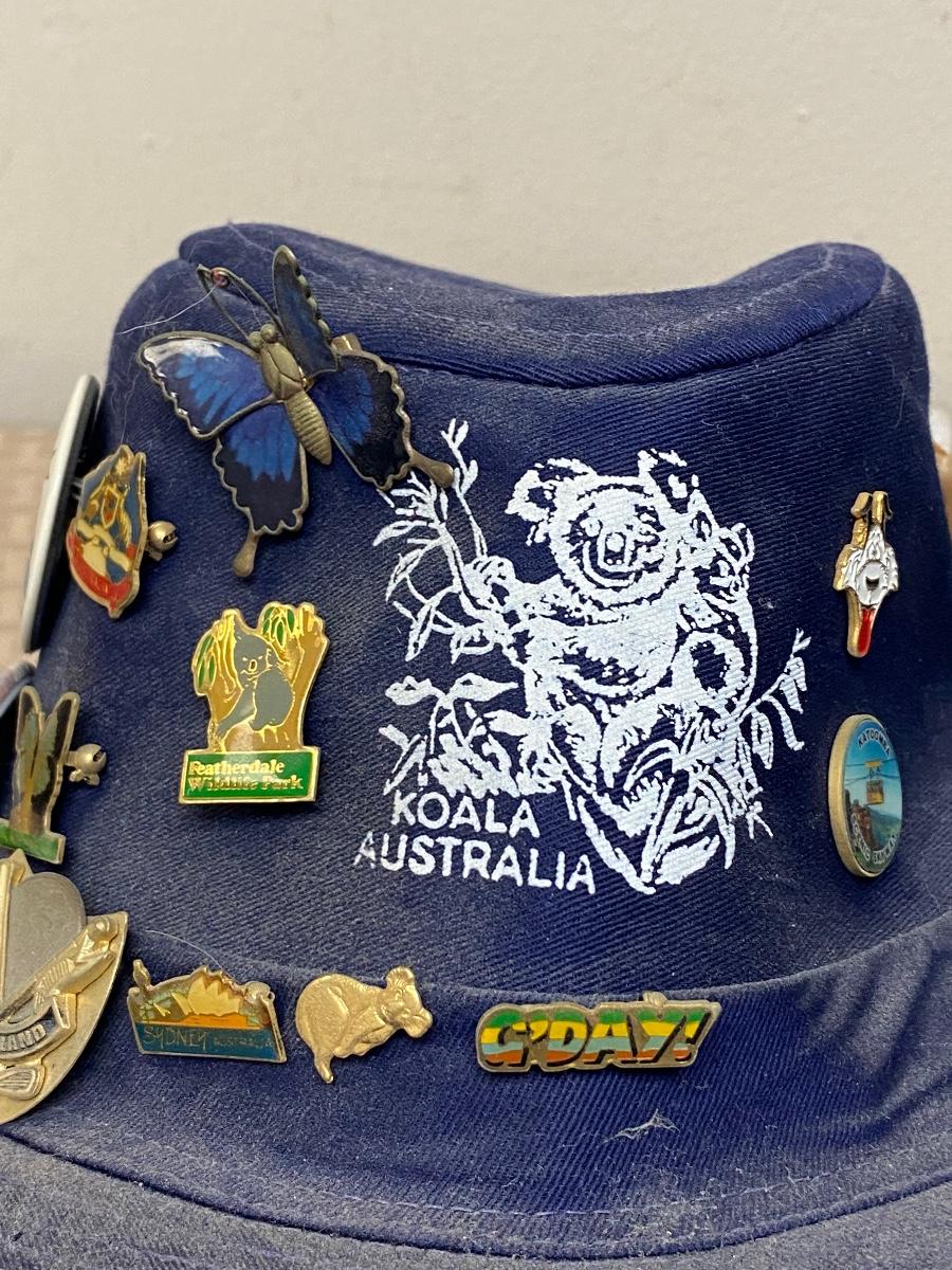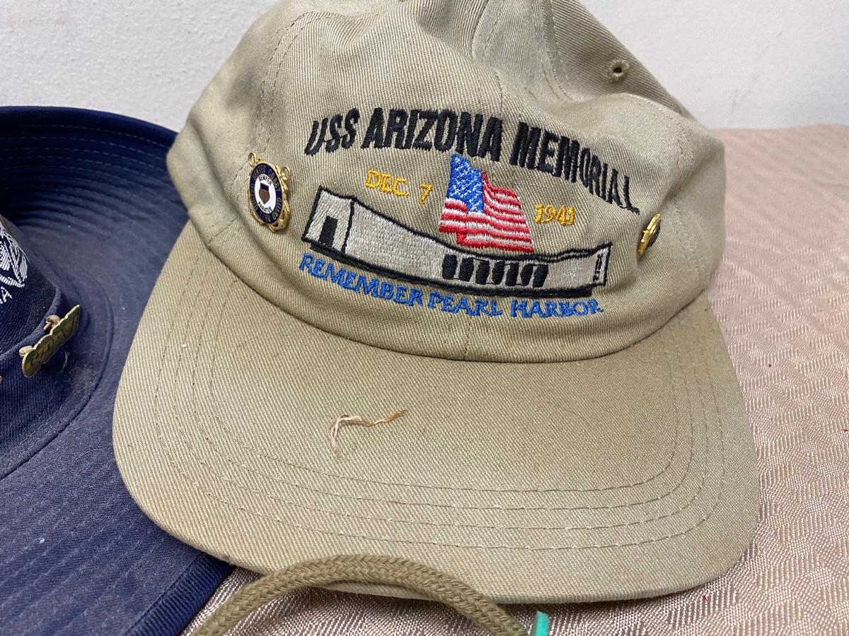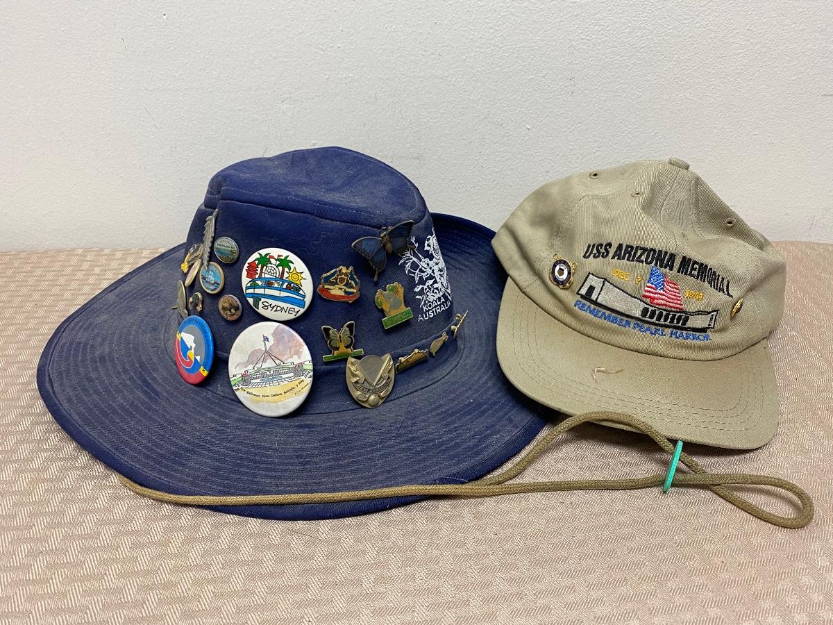 Pair of vintage hats with buttons and pins. USS Arizona ball cap has a couple pins, one from American Legion one from the Coast Guard. The other hat looks to be an Australian vacation souvenir hat with random souvenir pins. Both hats are dusty.
