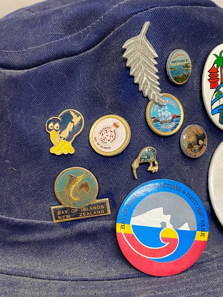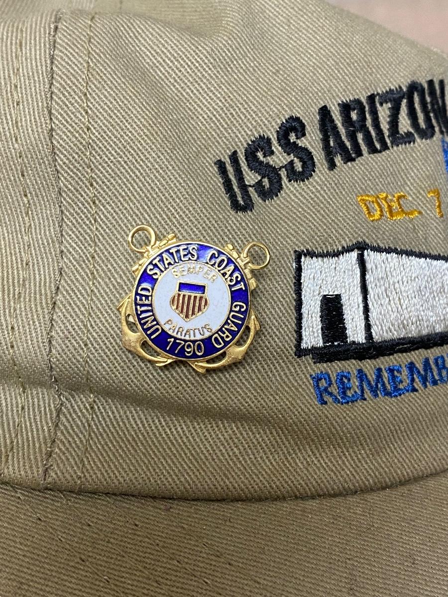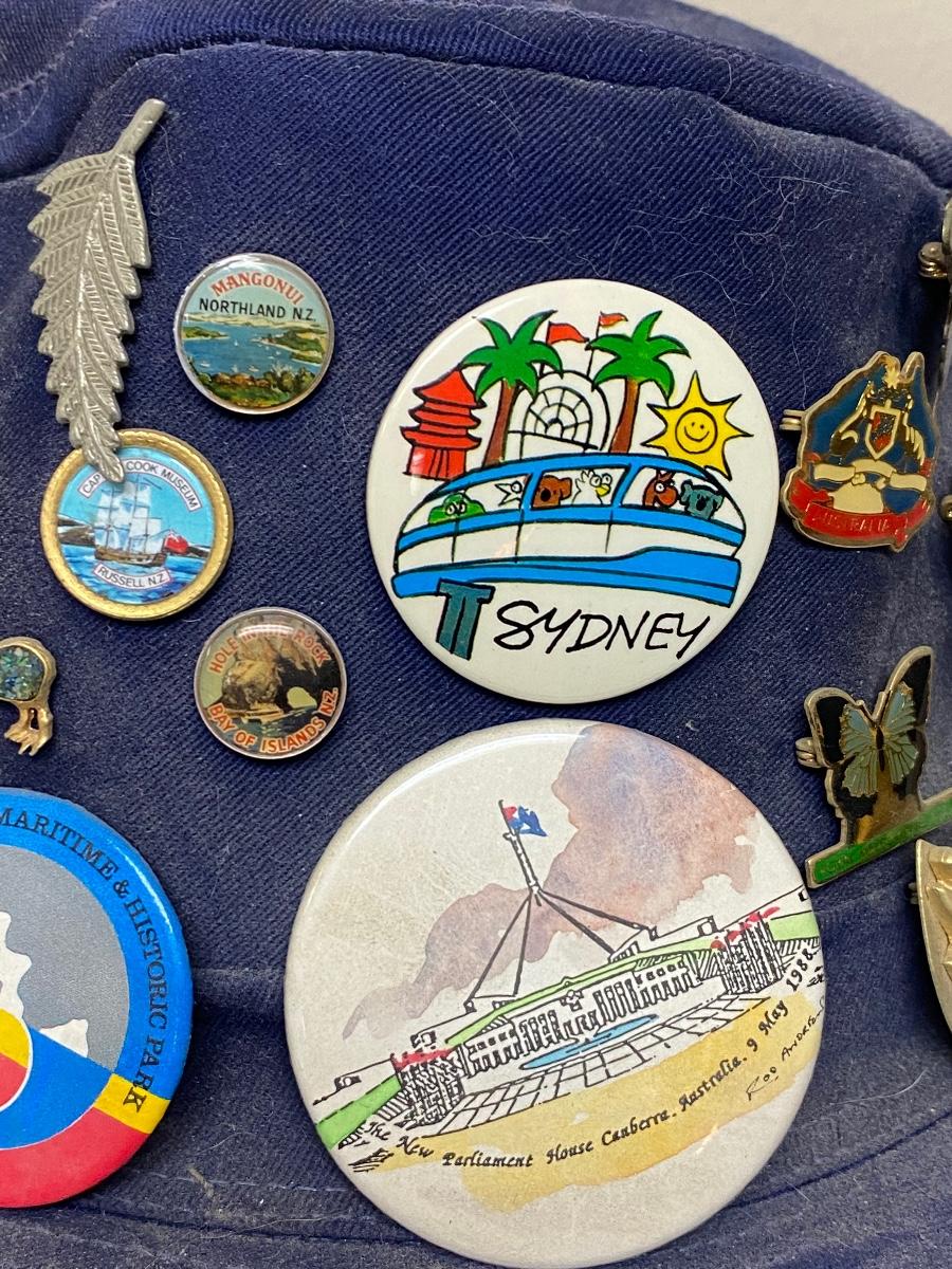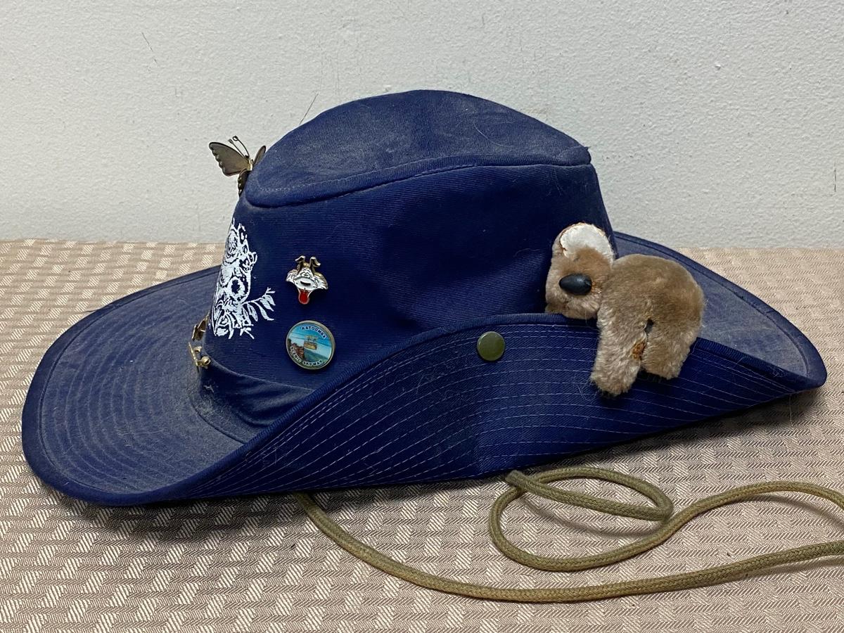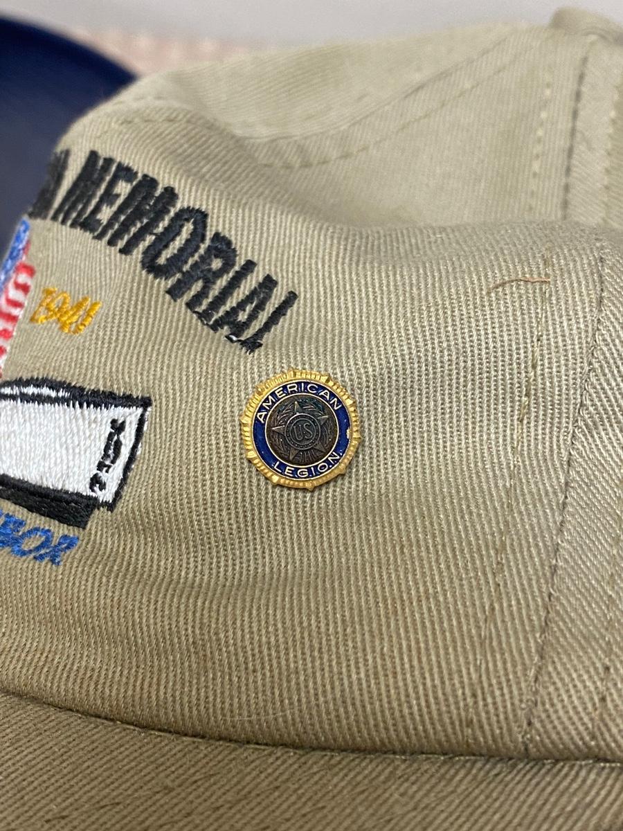 Pair of vintage hats with buttons and pins. USS Arizona ball cap has a couple pins, one from American Legion one from the Coast Guard. The other hat looks to be an Australian vacation souvenir hat with random souvenir pins. Both hats are dusty.