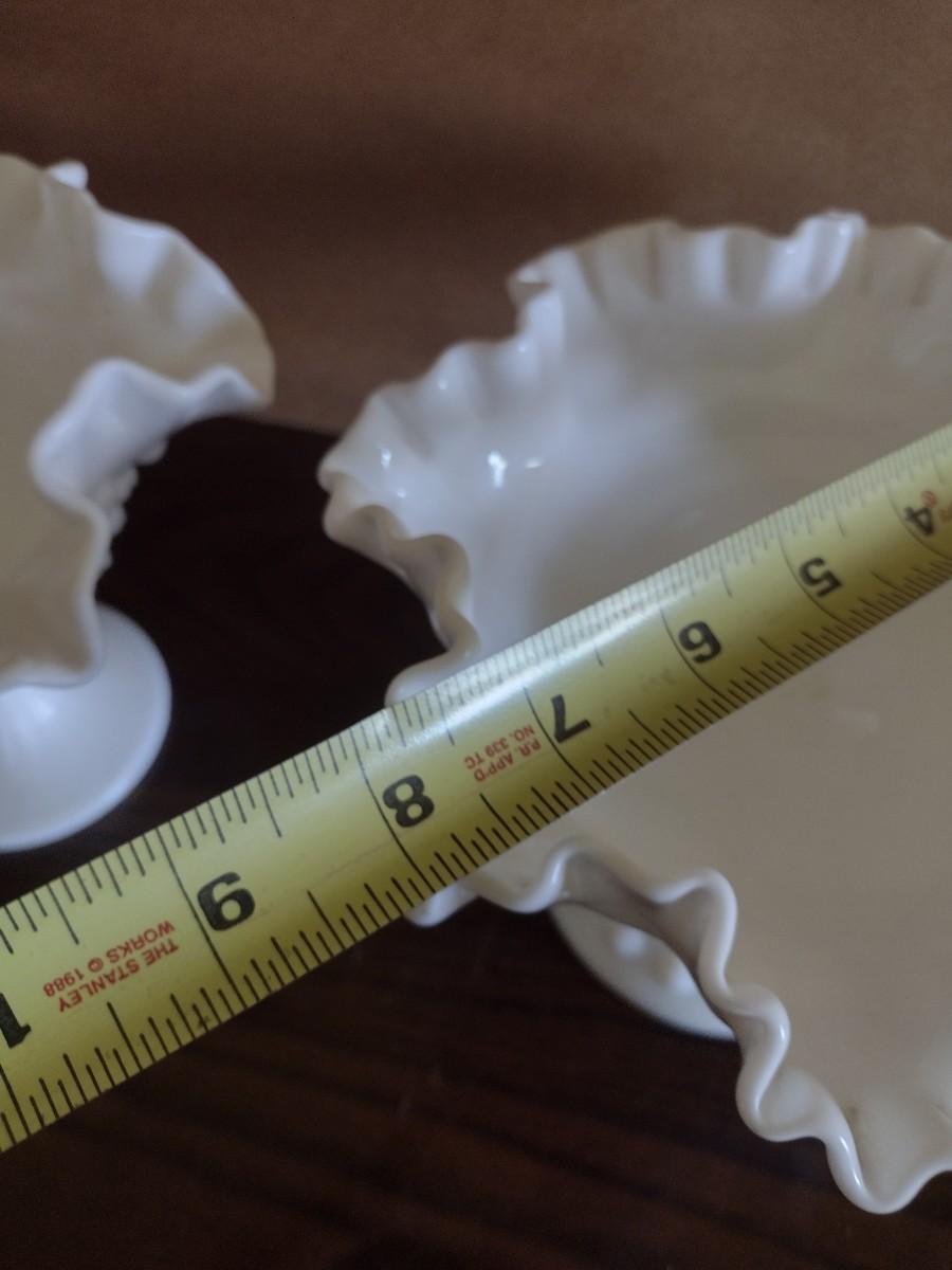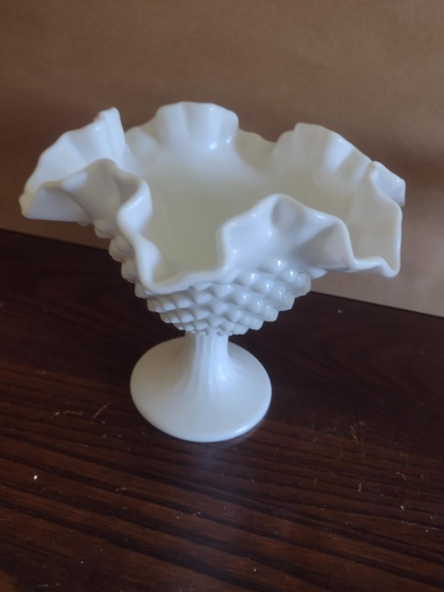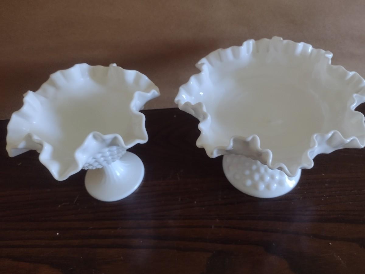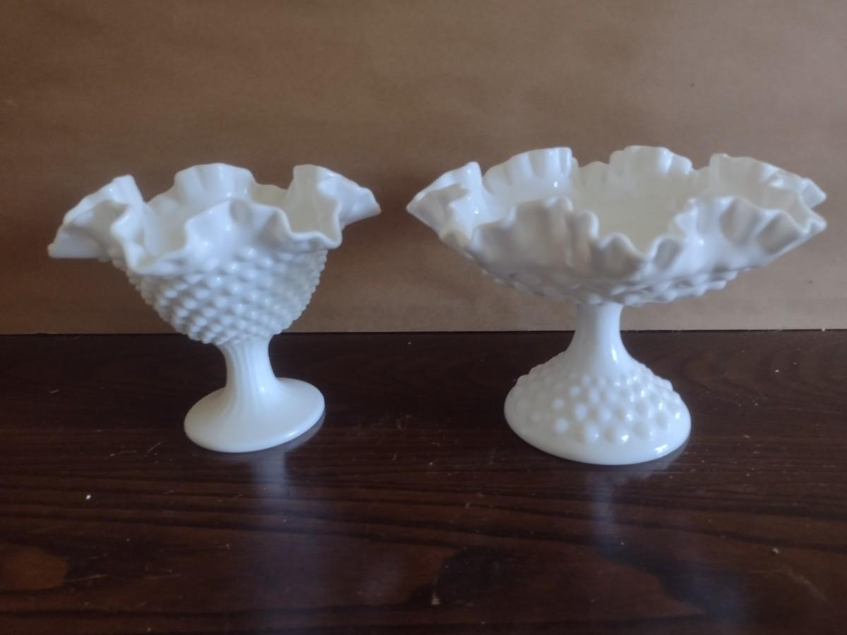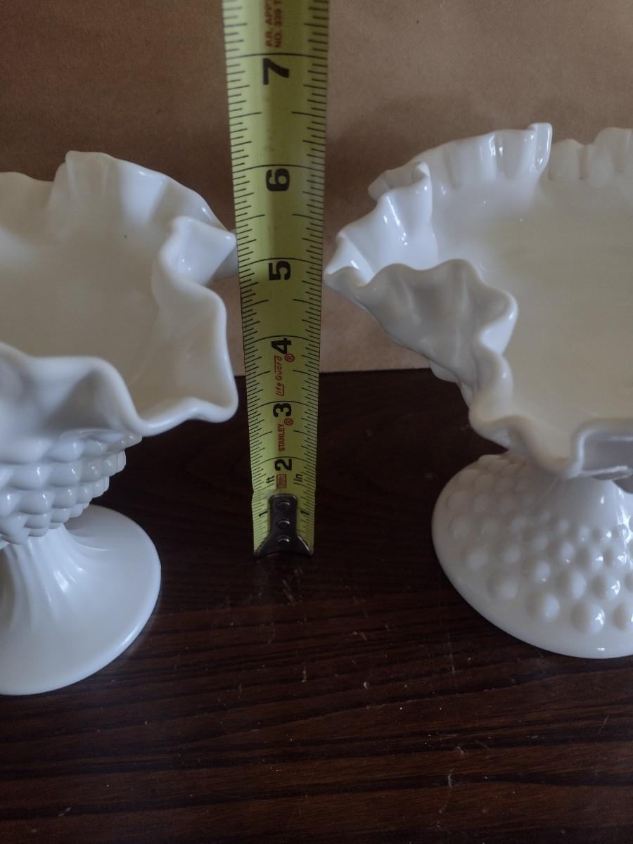 Pair of Vintage Hobnail Milk Glass Ruffled Edge Pedestal Compote Dishes