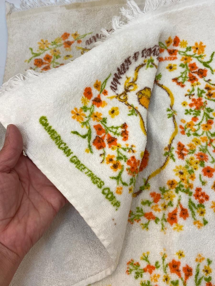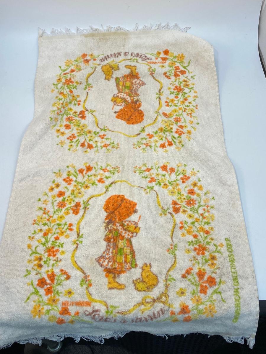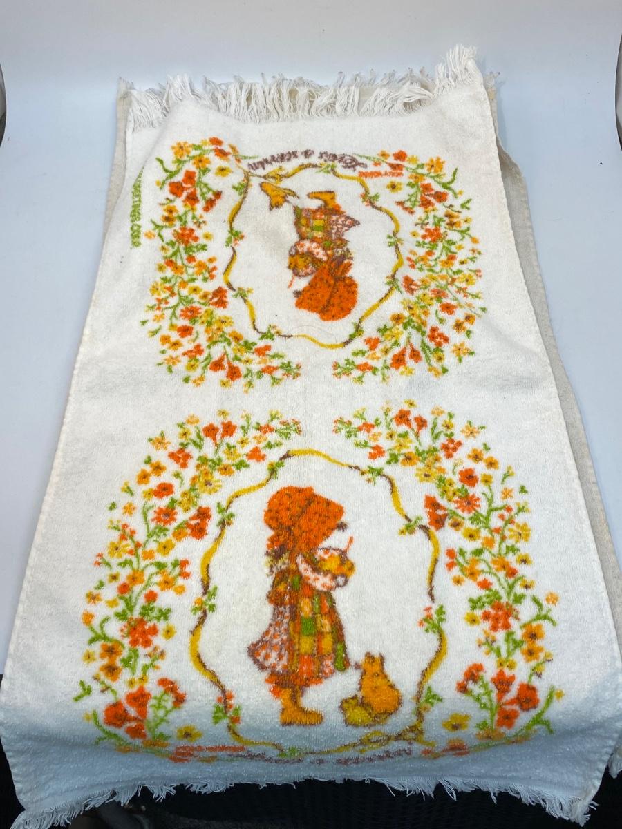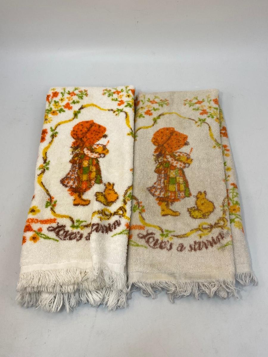 Pair of Vintage Holly Hobbie Kitchen Hand Dish Towels. One was used more than the other, the brighter one almost looks unused. Made by Cannon. The discolor is not as noticeable when the towels are not together but still shows signs of use.