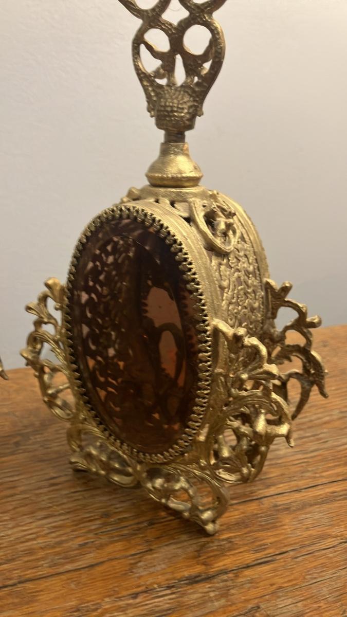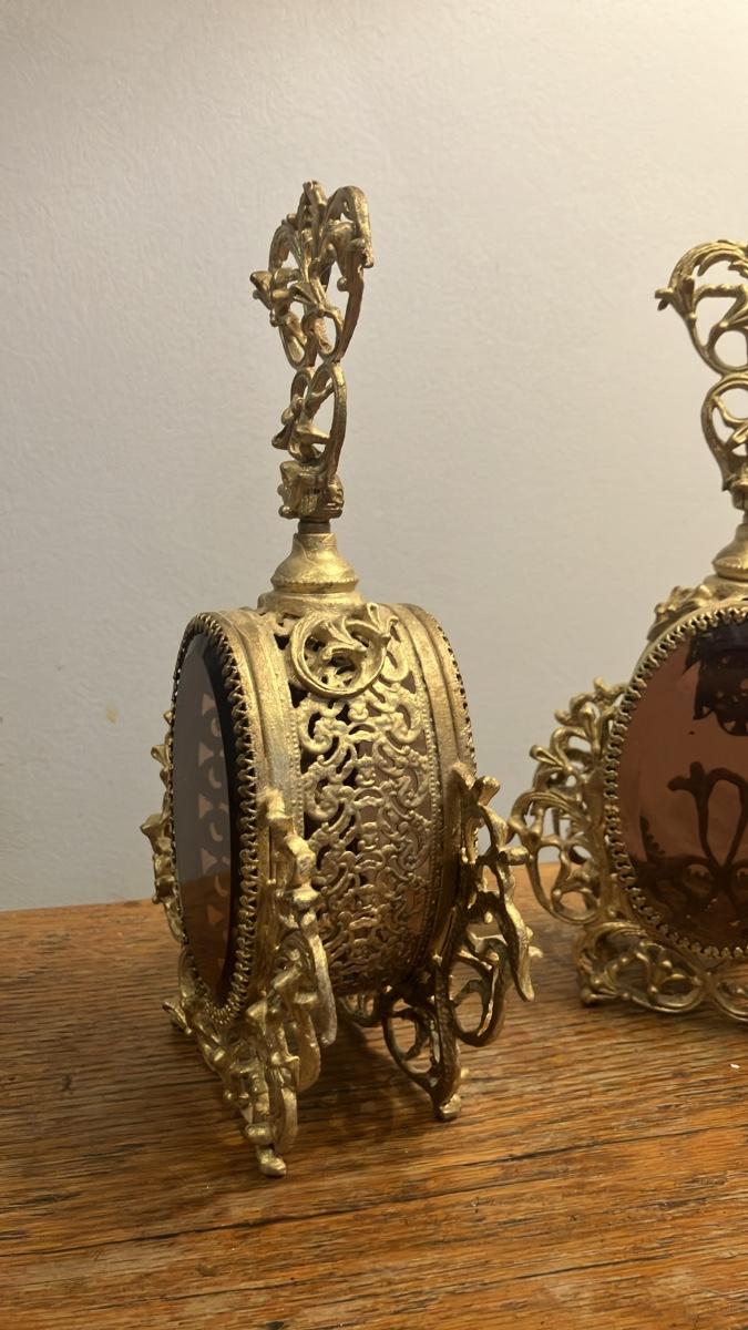 Stunning pair of vintage ornate perfume bottles in the classic Hollywood Regency style, featuring intricate gold-painted (gilt ormolu-style) filigree metalwork surrounding beveled amber glass panels on both sides. Each bottle has an elaborate crowned stopper with floral and scroll motifs, standing approximately 9 inches tall and 5 inches wide.