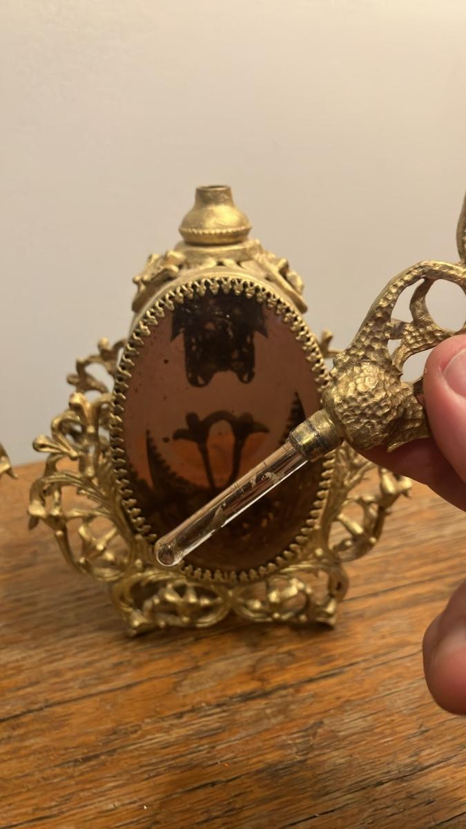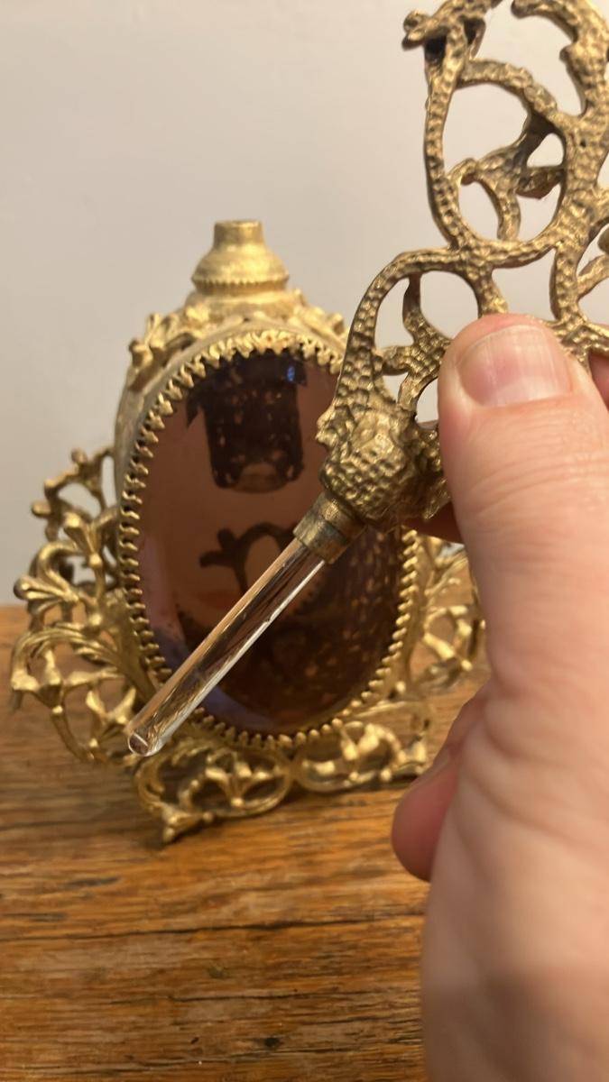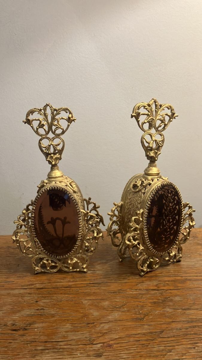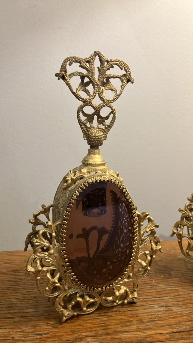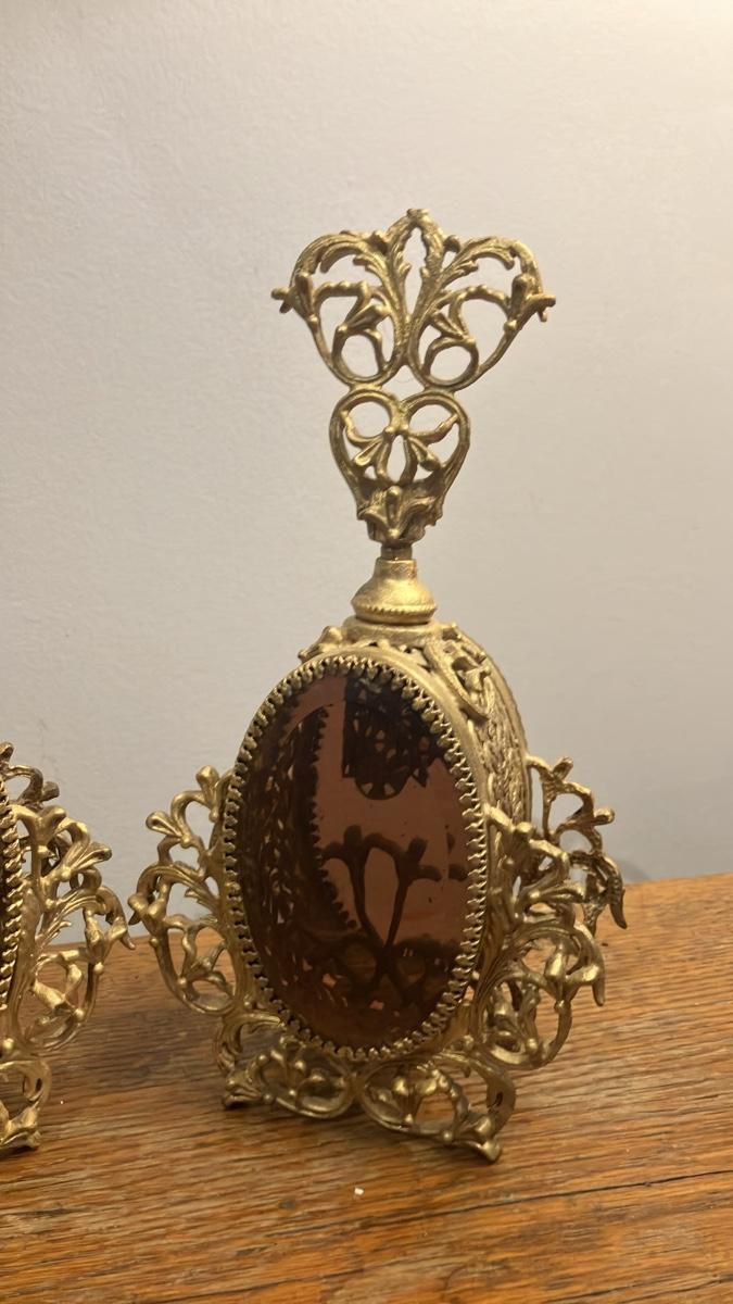 Pair of Vintage Hollywood Regency Ormolu Filigree Perfume Bottles - Gilded Gold