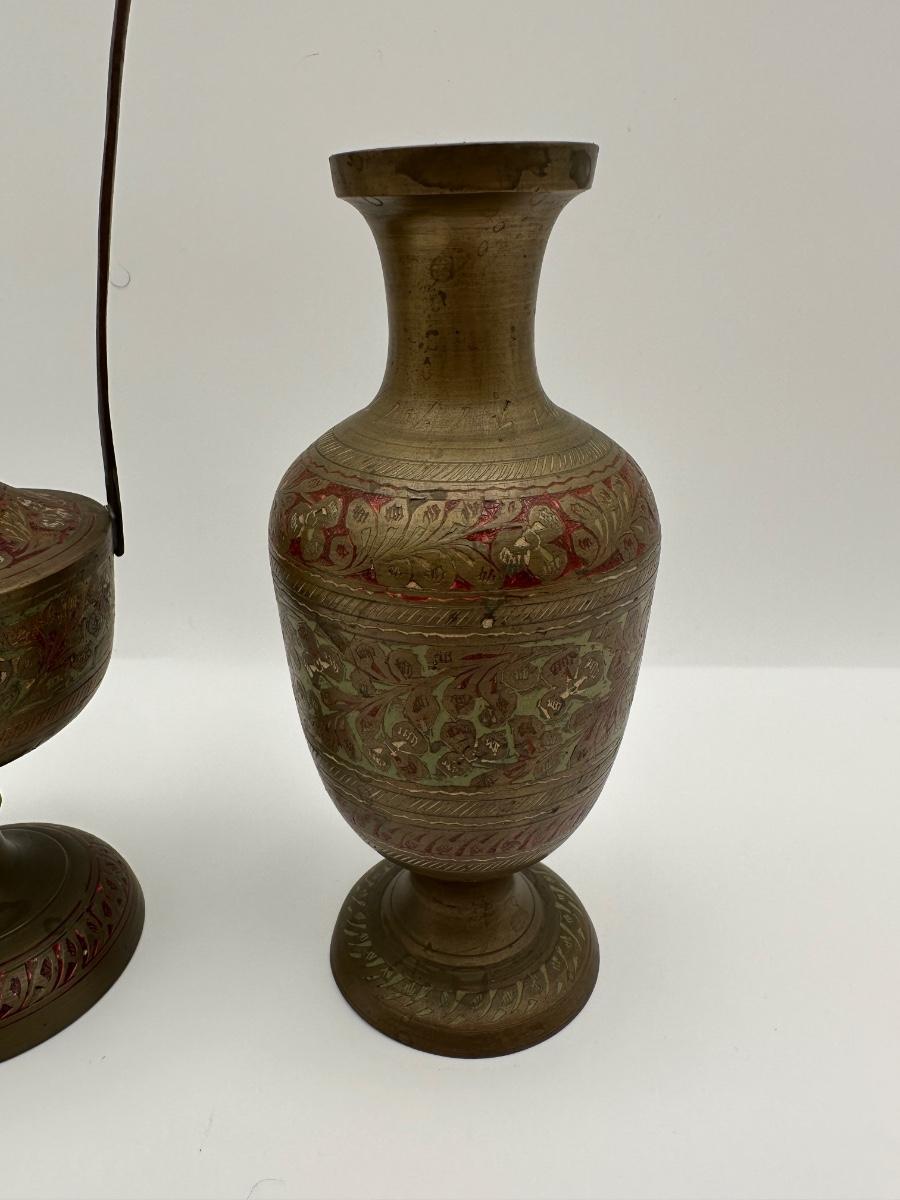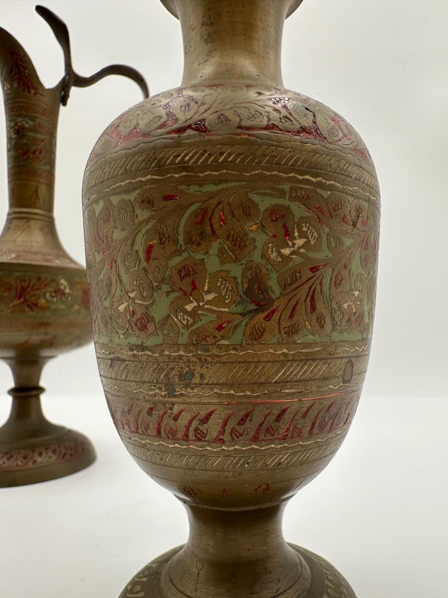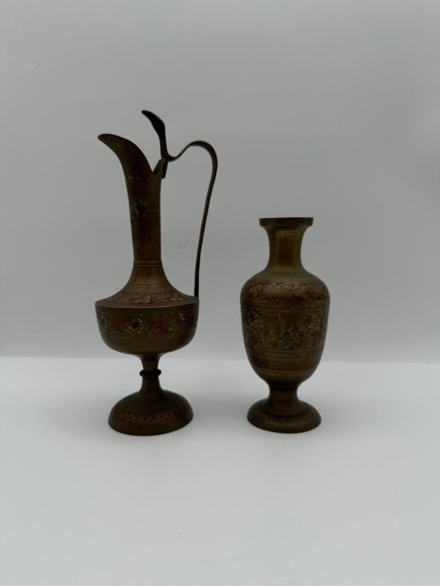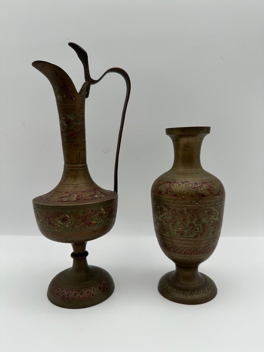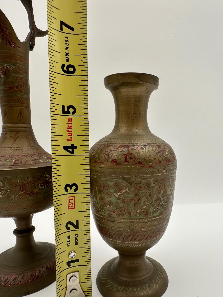 Pair of Vintage Indian Etched & Enameled Brass Vase and Ewer – Made in India